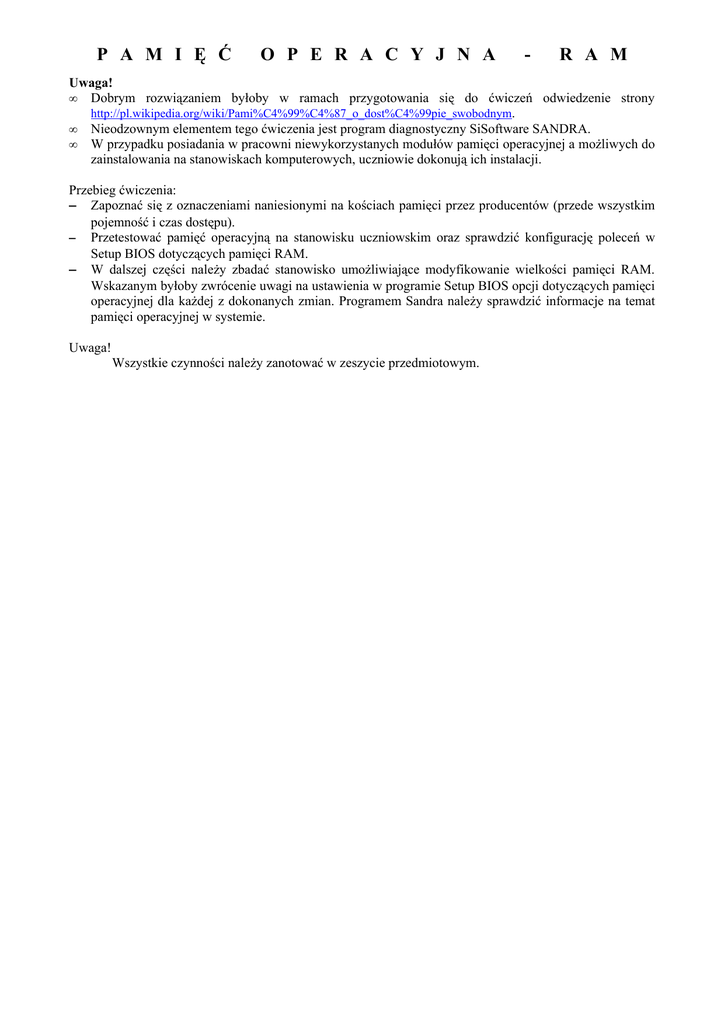 P A M I Ę Ć O P E R A C Y J N A - R A M Uwaga! • Dobrym rozwiązaniem byłoby w ramach przygotowania się do ćwiczeń odwiedzenie strony http://pl.wikipedia.org/wiki/Pami%C4%99%C4%87_o_dost%C4%99pie_swobodnym. • Nieodzownym elementem tego ćwiczenia jest program diagnostyczny SiSoftware SANDRA. • W przypadku posiadania w pracowni niewykorzystanych modułów pamięci operacyjnej a możliwych do zainstalowania na stanowiskach komputerowych, uczniowie dokonują ich instalacji. Przebieg ćwiczenia: – Zapoznać się z oznaczeniami naniesionymi na kościach pamięci przez producentów (przede wszystkim pojemność i czas dostępu). – Przetestować pamięć operacyjną na stanowisku uczniowskim oraz sprawdzić konfigurację poleceń w Setup BIOS dotyczących pamięci RAM. – W dalszej części należy zbadać stanowisko umożliwiające modyfikowanie wielkości pamięci RAM. Wskazanym byłoby zwrócenie uwagi na ustawienia w programie Setup BIOS opcji dotyczących pamięci operacyjnej dla każdej z dokonanych zmian. Programem Sandra należy sprawdzić informacje na temat pamięci operacyjnej w systemie. Uwaga! Wszystkie czynności należy zanotować w zeszycie przedmiotowym.
