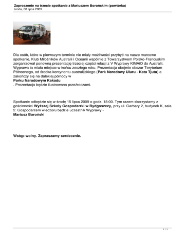 Zaproszenie na trzecie spotkanie z Mariuszem Borońskim (powtórka) środa, 08 lipca 2009 Dla osób, które w pierwszym terminie nie miały możliwości przybyć na nasze marcowe spotkanie, Klub Miłośników Australii i Oceanii wspólnie z Towarzystwem Polsko-Francuskim zorganizował ponowną prezentację trzeciej części relacji z V Wyprawy KlMAiO do Australii. Wyprawa ta miała miejsce w końcu zeszłego roku. Prezentacja obejmie obszar Terytorium Północnego, od środka kontynentu australijskiego (Park Narodowy Uluru - Kata Tjuta) a zakończy się na dalekiej północy w Parku Narodowym Kakadu . Prezentacja będzie ilustrowana przeźroczami. Spotkanie odbędzie się w środę 15 lipca 2009 o godz. 18:00. Tym razem skorzystamy z gościnności Wyższej Szkoły Gospodarrki w Bydgoszczy, przy ul. Garbary 2, budynek K, sala 2. Gospodarzem wieczoru będzie uczestnik Wyprawy Mariusz Boroński . Wstęp wolny. Zapraszamy serdecznie. 1/1