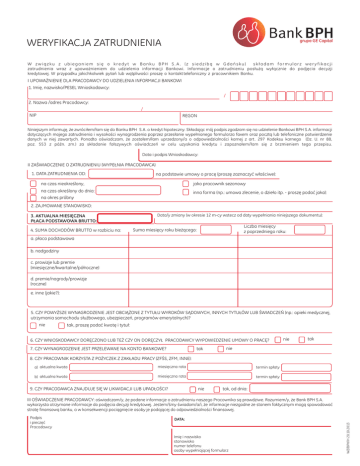 WERYFIKACJA ZATRUDNIENIA W zwi¹zku z ubieganiem siê o kredyt w Banku BPH S. A . (z siedzib¹ w Gdañsku) sk³adam formularz weryfikacji zatrudnienia wraz z upowa¿nieniem do udzielenia informacji Bankowi. Informacje o zatrudnieniu pos³u¿¹ wy³¹cznie do podjêcia decyzji kredytowej. W przypadku jakichkolwiek pytañ lub w¹tpliwoœci proszê o kontakt telefoniczny z pracownikiem Banku. I UPOWA¯NIENIE DLA PRACODAWCY DO UDZIELENIA INFORMACJI BANKOWI 1. Imiê, nazwisko/PESEL Wnioskodawcy: / 2. Nazwa /adres Pracodawcy: / NIP REGON Niniejszym informujê, ¿e zwróci³em/³am siê do Banku BPH S.A. o kredyt hipoteczny. Sk³adaj¹c mój podpis zgadzam siê na udzielenie Bankowi BPH S.A. informacji dotycz¹cych mojego zatrudnienia i wysokoœci wynagrodzenia poprzez przes³anie wype³nionego formularza faxem oraz poczt¹ lub telefoniczne potwierdzenie danych w niej zawartych. Ponadto oœwiadczam, ¿e zosta³em/³am uprzedzony/a o odpowiedzialnoœci karnej z art. 297 Kodeksu karnego (Dz. U. nr 88, poz. 553 z póŸn. zm.) za sk³adanie fa³szywych oœwiadczeñ w celu uzyskania kredytu i zapozna³em/³am siê z brzmieniem tego przepisu. Data i podpis Wnioskodawcy: II ZAŒWIADCZENIE O ZATRUDNIENIU (WYPE£NIA PRACODAWCA) 1. DATA ZATRUDNIENIA OD: na podstawie umowy o pracê (proszê zaznaczyæ w³aœciwe): na czas nieokreœlony, jako pracownik sezonowy na czas okreœlony do dnia: inna forma (np.: umowa zlecenie, o dzie³o itp. - proszê podaæ jaka): na okres próbny 2. ZAJMOWANE STANOWISKO: 3. AKTUALNA MIESIÊCZNA P£ACA PODSTAWOWA BRUTTO: 4. SUMA DOCHODÓW BRUTTO w rozbiciu na: Data/y zmiany (w okresie 12 m-cy wstecz od daty wype³niania niniejszego dokumentu): Liczba miesiêcy z poprzedniego roku: Suma miesiêcy roku bie¿¹cego: a. p³aca podstawowa b. nadgodziny c. prowizje lub premie (miesiêczne/kwartalne/pó³roczne) d. premie/nagrody/prowizje (roczne) e. inne (jakie?): 5. CZY POWY¯SZE WYNAGRODZENIE JEST OBCI¥¯ONE Z TYTU£U WYROKÓW S¥DOWYCH, INNYCH TYTU£ÓW LUB ŒWIADCZEÑ (np.: opieki medycznej, utrzymania samochodu s³u¿bowego, ubezpieczeñ, programów emerytalnych)? nie tak, proszê podaæ kwotê i tytu³: 6. CZY WNIOSKODAWCY DORÊCZONO LUB TE¯ CZY ON DORÊCZY£ PRACODAWCY WYPOWIEDZENIE UMOWY O PRACÊ? 7. CZY WYNAGRODZENIE JEST PRZELEWANE NA KONTO BANKOWE? tak nie tak nie 8. CZY PRACOWNIK KORZYSTA Z PO¯YCZEK Z ZAK£ADU PRACY (ZFŒS, ZFM, INNE): a) aktualna kwota miesiêczna rata termin sp³aty b) aktualna kwota miesiêczna rata termin sp³aty 9. CZY PRACODAWCA ZNAJDUJE SIÊ W LIKWIDACJI LUB UPAD£OŒCI? nie tak, od dnia: III OŒWIADCZENIE PRACODAWCY: oœwiadczam/y, ¿e podane informacje o zatrudnieniu naszego Pracownika s¹ prawdziwe. Rozumiem/y, ¿e Bank BPH S.A. wykorzysta otrzymane informacje do podjêcia decyzji kredytowej. Jestem/œmy œwiadom/a/i, ¿e informacje niezgodne ze stanem faktycznym mog¹ spowodowaæ stratê finansow¹ banku, a w konsekwencji poci¹gniêcie osoby je podaj¹cej do odpowiedzialnoœci finansowej. DATA: Imiê i nazwisko stanowisko numer telefonu osoby wype³niaj¹cej formularz WZ/BPH/H 20.10.2013 Podpis i pieczêæ Pracodawcy