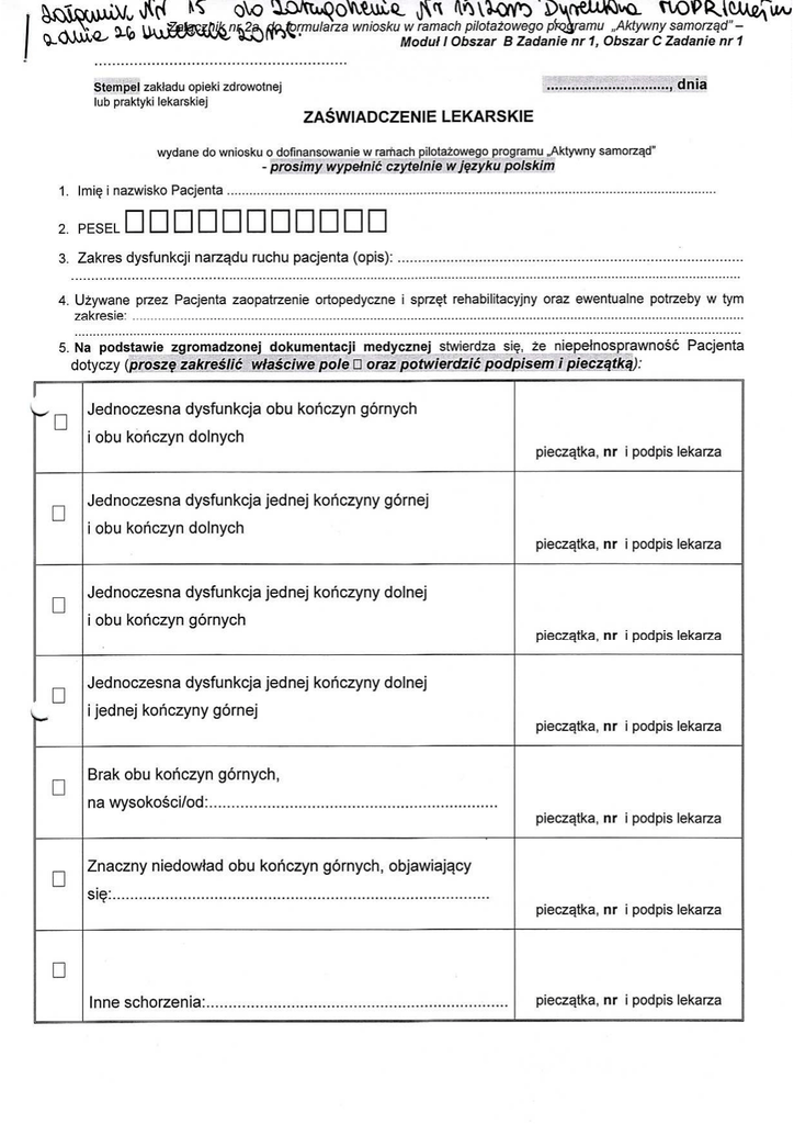 Str. 2 załącznika nr 2a do formularza wniosku – dotyczy formularzy wniosków – Moduł I Obszar C Zadanie nr 1 6. Ponadto (pole obowiązkowe w przypadku Pacjenta ubiegającego się o dofinansowanie w ramach obszaru C programu) - na podstawie zgromadzonej dokumentacji medycznej stwierdza się, że: proszę zakreślić właściwe pola 1. Pacjent może poruszać się na wózku inwalidzkim o napędzie ręcznym: £ tak £ nie 2. Korzystanie z wózka o napędzie elektrycznym jest niewskazane, gdyż może spowodować wstrzymanie lub pogorszenie procesu rehabilitacji lub wpłynie niekorzystnie na sprawność kończyn górnych: £ tak £ nie 3. Przeciwwskazania do korzystania z wózka o napędzie elektrycznym (np. utraty przytomności, epilepsja): ….………………………….................................................................. ...................................................................................................... £ brak przeciwwskazań 4. Czy są przeciwwskazania do korzystania z wózka o napędzie elektrycznym typu skuter? £ tak £ nie Jeśli tak, to jakie: ………………………………………………………………………......... pieczątka, nr i podpis 55. Zakres i rodzaj ograniczeń stanowi poważne utrudnienie w samodzielnym funkcjonowaniu osoby niepełnosprawnej: £ tak £ nie lekarza Dotyczy wyłącznie Wnioskodawców ubiegających się o zwiększenie kwoty dofinansowania na zakup wózka inwalidzkiego o napędzie elektrycznym Pacjent z uwagi na ograniczenia funkcjonalne, stan i zakres dysfunkcji narządu ruchu powodującej niepełnosprawność wymaga zakupu wózka inwalidzkiego o napędzie elektrycznym z ponadstandardowym wyposażeniem, w tym: (proszę zakreślić właściwe pola ) niestandardowe sterowniki umożliwiające sterowanie wózkiem za pomocą jedynie władnych części ciała jak np.: ręki, palca, brody, stopy, warg lub wdechu i wydechu powietrza itp. urządzenia umożliwiające prowadzenie wózka także przez osobę towarzyszącą (hamulec, sterownik itp.) niestandardowe siedzisko (np. z windą podnoszącą, rehabilitacyjne, zapewniające maksymalną stabilizację, przeciwodleżynowe, itp.) specjalne, regulowane (w tym elektrycznie i w różnych płaszczyznach): podnóżki, podłokietniki lub oparcia nadgarstków kliny zapobiegające zsuwaniu się Pacjenta z wózka lub podpórki boczne, peloty piersiowe zagłówek stabilizujący głowę i szyję (w kształcie litery U) specjalne pasy bezpieczeństwa (np. dwupunktowe zapinane na biodrach, czteropunktowe) taki sposób, aby wózek był indywidualnie dopasowany do sylwetki Pacjenta (np. w przypadku niestandardowego wzrostu czy wagi Pacjenta) inne elementy i urządzenia (np. umożliwiające podłączenia joysticka wózka do komputera i posługiwanie się nim jak myszką), jakie: ........................................, dnia .............. (miejscowość ) (data) ............................................... pieczątka, nr i podpis lekarza Str. 3 załącznika nr 2a do formularza wniosku – dotyczy formularzy wniosków – Moduł I Obszar C Zadanie nr 3 i 4 ......................................................... .............................., dnia Stempel zakładu opieki zdrowotnej lub praktyki lekarskiej ZAŚWIADCZENIE LEKARSKIE wydane do wniosku o dofinansowanie w ramach pilotażowego programu „Aktywny samorząd” - prosimy wypełnić czytelnie w języku polskim 1. Imię i nazwisko Pacjenta ................................................................................................................................. 2. PESEL 3. Stwierdza się, że niepełnosprawność Pacjenta dotyczy (proszę zakreślić właściwe pole oraz potwierdzić podpisem i pieczątką): Amputacja w zakresie ręki pieczątka, nr i podpis lekarza Amputacja w zakresie przedramienia pieczątka, nr i podpis lekarza Amputacja w zakresie ramienia z wyłuszczeniem w stawie barkowym pieczątka, nr i podpis lekarza Amputacja na poziomie podudzia pieczątka, nr i podpis lekarza Amputacja na wysokości uda (także przez staw kolanowy) pieczątka, nr i podpis lekarza Amputacja w zakresie uda z wyłuszczeniem w stawie biodrowym pieczątka, nr i podpis lekarza Przyczyna amputacji kończyny: uraz inna, jaka: ............................................................................................................................................................................................ Aktualny stan procesu chorobowego: stabilny niestabilny Ocena zdolności do pracy w wyniku zaopatrzenia w protezę, w której zastosowane zostaną nowoczesne rozwiązania techniczne: ............................................................................................................................................................................................ ........................................, dnia .............. (miejscowość ) (data) ............................................... pieczątka, nr i podpis lekarza Załącznik nr 2b do formularza wniosku w ramach pilotażowego programu „Aktywny samorząd” – Moduł I Obszar B Zadanie nr 1 ......................................................... Stempel zakładu opieki zdrowotnej lub praktyki lekarskiej .............................., dnia ZAŚWIADCZENIE LEKARSKIE wydane do wniosku o dofinansowanie w ramach pilotażowego programu „Aktywny samorząd” - prosimy wypełnić czytelnie w języku polskim 1. Imię i nazwisko Pacjenta ...................................................................................................... 2. PESEL 3. Na podstawie zgromadzonej dokumentacji medycznej stwierdza się, że: a) dysfunkcja narządu wzroku Pacjenta dotyczy: jednego oka obydwu oczu b) Pacjent ma zwężone pole widzenia: nie dotyczy w oku lewym do: ................................ stopni w oku prawym do: .............................. stopni c) Pacjent ma obniżoną ostrość wzroku (w korekcji): nie dotyczy w oku lewym wynosi: ..............