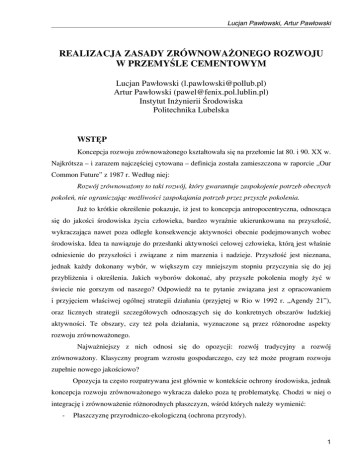 Lucjan Pawłowski, Artur Pawłowski REALIZACJA ZASADY ZRÓWNOWAŻONEGO ROZWOJU W PRZEMYŚLE CEMENTOWYM Lucjan Pawłowski ([email protected]) Artur Pawłowski ([email protected]) Instytut Inżynierii Środowiska Politechnika Lubelska WSTĘP Koncepcja rozwoju zrównoważonego kształtowała się na przełomie lat 80. i 90. XX w. Najkrótsza – i zarazem najczęściej cytowana – definicja została zamieszczona w raporcie „Our Common Future” z 1987 r. Według niej: Rozwój zrównoważony to taki rozwój, który gwarantuje zaspokojenie potrzeb obecnych pokoleń, nie ograniczając możliwości zaspokajania potrzeb przez przyszłe pokolenia. Już to krótkie określenie pokazuje, iż jest to koncepcja antropocentryczna, odnosząca się do jakości środowiska życia człowieka, bardzo wyraźnie ukierunkowana na przyszłość, wykraczająca nawet poza odległe konsekwencje aktywności obecnie podejmowanych wobec środowiska. Idea ta nawiązuje do przesłanki aktywności celowej człowieka, którą jest właśnie odniesienie do przyszłości i związane z nim marzenia i nadzieje. Przyszłość jest nieznana, jednak każdy dokonany wybór, w większym czy mniejszym stopniu przyczynia się do jej przybliżenia i określenia. Jakich wyborów dokonać, aby przyszłe pokolenia mogły żyć w świecie nie gorszym od naszego? Odpowiedź na te pytanie związana jest z opracowaniem i przyjęciem właściwej ogólnej strategii działania (przyjętej w Rio w 1992 r. „Agendy 21”), oraz licznych strategii szczegółowych odnoszących się do konkretnych obszarów ludzkiej aktywności. Te obszary, czy też pola działania, wyznaczone są przez różnorodne aspekty rozwoju zrównoważonego. Najważniejszy z nich odnosi się do opozycji: rozwój tradycyjny a rozwój zrównoważony. Klasyczny program wzrostu gospodarczego, czy też może program rozwoju zupełnie nowego jakościowo? Opozycja ta często rozpatrywana jest głównie w kontekście ochrony środowiska, jednak koncepcja rozwoju zrównoważonego wykracza daleko poza tę problematykę. Chodzi w niej o integrację i zrównoważenie różnorodnych płaszczyzn, wśród których należy wymienić: - Płaszczyznę przyrodniczo-ekologiczną (ochrona przyrody). 1 Lucjan Pawłowski, Artur Pawłowski - Płaszczyznę techniczną (nowe technologie, oszczędność surowców). - Płaszczyznę ekonomiczną (podatki, subsydia i inne instrumenty ekonomiczne). - Płaszczyznę społeczną (w polskich warunkach niezwykle istotne jest rozwiązanie problemu bezrobocia). - Płaszczyznę polityczną (formułowanie strategii rozwoju zrównoważonego, ich wdrażanie i kontrola). Wydaje się, że szczególnie znacznie może odegrać płaszczyzna techniczna. Istotnym wyzwaniem jest to, że nie można użytkować środowiska i pozyskiwać zasobów naturalnych tak, aby działania te nie pociągały za sobą żadnych negatywnych zmian. Mogą mieć one charakter bezpośredni bądź pośredni, odwracalny lub nieodwracalny. Różna będzie ich skala: od stosunkowo niewielkich konsekwencji lokalnego zdarzenia, po problemy o charakterze globalnym. Zawsze jednak ten aspekt negatywny będzie obecny. Zniszczenia środowiska można jednak minimalizować, co jest zadaniem dla nauk technicznych, a w szczególności dla rozwijającej się obecnie inżynierii środowiskowej. Płaszczyzna techniczna rozwoju zrównoważonego może odnosić się do zmniejszenia emisji zanieczyszczeń poprzez budowę nowych urządzeń oczyszczających (tzw. rozwiązania „na końcu rury”), jednak o wiele istotniejsza jest ingerencja w samą istotę wykorzystywanego procesu technologicznego. Wskazać tu można na 4 podstawowe grupy strategii: - Ograniczenie przepływu surowców, a więc użytkowanie mniejszej ich ilości. Jest to kwestia wydajniejszego ich użytkowania, czy też wprowadzanie materiałooszczędnych technologii Nie jest tajemnicą, że gdyby dziś budowano słynną wieżę Eiffla, to przy użyciu współczesnych technologii zużyto by jedynie 1/7 tej stali, którą faktycznie wykorzystano. - Zwolnienie przepływu surowców - to kwestia ich jakości, większej bezawaryjności produktów i ich dłuższego wykorzystywania. - Zamknięcie przepływu surowców odnoszące się do ponownego użytkowania odzyskiwanych materiałów. Może to nastąpić poprzez wprowadzanie różnych form recyklingu. - Zastąpienie przepływu - zastępowanie materiału szkodliwego mniej szkodliwym, czy też zastąpienie nieodnawialnych surowców materiałami odnawialnymi. Integracja tych strategii następuje poprzez wprowadzenie tzw. „czystszej produkcji”. Koncepcja ta oznacza ciągłe stosowanie zapobiegawczej strategii względem środowiska odnośnie: 2 Lucjan Pawłowski, Artur Pawłowski - Procesów produkcji, w szczególności chodzi o oszczędność surowców i energii, eliminowanie materiałów toksycznych, zmniejszenie emisji zanieczyszczeń. - Produktów - zmniejszenie oddziaływania na środowisko podczas całego okresu „życia” produktu. - Usług – wybór takich usług, które będą wywierały jak najmniejszy wpływ na środowisko, co w dużej mierze jest związane z zastosowaniem podejścia prewencyjnego. Ogólnym celem czystszej produkcji jest polepszenie jakości, wydajności, zmniejszenie ryzyka dla ludzi i oszczędność wydatków. Przykładem, gdzie takie rozwiązania są już wdrażane może być przemysł cementowy. Rys. 1. Koncepcja czystszej produkcji. Czystsza Produkcja Wzorcowe substytuty Redukcja surowców Produkty jest Prewencyjna Zintegrowana Ciągła Strategie dla zmian Procesy Oszczędność energii Ukierunkowanie na środowisko Usługi dla zwiększenia Wydajności która poprawia Zmniejszenia ryzyka Oddziaływania na środowisko i obniża koszty Wzmocnianie konkurencyjności Źródło: J. Strahl, Sustainable industrial production: waste minimalization, cleaner technology and industrial technology, Uppsala 1997. 3 Lucjan Pawłowski, Artur Pawłowski CO OZNACZA ZRÓWNOWAŻONY ROZW