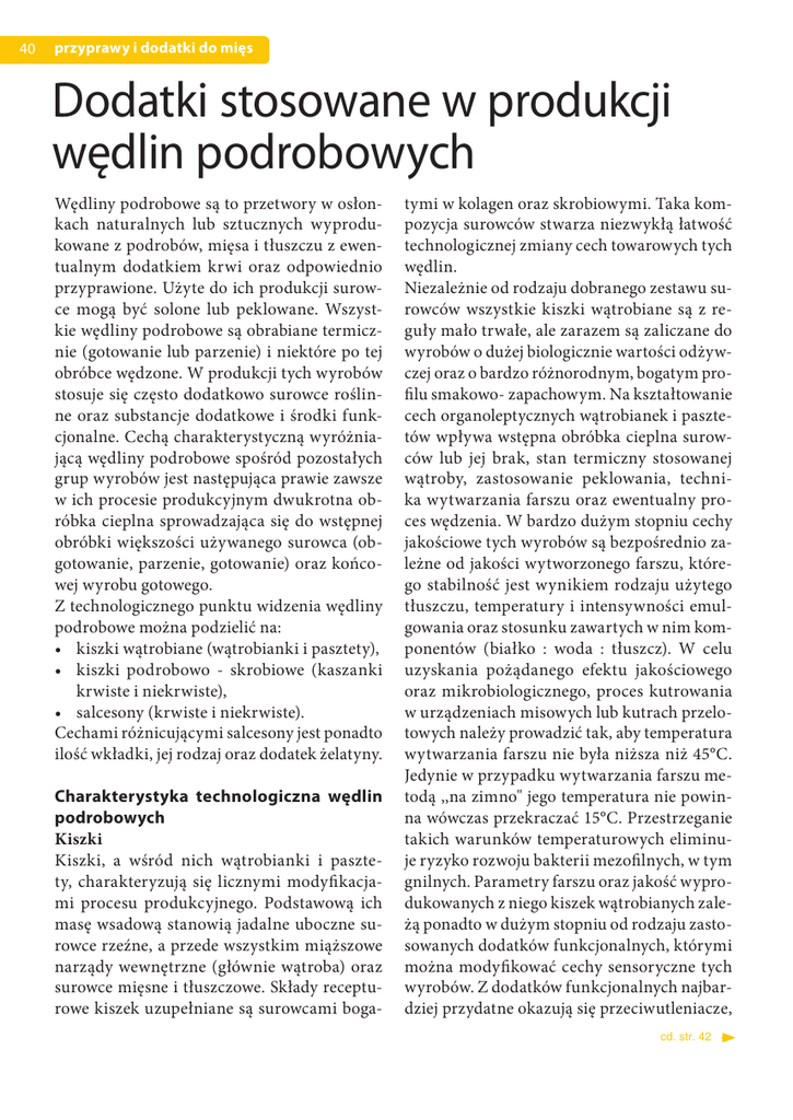 40 przyprawy i dodatki do mięs Dodatki stosowane w produkcji wędlin podrobowych Wędliny podrobowe są to przetwory w osłonkach naturalnych lub sztucznych wyprodukowane z podrobów, mięsa i tłuszczu z ewentualnym dodatkiem krwi oraz odpowiednio przyprawione. Użyte do ich produkcji surowce mogą być solone lub peklowane. Wszystkie wędliny podrobowe są obrabiane termicznie (gotowanie lub parzenie) i niektóre po tej obróbce wędzone. W produkcji tych wyrobów stosuje się często dodatkowo surowce roślinne oraz substancje dodatkowe i środki funkcjonalne. Cechą charakterystyczną wyróżniającą wędliny podrobowe spośród pozostałych grup wyrobów jest następująca prawie zawsze w ich procesie produkcyjnym dwukrotna obróbka cieplna sprowadzająca się do wstępnej obróbki większości używanego surowca (obgotowanie, parzenie, gotowanie) oraz końcowej wyrobu gotowego. Z technologicznego punktu widzenia wędliny podrobowe można podzielić na: • kiszki wątrobiane (wątrobianki i pasztety), • kiszki podrobowo - skrobiowe (kaszanki krwiste i niekrwiste), • salcesony (krwiste i niekrwiste). Cechami różnicującymi salcesony jest ponadto ilość wkładki, jej rodzaj oraz dodatek żelatyny. Charakterystyka technologiczna wędlin podrobowych Kiszki Kiszki, a wśród nich wątrobianki i pasztety, charakteryzują się licznymi modyfikacjami procesu produkcyjnego. Podstawową ich masę wsadową stanowią jadalne uboczne surowce rzeźne, a przede wszystkim miąższowe narządy wewnętrzne (głównie wątroba) oraz surowce mięsne i tłuszczowe. Składy recepturowe kiszek uzupełniane są surowcami boga- tymi w kolagen oraz skrobiowymi. Taka kompozycja surowców stwarza niezwykłą łatwość technologicznej zmiany cech towarowych tych wędlin. Niezależnie od rodzaju dobranego zestawu surowców wszystkie kiszki wątrobiane są z reguły mało trwałe, ale zarazem są zaliczane do wyrobów o dużej biologicznie wartości odżywczej oraz o bardzo różnorodnym, bogatym profilu smakowo- zapachowym. Na kształtowanie cech organoleptycznych wątrobianek i pasztetów wpływa wstępna obróbka cieplna surowców lub jej brak, stan termiczny stosowanej wątroby, zastosowanie peklowania, technika wytwarzania farszu oraz ewentualny proces wędzenia. W bardzo dużym stopniu cechy jakościowe tych wyrobów są bezpośrednio zależne od jakości wytworzonego farszu, którego stabilność jest wynikiem rodzaju użytego tłuszczu, temperatury i intensywności emulgowania oraz stosunku zawartych w nim komponentów (białko : woda : tłuszcz). W celu uzyskania pożądanego efektu jakościowego oraz mikrobiologicznego, proces kutrowania w urządzeniach misowych lub kutrach przelotowych należy prowadzić tak, aby temperatura wytwarzania farszu nie była niższa niż 45°C. Jedynie w przypadku wytwarzania farszu metodą ,,na zimno" jego temperatura nie powinna wówczas przekraczać 15°C. Przestrzeganie takich warunków temperaturowych eliminuje ryzyko rozwoju bakterii mezofilnych, w tym gnilnych. Parametry farszu oraz jakość wyprodukowanych z niego kiszek wątrobianych zależą ponadto w dużym stopniu od rodzaju zastosowanych dodatków funkcjonalnych, którymi można modyfikować cechy sensoryczne tych wyrobów. Z dodatków funkcjonalnych najbardziej przydatne okazują się przeciwutleniacze, cd. str. 42 42 przyprawy i dodatki do mięs emulgatory oraz dodatki poprawiające teksturę wyrobów. Kiszki podrobowo- skrobiowe (kaszanki) mają kształtowaną różnorodność organoleptyczną uzależnioną głównie od dodatku krwi oraz rodzaju zastosowanych surowców mięsnych, podrobowych, tłuszczowych i rodzaju gatunkowego surowców skrobiowych (głównie kasze). W tej grupie kiszek z dodatków funkcjonalnych przydatny staje się tylko chlorek sodu. Salcesony Podstawową masę surowcową do produkcji salcesonów stanowią jadalne uboczne surowce rzeźne o stosunkowo dużej zawartości tłuszczu oraz surowce mięsne bogate w tkankę łączną. Ze względu na dodatek krwi salcesony dzielą się na krwiste i niekrwiste. Cechą charakterystyczną produkcji salcesonów jest poddawanie surowców mięsnych i niektórych podrobowych procesowi wstępnego mokrego peklowania. W produkcji tej grupy wędlin stopień rozdrobnienia poszczególnych surowców decyduje o rodzaju towarowym wyrobu. Użycie większych kawałków mięsa, tłuszczu twardego, podrobów (ozory, serca, wątroba) stanowi podstawę do kwalifikowania salcesonów do grupy wyrobów z tzw. wkładką. Właściwie rozdrobnione, obrobione wstępnie termicznie skórki z dodatkiem niekiedy krwi (salcesony krwiste) i rosołu stanowią lepiszcze wpływające na krajalność i związanie salcesonów. W przypadku zbyt małej ilości lepiszcza, względnie przy dużej wydajności produkcyjnej należy wprowadzać do produkcji salcesonów dodatek białkowego hydrokoloidu jakim jest żelatyna. Powstający po wychłodzeniu salcesonów żel staje się masą wiążącą pozostałe składniki i decyduje o poprawnej teksturze wyrobu gotowego. Grupa salcesonów składających się z klarownej galarety powstałej z dodanej żelatyny wraz z zawieszonymi w niej kawałkami mięsa, tłuszczu twardego i podrobów ulega systematycznym modyfikacjom. Jako surowce wprowadza się coraz częściej dodatek marynowanych warzyw oraz owoców przy równoczesnym dodatku substancji zakwaszających, co zmienia produkt pod względem optycznym i kulinarnym. Rodzaje dodatków stosowanych w produkcji wędlin podrobowych Sól i środki peklujące Podstawowym dodatkiem mineralnym zawsze stosowanym w produkcji wędlin podrobowych jest chlorek sodu (sól kuchenna). Poza nadawaniem smakowitości wyrobom sól obniża aw ograniczając rozwój drobnoustrojów. Ponadto hamując działalność enzymów wpływa dodatkowo na trwałość wędlin podrobowych. Technologicznie pożądaną cechą chlorku sodu jest zwiększanie zdolności emulgującej białek. Procesy technologiczne wytworzenia wędli