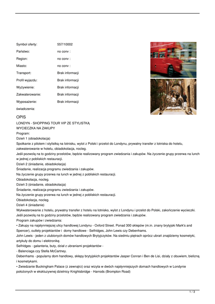 Symbol oferty: 557/10002 Państwo: no conv : Region: no conv : Miasto: no conv : Transport: Brak informacji Profil wyjazdu: Brak informacji Wyżywienie: Brak informacji Zakwaterowanie: Brak informacji Wyposażenie: Brak informacji świadczenia: OPIS LONDYN - SHOPPING TOUR VIP ZE STYLISTKĄ WYCIECZKA NA ZAKUPY Program: Dzień 1 (obiadokolacja) Spotkanie z pilotem i stylistką na lotnisku, wylot z Polski i przelot do Londynu, prywatny transfer z lotniska do hotelu, zakwaterowanie w hotelu, obiadokolacja, nocleg. Jeśli pozwolą na to godziny przelotów, będzie realizowany program zwiedzania i zakupów. Na życzenie grupy przerwa na lunch w jednej z pobliskich restauracji. Dzień 2 (śniadanie, obiadokolacja) Śniadanie, realizacja programu zwiedzania i zakupów. Na życzenie grupy przerwa na lunch w jednej z pobliskich restauracji. Obiadokolacja, nocleg. Dzień 3 (śniadanie, obiadokolacja) Śniadanie, realizacja programu zwiedzania i zakupów. Na życzenie grupy przerwa na lunch w jednej z pobliskich restauracji. Obiadokolacja, nocleg. Dzień 4 (śniadanie) Wykwaterowanie z hotelu, prywatny transfer z hotelu na lotnisko, wylot z Londynu i przelot do Polski, zakończenie wycieczki. Jeśli pozwolą na to godziny przelotów, będzie realizowany program zwiedzania i zakupów. Program zakupów i zwiedzania: • Zakupy na najsłynniejszej ulicy handlowej Londynu - Oxford Street. Ponad 300 sklepów (m.in. znany brytyjski Mark's and Spencer), outlety projektantów i domy handlowe - Selfridges, John Lewis czy Debenhams. John Lewis - jeden z ulubionych domów handlowych Brytyjczyków. Na siedmiu piętrach oprócz ubrań znajdziemy kosmetyki, artykuły do domu i elektronikę. Selfridges - galanteria, buty, dział z ubraniami projektantów - Balenciaga czy Stella McCartney. Debenhams - popularny dom handlowy, sklepy brytyjskich projektantów Jasper Conran i Ben de Lisi, działy z obuwiem, bielizną i kosmetykami. • Zwiedzanie Buckingham Palace (z zewnątrz) oraz wizyta w dwóch najsłynniejszych domach handlowych w Londynie położonych w ekskluzywnej dzielnicy Knightsbridge - Harrods (Brompton Road) 1/3 i Harvey Nichols. Harrods - na siedmiu piętrach znajduje się ponad 330 sklepów. Harvey Nichols - sklepy najsłynniejszych projektantów m.in D&G, John Galliano i Jimmy Choo; ubrania, buty,biżuteria i kosmetyki. • Zwiedzanie: Picadilly Circus, Trafalgar Square z kolumną Nelsona, Parlament z Big Benem (z zewnątrz), London Eye (dla chętnych przejażdżka). Zakupy na Regent i Bond Street. Regent Street - elegancka ulica zakupowa, gdzie znajdziemy sporo butików z tzw. średniej półki (typu Benetton itp.) oraz dom handlowy Liberty. Liberty - najbardziej tradycyjny londyński dom handlowy z szeroką gamą produktów, m.in. sklepy projektantów takich jak Vivienne Westwood, Chloé and Dries Van Noten. Bond Street - Najbardziej ekskluzywna zakupowa ulica Londynu. Najlepsze sklepy - Louis Vuitton, Burberry czy Tiffany, ale także dom handlowy Fenwick (ubrania, akcesoria, artykuły do domu) Cena zawiera: - bilet lotniczY Polska - Londyn - Polska - 3 noclegi w hotelu 4* lub 5* w Londynie (pokoje 2 os.), - prywatny transfer lotnisko - hotel - lotnisko, - wyżywienie HB: 3 x śniadanie i 3 x obiadokolacja, - doradztwo profesjonalnej stylistki podczas całej wycieczki, - opieka polskiego pilota podczas całej wycieczki, - bilety komunikacji miejskiej (karta Oyster), - realizacja programu, - ubezpieczenie Axa (KL 10 000 EUR, NNW 2000 EUR, bagaż podróżny 200 EUR). Cena nie zawiera: - ewentualnych biletów wstępu i innych świadczeń nie wymienionych w ofercie. CO DOSTAJESZ OD STYLISTKI? 1. Analizę Sylwetki - czyli jakie fasony ubrań oraz jakie akcesoria, podkreślą Twoje atuty a ukryją mankamenty sylwetki. 2. Analizę kolorystyczną - czyli w jakich kolorach jest Ci do Twarzy, a jakich musisz unikać. 3. Wspólnie stworzoną listę zakupów - czyli spis Twoich oczekiwań, marzeń i zachcianek 4. Profesionalne doradztwo podczas zakupów. 5. Gotowe zestawy stylizacji. 6. Spersonalizowany skrypt z zasadami ubioru. Możliwe dodatkowe atrakcje (za dopłatą - ceny orientacyjne): - London Eye (20 GBP), - rejs statkiem po Tamizie (15 GBP), - Madame Tussaud's - muzeum figur woskowych (25 GBP), - przejazd piętrowym wycieczkowym autobusem po centrum Londynu (5 GBP), - wyjście na musical na West Endzie (40 GBP) - wizyta w Ripley's belive It or Not - chyba najdziwniejsze muzeum w Londynie (30 GBP), - wyjście do dyskoteki (polecamy Ministry of Sound, Fabric, Matter Cable, Mass, Egg, Shaka Zulu - wstępy płatne) - zwiedzanie: Tower of London - średniowieczna twierdza ze Skarbcem Królewskim, słynny Tower Bridge; Westminster Abbey kościół koronacyjny królów; katedra św. Pawła - główna światynia City of London; Hyde Park i Speaker's Corner - miejsce publicznych dyskusji; Buckingham Palace; Picadilly Circus, Trafalgar Square z kolumną Nelsona, Parlament z Big Benem, London Eye (dla chętnych przejażdżka). Dodatkowe informacje: • Kolejność zwiedzania może ulec zmianie. • Pilot nie oprowadza wewnątrz obiektów. • W przypadku wylotu w godzinach porannych zamiast śniadania może być wydany pakiet śniadaniowy. • Linia lotnicza i godziny przelotów mogą ulec zmianie. • Hotele - wygodne, położone w pobliżu środków komunikacji miejskiej - stanowią dobrą bazę wypadową do zwiedzanych 2/3 atrakcji oraz dzielnic zakupowych. Cena przelotu została skalkulowana w najniższej taryfie w danym terminie. W przypadku niedostępności tej taryfy istnieje możliwość rezerwacji biletu w innej - za odpowiednią dopłatą. Po dokonaniu rezerwacji oferta wymaga potwierdzenia u touroperatora. Warunki uczestnictwa oraz wszystkie dodatkowe informacje znajdą Państwo w zakładkach na stronie: www.fit-travel.turystyka.info (zakładka "Dokumenty"). TERMINY: CENNIK: Długość pobytu: dni Grupa cenowa: Waluta: PLN Aktualne ceny z systemu S.A.R.T. (-) - cena usługi, podatku kalkulowana przy oso
