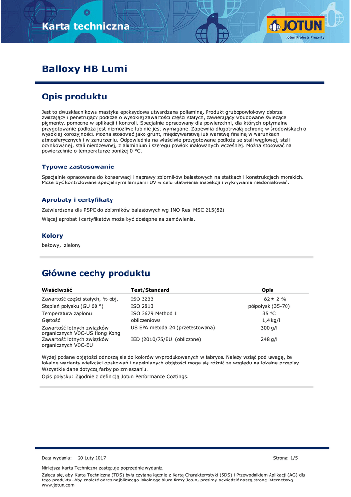 Karta techniczna Approved 8340;386 2 8340 mastyka epoksydowa ^(ValidationDate) Balloxy HB Lumi Opis produktu Jest to dwuskładnikowa mastyka epoksydowa utwardzana poliaminą. Produkt grubopowłokowy dobrze zwilżający i penetrujący podłoże o wysokiej zawartości części stałych, zawierający wbudowane świecące pigmenty, pomocne w aplikacji i kontroli. Specjalnie opracowany dla powierzchni, dla których optymalne przygotowanie podłoża jest niemożliwe lub nie jest wymagane. Zapewnia długotrwałą ochronę w środowiskach o wysokiej korozyjności. Można stosować jako grunt, międzywarstwę lub warstwę finalną w warunkach atmosferycznych i w zanurzeniu. Odpowiednia na właściwie przygotowane podłoża ze stali węglowej, stali ocynkowanej, stali nierdzewnej, z aluminium i szeregu powłok malowanych wcześniej. Można stosować na powierzchnie o temperaturze poniżej 0 °C. Typowe zastosowanie Specjalnie opracowana do konserwacj i naprawy zbiorników balastowych na statkach i konstrukcjach morskich. Może być kontrolowane specjalnymi lampami UV w celu ułatwienia inspekcji i wykrywania niedomalowań. Inne Aprobaty i certyfikaty Zatwierdzona dla PSPC do zbiorników balastowych wg IMO Res. MSC 215(82) Więcej aprobat i certyfikatów może być dostępne na zamówienie. Kolory beżowy, zielony Główne cechy produktu Właściwość Test/Standard Opis Zawartość części stałych, % obj. ISO 3233 Stopień połysku (GU 60 °) ISO 2813 Temperatura zapłonu Gęstość ISO 3679 Method 1 obliczeniowa Zawartość lotnych związków organicznych VOC-US Hong Kong Zawartość lotnych związków organicznych VOC-EU US EPA metoda 24 (przetestowana) 300 g/l IED (2010/75/EU (obliczone) 248 g/l 82 ± 2 % półpołysk (35-70) 35 °C 1,4 kg/l Wyżej podane objętości odnoszą sie do kolorów wyprodukowanych w fabryce. Należy wziąć pod uwagę, że lokalne warianty wielkości opakowań i napełnianych objętości moga się różnić ze względu na lokalne przepisy. Wszystkie dane dotyczą farby po zmieszaniu. Opis połysku: Zgodnie z definicją Jotun Performance Coatings. Data wydania: 20 Luty 2017 Strona: 1/5 Niniejsza Karta Techniczna zastępuje poprzednie wydanie. Zaleca się, aby Karta Techniczna (TDS) była czytana łącznie z Kartą Charakterystyki (SDS) i Przewodnikiem Aplikacji (AG) dla tego produktu. Aby znaleźć adres najbliższego lokalnego biura firmy Jotun, prosimy odwiedzić naszą stronę internetową www.jotun.com 1 Karta techniczna Balloxy HB Lumi Grubość jednej powłoki Typowy zalecany zakres specyfikowania grubości Grubość powłoki na sucho 150 - 300 µm Grubość powłoki na mokro 180 - 365 µm Wydajność teoretyczna 5,5 2,7 - m²/l Przygotowanie podłoża Aby zapewnić trwałą przyczepność do kolejnego produktu, wszystkie powierzchnie powinny być czyste, suche i wolne od wszelkich zanieczyszczeń. Przygotowanie powierzchni - tabela zbiorcza Przygotowanie podłoża Podłoże Minimum Zalecane Stal węglowa St 2 (ISO 8501-1) Sa 2½ (ISO 8501-1) Stal nierdzewna Obróbka strumieniowo-ścierna do osiągnięcia profilu powierzchni stosując zatwierdzone niemetaliczne ścierniwo, które odpowiednie jest do uzyskania ostrego i kątowego profilu powierzchni. Obróbka strumieniowo-ścierna do osiągnięcia profilu powierzchni stosując zatwierdzone niemetaliczne ścierniwo, które odpowiednie jest do uzyskania ostrego i kątowego profilu powierzchni. Aluminium Obróbka strumieniowo-ścierna do osiągnięcia profilu powierzchni stosując zatwierdzone niemetaliczne ścierniwo, które odpowiednie jest do uzyskania ostrego i kątowego profilu powierzchni. Obróbka strumieniowo-ścierna do osiągnięcia profilu powierzchni stosując zatwierdzone niemetaliczne ścierniwo, które odpowiednie jest do uzyskania ostrego i kątowego profilu powierzchni. Stal ocynkowana Powierzchnia powinna być czysta, sucha o chropowatym i matowym profilu. Oczyszczone wykończenie powierzchni przy użyciu niemetelicznego ścierniwa, tworzące czyste, chropowate i równomierne podłoże. Stal z gruntem czasowej ochrony Czysty, suchy i nieuszkodzony grunt czasowej ochrony (ISO 12944-4 6.1) Sa 2 (ISO 8501-1) Powierzchnie pokryte Czysta, sucha i nieuszkodzona, kompatybilna powłoka (ISO 12944-4 6.1) Czysta, sucha i nieuszkodzona, kompatybilna powłoka (ISO 12944-4 6.1) Aplikacja Metody stosowania Produkt może być nałożony przy pomocy Natrysk: Stosować natrysk bezpowietrzny. Pędzel: Zalecany do niewielkich powierzchni oraz do wyrabiania krawędzi, spawów i miejsc trudnodostępnych. Należy zwrócić uwagę, aby osiągnąć specyfikowaną grubość powłoki. Data wydania: 20 Luty 2017 Strona: 2/5 Niniejsza Karta Techniczna zastępuje poprzednie wydanie. Zaleca się, aby Karta Techniczna (TDS) była czytana łącznie z Kartą Charakterystyki (SDS) i Przewodnikiem Aplikacji (AG) dla tego produktu. Aby znaleźć adres najbliższego lokalnego biura firmy Jotun, prosimy odwiedzić naszą stronę internetową www.jotun.com Karta techniczna Balloxy HB Lumi Wałek: Może być stosowana na mniejszych powierzchniach. Nie zalecana jako pierwsza powłoka gruntowa. Należy zwrócić uwagę, aby osiągnąć specyfikowaną grubość powłoki. Proporcje mieszania produktu (obj.) Balloxy HB Lumi Comp A Balloxy HB Light Comp B 5 część(i) 1 część(i) Rozcieńczalnik/Zmywacz Rozcieńczalnik: Jotun Thinner No. 17 Wytyczne dane dla natrysku bezpowietrznego Dysza (inch/1000): 19-23 Ciśnienie w dyszy (minimum): 150 bar/2100 psi Czas schnięcia i utwardzania Temperatura podłoża Pyłosuchość Chodzenie po wyschniętym Czas schnięcia do przemalowania, minimum Schnięcie/utwardzenie do eksploatacji Schnięcie/utwardzenie do zanurzenia 10 °C 23 °C 40 °C 8h 24 h 24 h 4h 10 h 10 h 2h 4h 4h 14 d 7d 2d 7d 2d 1d Czasy schnięcia i utwardzania określa się w kontrolowanych temperaturach i wilgotności względnej poniżej 85 % oraz przy średnim zakresie grubości suchej powłoki (DFT) dla produktu. Powierzchnia sucha