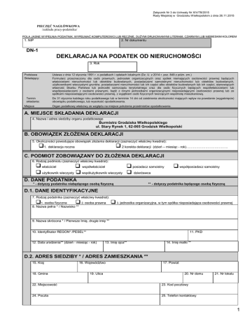 Załącznik Nr 3 do Uchwały Nr XIV/78/2015 Rady Miejskiej w Grodzisku Wielkopolskim z dnia 26.11.2015 PIECZĘĆ NAGŁÓWKOWA /zakładu pracy-podatnika/ POLA JASNE WYPEŁNIA PODATNIK. WYPEŁNIAĆ KOMPUTEROWO LUB RĘCZNIE, DUŻYMI DRUKOWANYMI LITERAMI, CZARNYM LUB NIEBIESKIM KOLOREM 1. NIP 2. Nr dokumentu DN-1 DEKLARACJA NA PODATEK OD NIERUCHOMOŚCI 3. Rok Podstawa Składający: Ustawa z dnia 12 stycznia 1991 r. o podatkach i opłatach lokalnych (Dz. U. z 2014 r. poz. 849 z późn. zm.) Formularz przeznaczony dla osób prawnych, jednostek organizacyjnych oraz spółek niemających osobowości prawnej będących właścicielami nieruchomości lub obiektów budowlanych, posiadaczami samoistnymi nieruchomości lub obiektów budowlanych, użytkownikami wieczystymi gruntów, posiadaczami nieruchomości lub ich części albo obiektów budowlanych lub ich części, stanowiących własność Skarbu Państwa lub jednostki samorządu terytorialnego oraz dla osób fizycznych będących współwłaścicielami lub współposiadaczami z osobami prawnymi, bądź z innymi jednostkami organizacyjnymi nieposiadającymi osobowości prawnej lub ze spółkami nieposiadającymi osobowości prawnej, z wyjątkiem osób fizycznych tworzących wspólnotę mieszkaniową. Termin składania: Do 31 stycznia każdego roku podatkowego lub w terminie 14 dni od zaistnienia okoliczności mających wpływ na powstanie (wygaśnięcie) obowiązku podatkowego, lub wysokość opodatkowania. Organ podatkowy właściwy ze względu na miejsce położenia przedmiotów opodatkowania. Miejsce A. MIEJSCE SKŁADANIA DEKLARACJI 4. Nazwa i adres siedziby organu podatkowego Burmistrz Grodziska Wielkopolskiego ul. Stary Rynek 1, 62-065 Grodzisk Wielkopolski B. OBOWIĄZEK ZŁOŻENIA DEKLARACJI 5. Okoliczności powodujące obowiązek złożenia deklaracji (zaznaczyć właściwy kwadrat): 1. deklaracja roczna 2 korekta deklaracji (dzień – miesiąc - rok)………………………………. C. PODMIOT ZOBOWIĄZANY DO ZŁOŻENIA DEKLARACJI 6. Rodzaj podmiotu (zaznaczyć właściwy kwadrat): właściciel współwłaściciel posiadacz samoistny użytkownik wieczysty współużytkownik wieczysty dzierżawca D. DANE PODATNIKA * - dotyczy podatnika niebędącego osobą fizyczną współposiadacz samoistny ** - dotyczy podatnika będącego osobą fizyczną D.1. DANE IDENTYFIKACYJNE 7. Rodzaj podatnika (zaznaczyć właściwy kwadrat): 1. osoba fizyczna 2. osoba prawna 8. Nazwa pełna * / Nazwisko ** 3. jednostka organizacyjna, w tym spółka nieposiadająca osobowości prawnej 9. Nazwa skrócona * / Pierwsze Imię, drugie imię ** 10. Identyfikator REGON* /PESEL** 11. PKD 12. Data urodzenia** (dzień - miesiąc - rok) 13. Imię ojca** 14. Imię matki ** D.2. ADRES SIEDZIBY * / ADRES ZAMIESZKANIA ** 15. Kraj 18. Gmina 16. Województwo 19. Ulica 17. Powiat 20. Nr domu 22. Miejscowość 23. Kod pocztowy 24. Poczta 25. Telefon kontaktowy 21. Nr lokalu 1 D.3. ADRES DO KORESPONDENCJI (WPISAĆ JEŚLI ADRES DO KORESPONDENCJI JEST INNY NIŻ ADRES SIEDZIBY / ZAMIESZKANIA) 26. Kraj 27. Województwo 29. Gmina 28. Powiat 30. Ulica 31. Nr domu 33. Miejscowość 34. Kod pocztowy 35. Poczta 36. Telefon kontaktowy 32. Nr lokalu E. DANE DOTYCZĄCE PRZEDMIOTÓW OPODATKOWANIA 37. Położenie nieruchomości (adres) 39. Nr księgi wieczystej 38. Identyfikatory geodezyjne działek, budynków, lokali E.1. POWIERZCHNIA GRUNTÓW Podstawa opodatkowania w m2(ha) z dokładnością do 1 m2 Stawka podatku Kwota podatku zł, gr zł, gr 1. Grunty związane z prowadzeniem działalności gospodarczej, bez względu na sposób zakwalifikowania w ewidencji gruntów i budynków 40. 41. 42. 2. Grunty pod wodami powierzchniowymi stojącymi lub wodami powierzchniowymi płynącymi jezior i zbiorników sztucznych 43. 44. 45. 3. Grunty pozostałe, w tym zajęte na prowadzenie odpłatnej statutowej działalności pożytku publicznego przez organizacje pożytku publicznego 46. 47. 48. 4. Grunty niezabudowane objęte obszarem rewitalizacji, o którym mowa w ustawie z dnia 9 października 2015 r. o rewitalizacji i położonych na terenach, dla których miejscowy plan zagospodarowania przestrzennego przewiduje przeznaczenie pod zabudowę mieszkaniową, usługową albo zabudowę o przeznaczeniu mieszanym obejmującym wyłącznie te rodzaje zabudowy, jeżeli od dnia wejścia w życie tego planu w odniesieniu do tych gruntów upłynął okres 4 lat, a w tym czasie nie zakończono budowy zgodnie z przepisami prawa budowlanego. 49. 50. 51. E.2 POWIERZCHNIA BUDYNKÓW LUB ICH CZĘŚCI Podstawa opodatkowania w m2 1. Budynki mieszkalne - wysokość od 1,40 do 2,20 m (zaliczyć 50% powierzchni) - wysokość powyżej 2,20 m 2. Budynki związane z prowadzeniem działalności gospodarczej oraz budynki mieszkalne lub ich części zajęte na prowadzenie działalności gospodarczej - wysokość od 1,40 do 2,20 m (zaliczyć 50% powierzchni) - wysokość powyżej 2,20 m Stawka podatku zł, gr Kwota podatku 52. 53. 55. 56. 57. 58. 59. 60. 61. 62. 63. zł, gr 54. 2 Podstawa opodatkowania w m2 3. Budynki zajęte na prowadzenie działalności gospodarczej w zakresie obrotu kwalifikowanym materiałem siewnym - wysokość od 1,40 do 2,20 m (zaliczyć 50% powierzchni) - wysokość powyżej 2,20 m 4. Budynki związane z udzielaniem świadczeń zdrowotnych w rozumieniu przepisów o działalności leczniczej, zajęte przez podmioty udzielające tych świadczeń - wysokość od 1,40 do 2,20 m (zaliczyć 50% powierzchni) 5. Budynki pozostałe, w tym zajęte na prowadzenie odpłatnej statutowej działalności pożytku publicznego przez organizację pożytku publicznego - wysokość od 1,40 do 2,20 m (zaliczyć 50% powierzchni) - wysokość powyżej 2,20 m - wysokość powyżej 2,20 m Stawka podatku zł, gr Kwota podatku 64. 65. 66. 67. 68. 69. 70. 71. 72. 73. 74. 75. 76. 77. 78. 79. 80. 81. zł, gr : E.3. WARTOŚĆ BUDOWLI LUB ICH CZĘŚCI ZWIĄZANYCH Z PROWADZENIEM DZIAŁALNOŚCI GOSPODARCZEJ Podstawa opodatkowania w zł z do
