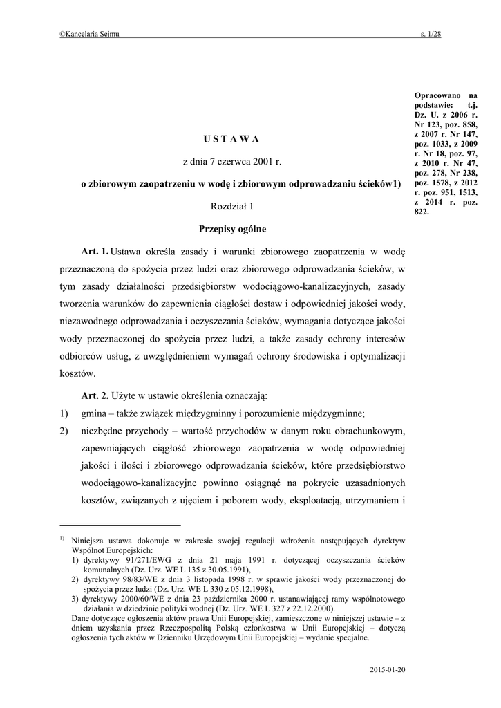 ©Kancelaria Sejmu s. 1/28 USTAWA z dnia 7 czerwca 2001 r. o zbiorowym zaopatrzeniu w wodę i zbiorowym odprowadzaniu ścieków1) Rozdział 1 Przepisy ogólne Art. 1. Ustawa określa zasady i warunki zbiorowego zaopatrzenia w wodę przeznaczoną do spożycia przez ludzi oraz zbiorowego odprowadzania ścieków, w tym zasady działalności przedsiębiorstw wodociągowo-kanalizacyjnych, zasady tworzenia warunków do zapewnienia ciągłości dostaw i odpowiedniej jakości wody, niezawodnego odprowadzania i oczyszczania ścieków, wymagania dotyczące jakości wody przeznaczonej do spożycia przez ludzi, a także zasady ochrony interesów odbiorców usług, z uwzględnieniem wymagań ochrony środowiska i optymalizacji kosztów. Art. 2. Użyte w ustawie określenia oznaczają: 1) gmina – także związek międzygminny i porozumienie międzygminne; 2) niezbędne przychody – wartość przychodów w danym roku obrachunkowym, zapewniających ciągłość zbiorowego zaopatrzenia w wodę odpowiedniej jakości i ilości i zbiorowego odprowadzania ścieków, które przedsiębiorstwo wodociągowo-kanalizacyjne powinno osiągnąć na pokrycie uzasadnionych kosztów, związanych z ujęciem i poborem wody, eksploatacją, utrzymaniem i 1) Niniejsza ustawa dokonuje w zakresie swojej regulacji wdrożenia następujących dyrektyw Wspólnot Europejskich: 1) dyrektywy 91/271/EWG z dnia 21 maja 1991 r. dotyczącej oczyszczania ścieków komunalnych (Dz. Urz. WE L 135 z 30.05.1991), 2) dyrektywy 98/83/WE z dnia 3 listopada 1998 r. w sprawie jakości wody przeznaczonej do spożycia przez ludzi (Dz. Urz. WE L 330 z 05.12.1998), 3) dyrektywy 2000/60/WE z dnia 23 października 2000 r. ustanawiającej ramy wspólnotowego działania w dziedzinie polityki wodnej (Dz. Urz. WE L 327 z 22.12.2000). Dane dotyczące ogłoszenia aktów prawa Unii Europejskiej, zamieszczone w niniejszej ustawie – z dniem uzyskania przez Rzeczpospolitą Polską członkostwa w Unii Europejskiej – dotyczą ogłoszenia tych aktów w Dzienniku Urzędowym Unii Europejskiej – wydanie specjalne. 2015-01-20 Opracowano na podstawie: t.j. Dz. U. z 2006 r. Nr 123, poz. 858, z 2007 r. Nr 147, poz. 1033, z 2009 r. Nr 18, poz. 97, z 2010 r. Nr 47, poz. 278, Nr 238, poz. 1578, z 2012 r. poz. 951, 1513, z 2014 r. poz. 822. ©Kancelaria Sejmu s. 2/28 rozbudową urządzeń wodociągowych i urządzeń kanalizacyjnych oraz osiągnięcie zysku; 3) odbiorca usług – każdego, kto korzysta z usług wodociągowo-kanalizacyjnych z zakresu zbiorowego zaopatrzenia w wodę i zbiorowego odprowadzania ścieków na podstawie pisemnej umowy z przedsiębiorstwem wodociągowokanalizacyjnym; 3a) osoba korzystająca z lokalu – osobę posiadającą tytuł prawny do lokalu lub osobę korzystającą z lokalu o nieuregulowanym stanie prawnym; 4) przedsiębiorstwo wodociągowo-kanalizacyjne – przedsiębiorcę w rozumieniu przepisów o swobodzie działalności gospodarczej, jeżeli prowadzi działalność gospodarczą w zakresie zbiorowego zaopatrzenia w wodę lub zbiorowego odprowadzania ścieków, oraz gminne jednostki organizacyjne nieposiadające osobowości prawnej, prowadzące tego rodzaju działalność; 5) przyłącze kanalizacyjne – odcinek przewodu łączącego wewnętrzną instalację kanalizacyjną w nieruchomości odbiorcy usług z siecią kanalizacyjną, za pierwszą studzienką, licząc od strony budynku, a w przypadku jej braku do granicy nieruchomości gruntowej; 6) przyłącze wodociągowe – odcinek przewodu łączącego sieć wodociągową z wewnętrzną instalacją wodociągową w nieruchomości odbiorcy usług wraz z zaworem za wodomierzem głównym; 7) sieć – przewody wodociągowe lub kanalizacyjne wraz z uzbrojeniem i urządzeniami, którymi dostarczana jest woda lub którymi odprowadzane są ścieki, będące w posiadaniu przedsiębiorstwa wodociągowo-kanalizacyjnego; 8) ścieki – wprowadzane do wód lub do ziemi: a) wody zużyte, w szczególności na cele bytowe lub gospodarcze, b) ciekłe odchody zwierzęce, z wyjątkiem gnojówki i gnojowicy przeznaczonych do rolniczego wykorzystania w sposób i na zasadach określonych w ustawie z dnia 10 lipca 2007 r. o nawozach i nawożeniu (Dz. U. Nr 147, poz. 1033), c) wody opadowe lub roztopowe, ujęte w otwarte lub zamknięte systemy kanalizacyjne, pochodzące z powierzchni zanieczyszczonych o trwałej nawierzchni, w szczególności z miast, portów, lotnisk, terenów 2015-01-20 ©Kancelaria Sejmu przemysłowych, s. 3/28 handlowych, usługowych i składowych, baz transportowych oraz dróg i parkingów, d) wody odciekowe ze składowisk odpadów oraz obiektów unieszkodliwiania odpadów wydobywczych, w których są składowane odpady wydobywcze niebezpieczne oraz odpady wydobywcze inne niż niebezpieczne i obojętne, miejsc magazynowania odpadów, wykorzystane solanki, wody lecznicze i termalne, e) wody pochodzące z odwodnienia zakładów górniczych, z wyjątkiem wód wtłaczanych do górotworu, jeżeli rodzaje i ilość substancji zawartych w wodzie wtłaczanej do górotworu są tożsame z rodzajami i ilościami substancji zawartych w pobranej wodzie, f) wody wykorzystane, odprowadzane z obiektów chowu lub hodowli ryb łososiowatych, g) wody wykorzystane, odprowadzane z obiektów chowu lub hodowli ryb innych niż łososiowate albo innych organizmów wodnych, o ile produkcja tych ryb lub organizmów, rozumiana jako średnioroczny przyrost masy tych ryb albo tych organizmów w poszczególnych latach cyklu produkcyjnego, przekracza 1 500 kg z 1 ha powierzchni użytkowej stawów rybnych tego obiektu w jednym roku danego cyklu; 9) ścieki bytowe – ścieki z budynków mieszkalnych, zamieszkania zbiorowego oraz użyteczności publicznej, powstające w wyniku ludzkiego metabolizmu lub funkcjonowania gospodarstw domowych oraz ścieki o zbliżonym składzie pochodzące z tych budynków; 10) ścieki komunalne – ścieki bytowe lub mieszaninę ścieków bytowych ze ściekami przemysłowymi albo wodam