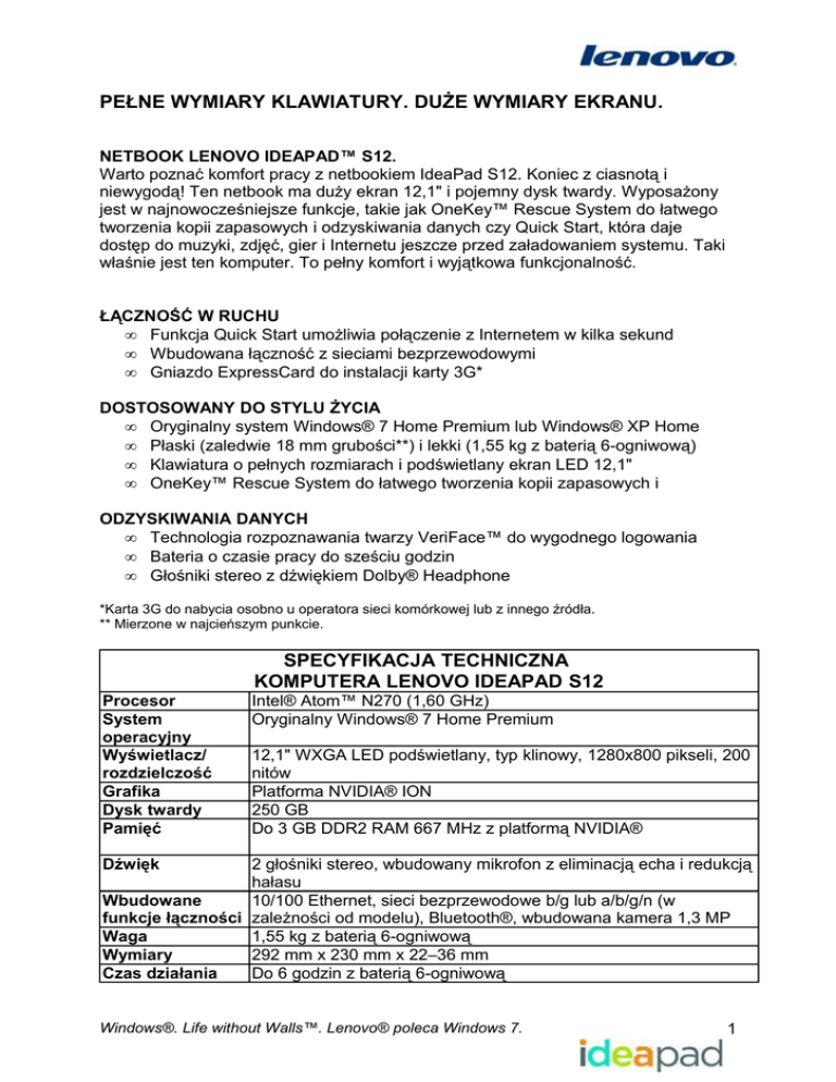 PEŁNE WYMIARY KLAWIATURY. DUŻE WYMIARY EKRANU. NETBOOK LENOVO IDEAPAD™ S12. Warto poznać komfort pracy z netbookiem IdeaPad S12. Koniec z ciasnotą i niewygodą! Ten netbook ma duży ekran 12,1" i pojemny dysk twardy. Wyposażony jest w najnowocześniejsze funkcje, takie jak OneKey™ Rescue System do łatwego tworzenia kopii zapasowych i odzyskiwania danych czy Quick Start, która daje dostęp do muzyki, zdjęć, gier i Internetu jeszcze przed załadowaniem systemu. Taki właśnie jest ten komputer. To pełny komfort i wyjątkowa funkcjonalność. ŁĄCZNOŚĆ W RUCHU • Funkcja Quick Start umożliwia połączenie z Internetem w kilka sekund • Wbudowana łączność z sieciami bezprzewodowymi • Gniazdo ExpressCard do instalacji karty 3G* DOSTOSOWANY DO STYLU ŻYCIA • Oryginalny system Windows® 7 Home Premium lub Windows® XP Home • Płaski (zaledwie 18 mm grubości**) i lekki (1,55 kg z baterią 6-ogniwową) • Klawiatura o pełnych rozmiarach i podświetlany ekran LED 12,1" • OneKey™ Rescue System do łatwego tworzenia kopii zapasowych i ODZYSKIWANIA DANYCH • Technologia rozpoznawania twarzy VeriFace™ do wygodnego logowania • Bateria o czasie pracy do sześciu godzin • Głośniki stereo z dźwiękiem Dolby® Headphone *Karta 3G do nabycia osobno u operatora sieci komórkowej lub z innego źródła. ** Mierzone w najcieńszym punkcie. SPECYFIKACJA TECHNICZNA KOMPUTERA LENOVO IDEAPAD S12 Procesor System operacyjny Wyświetlacz/ rozdzielczość Grafika Dysk twardy Pamięć Intel® Atom™ N270 (1,60 GHz) Oryginalny Windows® 7 Home Premium 12,1" WXGA LED podświetlany, typ klinowy, 1280x800 pikseli, 200 nitów Platforma NVIDIA® ION 250 GB Do 3 GB DDR2 RAM 667 MHz z platformą NVIDIA® Dźwięk 2 głośniki stereo, wbudowany mikrofon z eliminacją echa i redukcją hałasu Wbudowane 10/100 Ethernet, sieci bezprzewodowe b/g lub a/b/g/n (w funkcje łączności zależności od modelu), Bluetooth®, wbudowana kamera 1,3 MP Waga 1,55 kg z baterią 6-ogniwową Wymiary 292 mm x 230 mm x 22–36 mm Czas działania Do 6 godzin z baterią 6-ogniwową Windows®. Life without Walls™. Lenovo® poleca Windows 7. 1 baterii Rozszerzenia 3 porty USB 2.0, czytnik kart 4-w-1 (SD/MMC/MS/MS Pro), RJ45, VGA, jeden wbudowany mikrofon z funkcją eliminacji echa i redukcji hałasu, słuchawki, HDMI Dołączone OneKey™ Rescue System, Lenovo Energy Management Software oprogramowanie 3.0, Adobe® Reader® 8.1, NIS 2009, pasek narzędzi Windows Live™, VeriFace™, Instant On, Internet Explorer 7.0, wersja próbna Microsoft® Office 2007 AKCESORIA DO NETBOOKA IDEAPAD S12 MYSZ OPTYCZNA LENOVO MINI — CZARNA • Niewielka konstrukcja, idealna do podróży i na co dzień • Kształt zapewniający komfortową obsługę lewą i prawą ręką • Łatwa nawigacja przy użyciu dwóch przycisków i pokrętła • Czujnik optyczny zapewniający precyzję • Proste podłączanie do gniazda USB w trybie Plug-n-Play WIELOFUNKCYJNA NAGRYWARKA USB 2.0 Z TECHNOLOGIĄ LIGHTSCRIBE • Zewnętrzna nagrywarka DVD zasilana z USB • Czarna z gumowaną powierzchnią • Drukowanie profesjonalnych etykiet na dyskach CD i DVD kompatybilnych z technologią LightScribe • W komplecie wyściełany futerał Lenovo zastrzega sobie prawo do zmiany oferty i specyfikacji produktów w dowolnym czasie i bez powiadomienia. Lenovo dokłada wszelkich starań, by zapewnić dokładność wszystkich informacji, ale nie ponosi odpowiedzialności za jakiekolwiek błędy redakcyjne, fotograficzne ani typograficzne. Wszelkie zdjęcia zostały użyte wyłącznie w celach ilustracyjnych. Pełne specyfikacje produktów, usług i gwarancji Lenovo można uzyskać pod adresem www.lenovo.com. Lenovo nie udziela żadnych zapewnień ani gwarancji w odniesieniu do produktów i usług innych podmiotów. Nie wszystkie technologie wymienione obok rysunku żarówki są dostępne we wszystkich produktach przedstawionych w niniejszej reklamie. Znaki towarowe: Następujące nazwy są znakami towarowymi lub zarejestrowanymi znakami towarowymi Lenovo: Lenovo, logo Lenovo, IdeaPad, OneKey i VeriFace. Microsoft i Windows są zarejestrowanymi znakami towarowymi Microsoft Corporation w USA lub innych krajach. Intel, logo Intel, Intel Inside, Intel Atom i Atom Inside są znakami towarowymi Intel Corporation w USA lub innych krajach. Pozostałe nazwy firm, produktów i usług mogą być znakami towarowymi lub usługowymi innych podmiotów. ©2009 Lenovo. Wszelkie prawa zastrzeżone. Najnowsze informacje o bezpiecznym i efektywnym korzystaniu z komputerów można uzyskać, odwiedzając regularnie stronę www.lenovo.com/safecomputing. Windows®. Life without Walls™. Lenovo® poleca Windows 7. 2