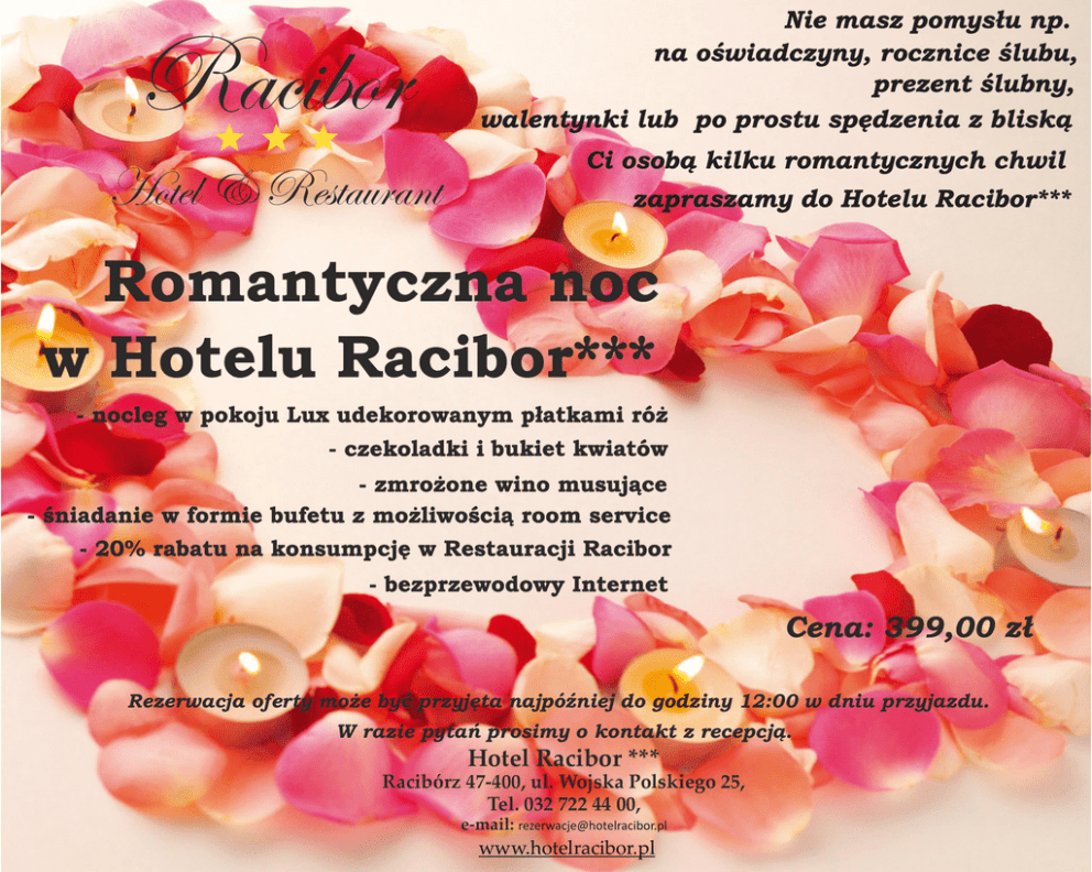 Racibor Hotel & Restaurant Nie masz pomysłu np. na oświadczyny, rocznice ślubu, prezent ślubny, walentynki lub po prostu spędzenia z bliską Ci osobą kilku romantycznych chwil zapraszamy do Hotelu Racibor*** Romantyczna noc w Hotelu Racibor*** - nocleg w pokoju Lux udekorowanym płatkami róż - czekoladki i bukiet kwiatów - zmrożone wino musujące - śniadanie w formie bufetu z możliwością room service - 20% rabatu na konsumpcję w Restauracji Racibor - bezprzewodowy Internet Cena: 399,00 zł Rezerwacja oferty może być przyjęta najpóźniej do godziny 12:00 w dniu przyjazdu. W razie pytań prosimy o kontakt z recepcją. Hotel Racibor *** Racibórz 47-400, ul. Wojska Polskiego 25, Tel. 032 722 44 00, e-mail: [email protected] www.hotelracibor.pl