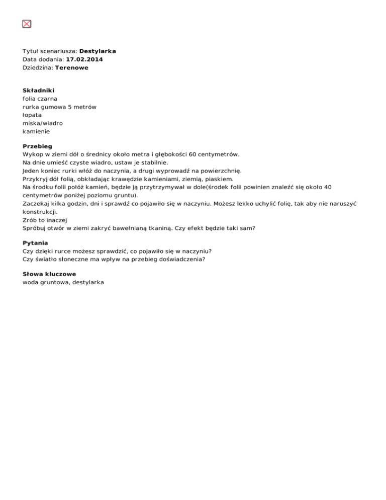 Tytuł scenariusza: Destylarka Data dodania: 17.02.2014 Dziedzina: Terenowe Składniki folia czarna rurka gumowa 5 metrów łopata miska/wiadro kamienie Przebieg Wykop w ziemi dół o średnicy około metra i głębokości 60 centymetrów. Na dnie umieść czyste wiadro, ustaw je stabilnie. Jeden koniec rurki włóż do naczynia, a drugi wyprowadź na powierzchnię. Przykryj dół folią, obkładając krawędzie kamieniami, ziemią, piaskiem. Na środku folii połóż kamień, będzie ją przytrzymywał w dole(środek folii powinien znaleźć się około 40 centymetrów poniżej poziomu gruntu). Zaczekaj kilka godzin, dni i sprawdź co pojawiło się w naczyniu. Możesz lekko uchylić folię, tak aby nie naruszyć konstrukcji. Zrób to inaczej Spróbuj otwór w ziemi zakryć bawełnianą tkaniną. Czy efekt będzie taki sam? Pytania Czy dzięki rurce możesz sprawdzić, co pojawiło się w naczyniu? Czy światło słoneczne ma wpływ na przebieg doświadczenia? Słowa kluczowe woda gruntowa, destylarka