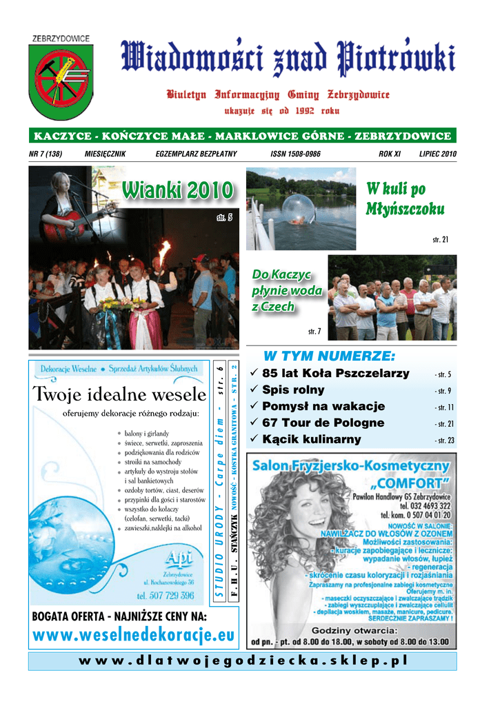 KACZYCE - KOŃCZYCE MAŁE - MARKLOWICE GÓRNE - ZEBRZYDOWICE NR 7 (138) MIESIÊCZNIK egzemplarz bezp£atny ISSN 1508-0986 Wianki 2010 Rok XI lipiec 2010 W kuli po Młyńszczoku str. 5 str. 21 Do Kaczyc płynie woda z Czech str. 7 nowość - kostka granitowa - s t r . 2 ü ü ü ü ü 85 lat Koła Pszczelarzy Spis rolny Pomysł na wakacje 67 Tour de Pologne Kącik kulinarny - str. 5 - str. 9 - str. 11 - str. 21 - str. 23 F . H . U . Stañczyk Studio Urody - Carpe diem - str. 6 w tym numerze: Bogata oferta - najniższe ceny na: www.weselnedekoracje.eu w w w . d l a t w o j e g o d z i e c k a . s k l eWiadomoœci p . p lznad Piotrówki 1 NOWOŚĆ ! GRANITOWY 2 Wiadomoœci znad Piotrówki Zmarł ks. kanonik Edward Raszczyk Sz k o l n e s p o t k a n i a p o l a t a c h . . . Ostatnie pożegnanie kaczyckiego Proboszcza Szkoła Podstawowa w Kończycach Małych 18 czerwca 2010 r. w Zamku Kończyce Małe spotkali się po 40-tu latach od ukońW dniu 21 lipca tego roku w Kościele Podwyższenia Krzyża w Kaczycach czenia Szkoły Podstawowej im. Jarosława Dąbrowskiego tutejsi absolwenci klasy VIII B pożegnano zmarłego Księdza Kanonika Edwarda Raszczyka - Proboszcza Sez roku 1970. Zdjęcie wykonano na promenadzie nad stawem zamkowym. niora tej Parafii. Przybył do Parafii w 1983 roku by pełnić obowiązki Proboszcza. W 1995 roku przeszedł na emeryturę, jednak dalej sprawował posługę kapłańską dla części Parafii w Kaczycach na Podświnioszowie. W ubiegłym roku z powodu choroby opuścił Parafię udając się do stron rodzinnych pod opiekę swojej siostry. Pragnieniem Księdza Kanonika było co potwierdził w spisanym testamencie aby po śmierci spocząć w grobie na cmentarzu w Kaczycach na Podświnioszowie. Wolę Jego spełniono. Uroczystości pogrzebowe rozpoczęły się czuwaniem przy trumnie zmarłego w kościele parafialnym przez 4 godziny. W czuwaniu brały udział zorganizowane grupy - Strażacy, Żywy różaniec, Oaza młodzieżowa, Bractwo Trzeźwości oraz bardzo licznie przybyłych Parafian. O godzinie 14.00 rozpoczęła się msza żałobna, którą poprowadził Biskup Janusz Zimniak z Diecezji Bielsko-Żywieckiej. Uczestniczyli Księża - Dziekan Dekanatu Goleszowskiego oraz Księża z poszczególnych Parafii tego Dekanatu, Księża z ościennych Parafii, delegacja wraz z Księdzem z Parafii Osiny - gdzie zmarły przed przyjściem do Kaczyc był Proboszczem. Księża koledzy z dalszych Parafii oraz Ojciec Winicjusz z Zakonu w Tychach, który zastępuje obecnego Księdza Proboszcza Parafii Kaczyce w czasie jego urlopu. Po mszy świętej trumnę przewieziono w kondukcie pogrzebowym na cmentarz katolicki na PodświStoją od lewej: Halina Król (Kołodziej), Władysław Sikora, Anna Cesarz (Gabzdyl), nioszowie, gdzie trumna została złożona do grobu. Teresa Grzybek (Tomica), Jadwiga Gabzdyl (Bizoń), Tadeusz Dziedzic, Małgorzata Urbaniak (Pomykała), Wychowawca mgr Emanuel Wawrzyczek, Jacek Piechowiak, Podziękowania Eugeniusz Matuszek, Grażyna Konieczny (Machej), Urszula Grzybek (Jarosz), BroniOrganizatorzy pogrzebu dziękują chórowi ECHO z Zebrzydowic i dyrygentce p. Ja- sław Parchański, Piotr Szymiczek, Danuta Kornas (Spandel), Albert Gongor, Małgodwidze Sikora za ubogacenie liturgii mszy świętej. Wójtowi Gminy, Komendantowi Po- rzata Szpernol (Szołtys), Jadwiga Smusz (Kłósko), Kazimierz Kajstura, Maria Gremlik licji w Zebrzydowicach oraz Strażakom OSP w Kaczycach za zorganizowanie i utrzyma- (Foltyn), Teresa Szczygieł (Knebel), Janina Brożyna (Pupek), Mariola Sikora (Szczenie porządku wokół kościoła i cmentarza na drogach, zabezpieczenie trasy przejazdu. pańczyk). Podziękowania składamy Ojcu Winicjuszowie, bo na nim spoczywała odpowiedzialność Szkoła Podstawowa w Zebrzydowicach i Marklowicach Górnych zorganizowania pogrzebu. Wszystkim, którzy przyczynili się do pożegnania Księdza W górnym rzędzie (od lewej): Elżbieta Bizoń (Owczarek), Janina Wnęk (DonoProboszcza Seniora - bardzo dziękujemy! cik), Rudolf Król (nauczyciel), Tadeusz Orszulik, Marian Motłoch, Tadeusz Mysakowicz, Wdzięczni Przedstawiciele Anna Ziemianin (Burkot), Jadwiga Foltyn (Kądziołka), Albert Swaczyna, Maria Michnik Wspólnoty Parafialnej w Kaczycach (Rygiel), Krystyna Wuwer (Krzeszewska), Olga Kubecka (Gatnar), Henryk Ignacek, Maria Drapa (Kania), Irena Gabryś (Czudek), Wiesław Gumola, Róża Knop (Chlebek), Z wielkim smutkiem pożegnaliśmy Teodor Morawiec. śp. Ks. kanonika Edwarda Raszczyka emerytowanego proboszcza z parafii pw. Podwyższenia Krzyża Św. w Kaczycach dobrego Duszpasterza i Gospodarza Rada i Wójt Gminy Zebrzydowice Panu Janowi Brychcy Wyrazy głębokiego współczucia z powodu śmierci Matki składają Kierownictwo i Pracownicy Urzędu Gminy Zebrzydowice S. Wójcik proboszczem, ks. M. Brańka kanonikiem 24 czerwca 2010 roku Diecezja Bielsko-Żywiecka ogłosiła zmiany personalne w podległych jej parafiach, zmiany te dotyczą również parafii w naszej gminie. Ks. Stanisław Wójcik, dotychczasowy administrator parafii w Marklowicach Górnych został mianowany proboszczem. W zebrzydowickiej parafii natomiast ks. Marian Brańka został wyróżniony godnością kanonika drugiego stopnia (RM - łac. Rochettum et Mantolettum czyli posiadający przywilej noszenia rokiety i mantoletu). Młodzież z parafii w Zebrzydowicach ucieszy z pewnością fakt braku zmian w zakresie wikarych, czyli spekulacje, że Ks. Mateusz Dudkiewicz zostanie przeniesiony nie potwierdziły się. Gratulujemy ks. proboszczowi z Zebrzydowic zaszczytnego wyróżnienia, zaś mieszkańcom Marklowic Górnych gratulujemy nowego proboszcza - który dał się już poznać jako dobry gospodarz. MŚ W dolnym rzędzie (od lewej): Jan Bijok, Stanisław Żagan, Bronisław Bury, Bronisław Grzybek, Antoni Staniek, Beniamin Piguła, Janusz Janusik. Wybory Prezydenckie w gminie Zebrzydowice - wyniki II tury Poniżej podajemy garść informacji statystycznych jak głosowaliśmy w II tu