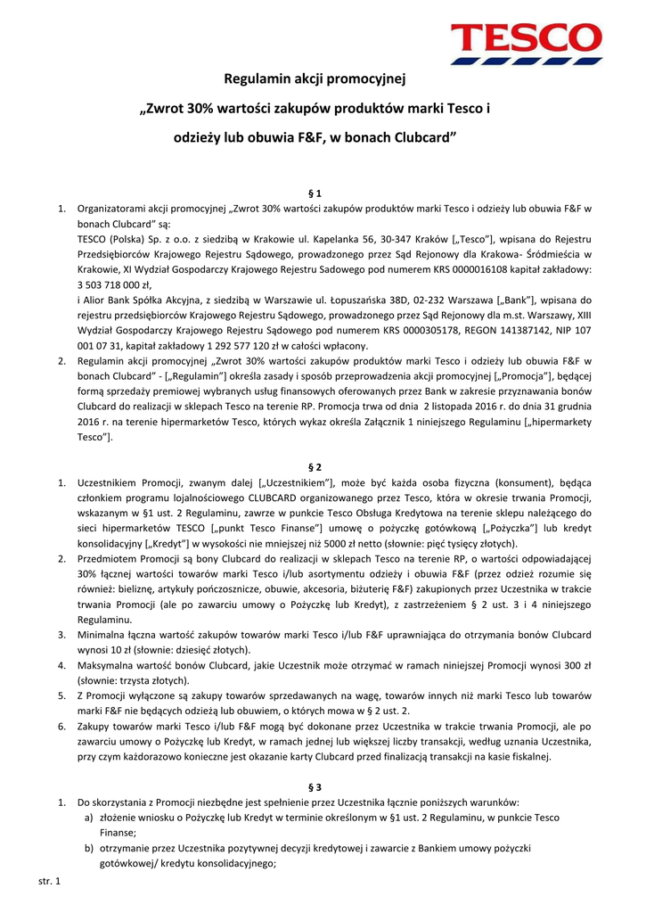 Regulamin akcji promocyjnej „Zwrot 30% wartości zakupów produktów marki Tesco i odzieży lub obuwia F&F, w bonach Clubcard” 1. 2. 1. 2. 3. 4. 5. 6. 1. str. 1 §1 Organizatorami akcji promocyjnej „Zwrot 30% wartości zakupów produktów marki Tesco i odzieży lub obuwia F&F w bonach Clubcard” są: TESCO (Polska) Sp. z o.o. z siedzibą w Krakowie ul. Kapelanka 56, 30-347 Kraków [„Tesco”], wpisana do Rejestru Przedsiębiorców Krajowego Rejestru Sądowego, prowadzonego przez Sąd Rejonowy dla Krakowa- Śródmieścia w Krakowie, XI Wydział Gospodarczy Krajowego Rejestru Sadowego pod numerem KRS 0000016108 kapitał zakładowy: 3 503 718 000 zł, i Alior Bank Spółka Akcyjna, z siedzibą w Warszawie ul. Łopuszańska 38D, 02-232 Warszawa [„Bank”], wpisana do rejestru przedsiębiorców Krajowego Rejestru Sądowego, prowadzonego przez Sąd Rejonowy dla m.st. Warszawy, XIII Wydział Gospodarczy Krajowego Rejestru Sądowego pod numerem KRS 0000305178, REGON 141387142, NIP 107 001 07 31, kapitał zakładowy 1 292 577 120 zł w całości wpłacony. Regulamin akcji promocyjnej „Zwrot 30% wartości zakupów produktów marki Tesco i odzieży lub obuwia F&F w bonach Clubcard” - [„Regulamin”] określa zasady i sposób przeprowadzenia akcji promocyjnej [„Promocja”], będącej formą sprzedaży premiowej wybranych usług finansowych oferowanych przez Bank w zakresie przyznawania bonów Clubcard do realizacji w sklepach Tesco na terenie RP. Promocja trwa od dnia 2 listopada 2016 r. do dnia 31 grudnia 2016 r. na terenie hipermarketów Tesco, których wykaz określa Załącznik 1 niniejszego Regulaminu [„hipermarkety Tesco”]. §2 Uczestnikiem Promocji, zwanym dalej [„Uczestnikiem”], może być każda osoba fizyczna (konsument), będąca członkiem programu lojalnościowego CLUBCARD organizowanego przez Tesco, która w okresie trwania Promocji, wskazanym w §1 ust. 2 Regulaminu, zawrze w punkcie Tesco Obsługa Kredytowa na terenie sklepu należącego do sieci hipermarketów TESCO [„punkt Tesco Finanse”] umowę o pożyczkę gotówkową [„Pożyczka”] lub kredyt konsolidacyjny [„Kredyt”] w wysokości nie mniejszej niż 5000 zł netto (słownie: pięć tysięcy złotych). Przedmiotem Promocji są bony Clubcard do realizacji w sklepach Tesco na terenie RP, o wartości odpowiadającej 30% łącznej wartości towarów marki Tesco i/lub asortymentu odzieży i obuwia F&F (przez odzież rozumie się również: bieliznę, artykuły pończosznicze, obuwie, akcesoria, biżuterię F&F) zakupionych przez Uczestnika w trakcie trwania Promocji (ale po zawarciu umowy o Pożyczkę lub Kredyt), z zastrzeżeniem § 2 ust. 3 i 4 niniejszego Regulaminu. Minimalna łączna wartość zakupów towarów marki Tesco i/lub F&F uprawniająca do otrzymania bonów Clubcard wynosi 10 zł (słownie: dziesięć złotych). Maksymalna wartość bonów Clubcard, jakie Uczestnik może otrzymać w ramach niniejszej Promocji wynosi 300 zł (słownie: trzysta złotych). Z Promocji wyłączone są zakupy towarów sprzedawanych na wagę, towarów innych niż marki Tesco lub towarów marki F&F nie będących odzieżą lub obuwiem, o których mowa w § 2 ust. 2. Zakupy towarów marki Tesco i/lub F&F mogą być dokonane przez Uczestnika w trakcie trwania Promocji, ale po zawarciu umowy o Pożyczkę lub Kredyt, w ramach jednej lub większej liczby transakcji, według uznania Uczestnika, przy czym każdorazowo konieczne jest okazanie karty Clubcard przed finalizacją transakcji na kasie fiskalnej. §3 Do skorzystania z Promocji niezbędne jest spełnienie przez Uczestnika łącznie poniższych warunków: a) złożenie wniosku o Pożyczkę lub Kredyt w terminie określonym w §1 ust. 2 Regulaminu, w punkcie Tesco Finanse; b) otrzymanie przez Uczestnika pozytywnej decyzji kredytowej i zawarcie z Bankiem umowy pożyczki gotówkowej/ kredytu konsolidacyjnego; c) dokonanie w trakcie trwania Promocji, ale po zawarciu umowy o Pożyczkę lub Kredyt, w dowolnym sklepie Tesco na terenie RP zakupu towarów marki Tesco i/lub odzieży lub obuwia marki F&F o łącznej wartości nie mniejszej niż 10 zł; d) pozostawanie członkiem programu Clubcard w trakcie trwania Promocji oraz okazanie karty Clubcard przed finalizacją każdej transakcji obejmującej zakup towarów marki Tesco i/lub F&F. 1. 2. 3. 1. 2. §4 W przypadku spełnienia przez Uczestnika warunków opisanych w §2 i §3 Regulaminu Uczestnik otrzyma bony Clubcard o wartości ustalonej zgodnie z postanowieniami § 2 Regulaminu. Bony Clubcard, o których mowa w zdaniu poprzednim, zostaną przesłane Uczestnikowi na jego adres wskazany przez niego dla celów korzystania z programu Clubcard w ramach wysyłki Wyciągu, o którym mowa w regulaminie programu Clubcard, za kolejny okres rozliczeniowy programu Clubcard. Bony Clubcard mogą zostać zrealizowane w dowolnym sklepie Tesco na terenie RP, w okresie ich ważności uwidocznionym na bonie Clubcard, na zakup towarów znajdujących się w ofercie sklepu Tesco, w którym będą realizowane. Uczestnik może tylko jeden raz skorzystać z Promocji opisanej w niniejszym Regulaminie. §5 W przypadku kiedy umowę o Pożyczkę lub Kredyt zawiera więcej niż jeden Uczestnik, Zniżka przysługuje jednemu z Uczestników, którego numer karty Clubcard został wskazany przez Klienta na etapie składania wniosku. W przypadku odstąpienia przez Uczestnika w trakcie trwania niniejszej Promocji od umowy Pożyczki lub Kredytu na warunkach określonych odpowiednio w umowie o Pożyczkę lub Kredyt Uczestnik traci prawo do otrzymania bonów Clubcard. §6 1. Reklamacje związane z uczestnictwem w Promocji, w zakresie związanym z produktem Banku, Uczestnik może składać w jeden z następujących sposobów: 1) bezpośrednio – poprzez złożenie reklamacji w punkcie Tesco Finanse w hipermarkecie TESCO, 2) korespondencyjnie – poprzez przesłanie reklamacji na adres korespondencyjny Banku: Alior Bank SA ul. Postępu 18B 02-676 Wars
