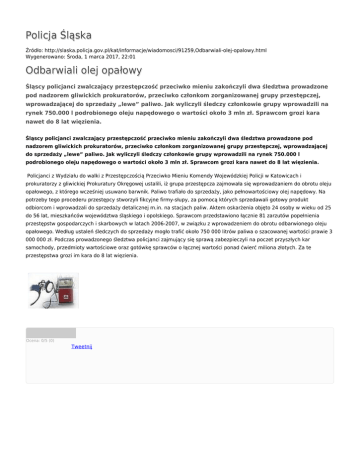 Policja Śląska Źródło: http://slaska.policja.gov.pl/kat/informacje/wiadomosci/91259,Odbarwiali-olej-opalowy.html Wygenerowano: Środa, 1 marca 2017, 22:01 Odbarwiali olej opałowy Śląscy policjanci zwalczający przestępczość przeciwko mieniu zakończyli dwa śledztwa prowadzone pod nadzorem gliwickich prokuratorów, przeciwko członkom zorganizowanej grupy przestępczej, wprowadzającej do sprzedaży „lewe” paliwo. Jak wyliczyli śledczy członkowie grupy wprowadzili na rynek 750.000 l podrobionego oleju napędowego o wartości około 3 mln zł. Sprawcom grozi kara nawet do 8 lat więzienia. Śląscy policjanci zwalczający przestępczość przeciwko mieniu zakończyli dwa śledztwa prowadzone pod nadzorem gliwickich prokuratorów, przeciwko członkom zorganizowanej grupy przestępczej, wprowadzającej do sprzedaży „lewe” paliwo. Jak wyliczyli śledczy członkowie grupy wprowadzili na rynek 750.000 l podrobionego oleju napędowego o wartości około 3 mln zł. Sprawcom grozi kara nawet do 8 lat więzienia. Policjanci z Wydziału do walki z Przestępczością Przeciwko Mieniu Komendy Wojewódzkiej Policji w Katowicach i prokuratorzy z gliwickiej Prokuratury Okręgowej ustalili, iż grupa przestępcza zajmowała się wprowadzaniem do obrotu oleju opałowego, z którego wcześniej usuwano barwnik. Paliwo trafiało do sprzedaży, jako pełnowartościowy olej napędowy. Na potrzeby tego procederu przestępcy stworzyli fikcyjne firmy-słupy, za pomocą których sprzedawali gotowy produkt odbiorcom i wprowadzali do sprzedaży detalicznej m.in. na stacjach paliw. Aktem oskarżenia objęto 24 osoby w wieku od 25 do 56 lat, mieszkańców województwa śląskiego i opolskiego. Sprawcom przedstawiono łącznie 81 zarzutów popełnienia przestępstw gospodarczych i skarbowych w latach 2006-2007, w związku z wprowadzeniem do obrotu odbarwionego oleju opałowego. Według ustaleń śledczych do sprzedaży mogło trafić około 750 000 litrów paliwa o szacowanej wartości prawie 3 000 000 zł. Podczas prowadzonego śledztwa policjanci zajmujący się sprawą zabezpieczyli na poczet przyszłych kar samochody, przedmioty wartościowe oraz gotówkę sprawców o łącznej wartości ponad ćwierć miliona złotych. Za te przestępstwa grozi im kara do 8 lat więzienia. Ocena: 0/5 (0) Tweetnij