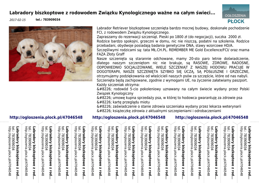Labradory biszkoptowe z rodowodem Związku Kynologicznego ważne na całym świeci... tel.: 783909034 2017-02-15 http://ogloszenia.plock.pl/47046548 Labradory biszkoptowe z rod... tel.: 783909034 http://ogloszenia.plock.pl/47046548 Labradory biszkoptowe z rod... tel.: 783909034 http://ogloszenia.plock.pl/47046548 Labradory biszkoptowe z rod... tel.: 783909034 http://ogloszenia.plock.pl/47046548 Labradory biszkoptowe z rod... tel.: 783909034 http://ogloszenia.plock.pl/47046548 Labradory biszkoptowe z rod... tel.: 783909034 http://ogloszenia.plock.pl/47046548 Labradory biszkoptowe z rod... tel.: 783909034 http://ogloszenia.plock.pl/47046548 Labradory biszkoptowe z rod... tel.: 783909034 http://ogloszenia.plock.pl/47046548 Labradory biszkoptowe z rod... tel.: 783909034 http://ogloszenia.plock.pl/47046548 Labradory biszkoptowe z rod... tel.: 783909034 http://ogloszenia.plock.pl/47046548 Labradory biszkoptowe z rod... tel.: 783909034 http://ogloszenia.plock.pl/47046548 Labradory biszkoptowe z rod... tel.: 783909034 http://ogloszenia.plock.pl/47046548 Labradory biszkoptowe z rod... tel.: 783909034 http://ogloszenia.plock.pl/47046548 Labradory biszkoptowe z rod... tel.: 783909034 http://ogloszenia.plock.pl/47046548 Labradory biszkoptowe z rod... tel.: 783909034 http://ogloszenia.plock.pl/47046548 Labradory biszkoptowe z rod... tel.: 783909034 http://ogloszenia.plock.pl/47046548 Labrador Retriever biszkoptowe szczenięta bardzo mocnej budowy, doskonałe pochodzenie FCI, z rodowodem Związku Kynologicznego. Zapraszamy do rezerwacji szczeniąt. Pieski po 1800 zł (do negocjacji), suczka 2000 zł. Rodzice bardzo spokojni, grzeczni w domu, nic nie niszczą, podatni na szkolenia. Rodzice przebadani, obydwoje posiadają badania genetyczne DNA, stawy wzorcowe HD/A. Szczęśliwymi rodzicami są: tata MŁ.CH.PL. REMEMBER ME Gold Excellence/FCI/ oraz mama FAZA Złoty Graff Nasze szczenięta są starannie odchowane, mamy 20-sto paro letnie doświadczenie, dlatego naszym szczeniętom nic nie brakuje, są RASOWE, ZDROWE, RADOSNE, ODPOWIEDNIO SOCJALIZOWANE, WIELE SZCZENIĄT Z NASZEJ HODOWLI PRACUJE W DOGOTERAPII, NASZE SZCZENIĘTA SZYBKO SIĘ UCZĄ, SĄ POSŁUSZNE I GRZECZNE, otrzymujemy podziękowania od właścicieli naszych psów za szczęście, które od nas nabyli. Szczenięta będą zachipowane, zgodnie z wymogami UE, na życzenie załatwiamy paszport. Każdy szczeniak otrzyma: • rodowód 5-cio pokoleniowy uznawany na całym świecie wydany przez Polski Związek Kynologiczny • umowę kupna sprzedaży psa, w której to hodowca gwarantuję za zdrowie psa • kartę przeglądu miotu • zaświadczenie o stanie zdrowia szczeniaka wydany przez lekarza weterynarii • książeczkę zdrowia z aktualnymi szczepieniami i odrobaczeniami • pisemną instrukcję postępowania ze szczeniakiem http://ogloszenia.plock.pl/47046548 http://ogloszenia.plock.pl/47046548 • wyprawkę firmy Royal Canin • kserokopię rodowodu matki • kserokopię rodowodu ojca Maluchy od urodzenia wychowywane są w warunkach domowych, gdzie pod czujnym okiem całej rodziny uczą się wszystkich niezbędnych czynności, które z całą pewnością ułatwią im adaptacje w nowych warunkach. Szczeniaki są przyzwyczajane do codziennych hałasów, uczone są zarówno podróży autem jak i załatwiania swoich potrzeb w wyznaczone miejsce. To wszystko gwarantuje odpowiednią socjalizację i buduje prawidłowe relacje na płaszczyźnie człowiek - pies, co jest nie bez znaczenia w późniejszym funkcjonowaniu takiego szczenięcia w jego nowym domu, w którym powinien odnaleźć się szybko i bez większych problemów. Wystawianie szczeniąt nie jest obowiązkowe, nie musisz chodzić na wystawy, jednak mając pieska z rodowodem możesz go zacząć wystawiać w każdej chwili bez względu na wiek psa, masz też gwarancję, że posiadasz psa rasowego po zdrowych i przebadanych rodzicach.