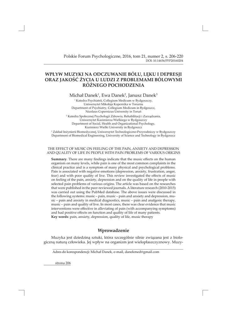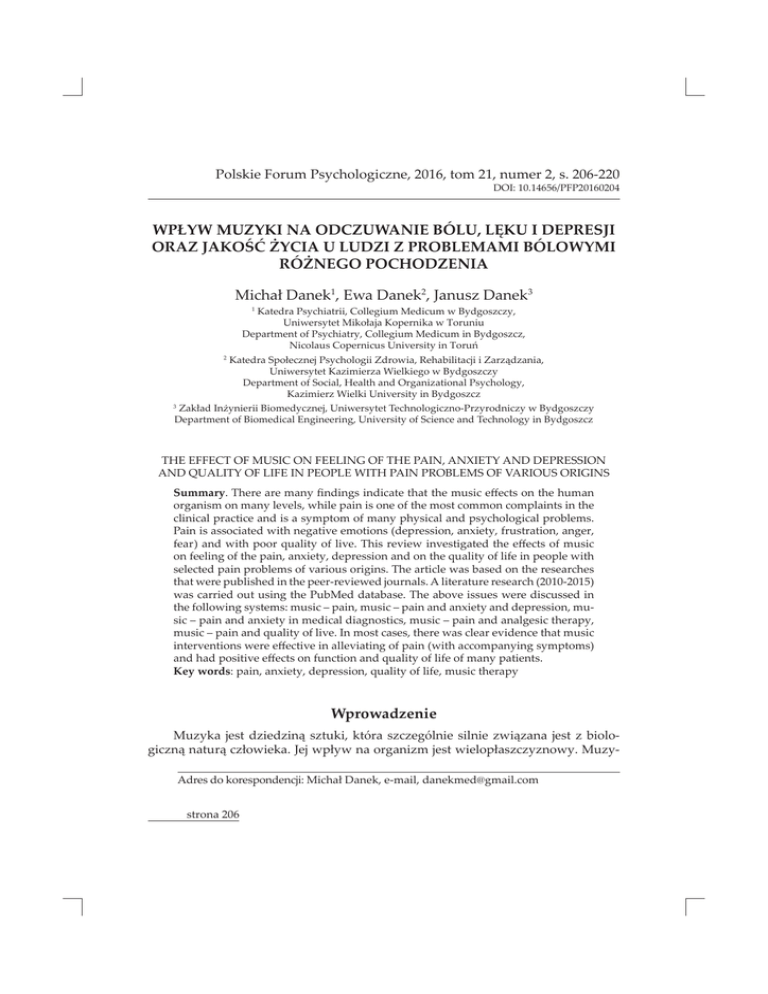Polskie Forum Psychologiczne, 2016, tom 21, numer 2, s. 206-220 DZȱŗŖǯŗŚŜśŜȦŘŖŗŜŖŘŖŚ RȱȱȱȱXǰȱ9ȱȱȱ ȱg)ȱ ȱȱȱȱȱXȱ X ȱ Ùȱ1, Ewa Danek2, Janusz Danek3 1 Katedra Psychiatrii, Collegium Medicum w Bydgoszczy, ¢ȱÙȱȱ ȱ Department of Psychiatry, Collegium Medicum in Bydgoszcz, ȱȱ¢ȱȱÚ 2 ȱȱÙ£ȱ¢ȱ ǰȱȱȱ££ǰȱ Uniwersytet Kazimierza Wielkiego w Bydgoszczy Department of Social, Health and Organizational Psychology, Kazimierz Wielki University in Bydgoszcz ȱÙȱČ¢ȱ¢£ǰȱ ¢ȱ£Ȭ£¢£¢ȱ ȱ¢££¢ȱ Department of Biomedical Engineering, University of Science and Technology in Bydgoszcz 3 THE EFFECT OF MUSIC ON FEELING OF THE PAIN, ANXIETY AND DEPRESSION AND QUALITY OF LIFE IN PEOPLE WITH PAIN PROBLEMS OF VARIOUS ORIGINS Summaryǯȱȱȱ¢ȱęȱȱȱȱȱěȱȱȱȱ organism on many levels, while pain is one of the most common complaints in the ȱȱȱȱȱ¢ȱȱ¢ȱ¢ȱȱ¢ȱǯȱ ȱȱȱ ȱȱȱǻǰȱ¡¢ǰȱǰȱǰȱ Ǽȱȱ ȱȱ¢ȱȱǯȱȱ ȱȱȱěȱȱȱ ȱȱȱȱǰȱ¡¢ǰȱȱȱȱȱ¢ȱȱȱȱȱ ȱ ȱȱȱȱȱǯȱȱȱ ȱȱȱȱȱ ȱ ȱȱȱȱȬ ȱ.ȱȱȱȱǻŘŖŗŖȬŘŖŗśǼȱ ȱȱȱȱȱȱǯȱȱȱȱ ȱȱȱ ȱ ȱ¢DZȱȱȮȱǰȱȱȮȱȱȱ¡¢ȱȱǰȱȱȮȱȱȱ¡¢ȱȱȱǰȱȱȮȱȱȱȱ¢ǰȱ ȱȮȱȱȱ¢ȱȱǯȱȱȱǰȱȱ ȱȱȱȱȱ ȱ ȱěȱȱȱȱȱǻ ȱ¢ȱ¢Ǽȱ ȱȱȱěȱȱȱȱ¢ȱȱȱ many patients. Key wordsDZ ǰȱ¡¢ǰȱǰȱ¢ȱȱǰȱȱ¢ Wprowadzenie £¢ȱ ȱ ££ȱ £ǰȱ àȱ ££àȱ ȱ £ £ȱ ȱ £ȱ £ȱȱ£Ù ǯȱȱ Ù¢ ȱȱ£ȱȱ Ù££¢£ ¢ǯȱ£¢ȱȱDZȱÙȱǰȱȬǰȱȓǯȱ strona 206 ȱ¢ £ȱ£¢ïȱ棣ȱǻ ȱ¢ȱ ¢ Ǽȱ£ȱČȱ Ù¢ °ȱ ȱ ȱ à ȱ ££¢ȱ ȱ £ȱ £Ù ǰȱ à Čȱ ȱ £ȱ komórkowym (Lestard Ndos i in.ǰȱ ŘŖŗřDzȱ ȱ ȱ ǯǰȱ ŘŖŗŚDzȱ ȱ ȱ ǯǰȱ ŘŖŗśǼǯȱ £ȱĊà ȱ£¢£¢ȱ¢ £ȱ ¢ȱ£¢ȱ࣠ǰȱ ȱ¢ȱ ¢ȱ£ȱȱ£ȱǻȱȱǯǰȱŘŖŗŖDzȱȱȱǯǰȱŘŖŗśǼǯȱ £Ù¢ȱ ȱȱȱȱ£ £¿¢ȱǻ¢ǰȱǰȱŘŖŗŗǼǯ £¢ȱ ££ȱȱȱȱ£Ù ȱǻóȱȱǯǰȱŘŖŗŗDzȱǰȱóǰȱ ŘŖŗŘDzȱȬȱȱǯǰȱŘŖŗřǼǯȱȱ¢ȱ£Ùȱ £ȱ¿ȱȱ£ £Ùȱ£Č¢ȱȱǰȱàȱȱ£ £ȱ£ȱ¿ȱï¢ȱȱ ¿ï ¢ȱ£ȱ£Č¢ ȱà ȱ ¿£ȱ£Ċǰȱǯȱ £¢ȱȱȱȱȱȱ¢ȱ£ȱ£¢ȱ¿ȱȱ¿ ǰȱȱ ȱ Čȱ ȱ ȱ ȱ ¢£¢ȱ ǻȱ ȱ ǯǰȱ ŘŖŗŖDzȱ ȱ ȱ ǯǰȱ ŘŖŗŚDzȱ ȱȱǯǰȱŘŖŗśǼǯȱ £¢ȱȱ£ ȱàȱ££ȱ Ù¢ ȱȱ¢ ï°ȱ ¢¢ȱ £à ȱÙȱàȱǻ ȱȱǯǰȱŘŖŗřDzȱȱȱǯǰȱŘŖŗŚǼǯ àȱ ȱ ȱęȱȱ Čȱ¢¢£¢ȱǻï £ȱ¢ ¢Ǽȱ ¢ȱȱ Ù¢ ȱĊà ȱà ¢ǯȱàȱȱ£ ȱ ¢ȱ ȱ £àČȱ ¿ȱ ȱ ȱ £à ǯȱ ȱ ¢ęȱ 棣ȱ £àČ¢ȱ àȱ ¢ȱ Ȯȱ ¢¢ ¢ǰȱ ¿¢ȱ ȱ Čnienia specjalnej klasy receptorów zwanych nocyceptorami oraz niereceptorowy – ¢£¢ǰȱà¢ȱ ȱ ȱ ¢ȱǰȱ£££ȱȱ¢ȱï¢ȱȱÙȱ ȱǻà£ǰȱ£ȱ¿ ǰȱ à ȱ ¢Ǽǯȱ ¢ȱ £¢Ùȱ àȱ ¢£ȱ ȱ àȱ ¢¢ǰȱ à¢ȱ Čȱ¢°ȱȱ£ȱ££ǰȱȱȱ ȱȱ ¢ǯȱ àȱ ¢¢ǰȱ ££àȱ £ Ù¢ȱ £ȱ ȱ £¢ȱ ¿ȱàȱ¢ȱǻ££ȱȱǯǰȱŘŖŗŚǼǯȱ £¢ȱȱÙȱ棢£ȱàȱ£¢ȱ¿ȱàȱ¢ȱǻȱ ȱ£¢£¢ȱČ¢ȱ ȱ£ȱ¢£Ǽǯȱàȱ¢¢ǰȱï¢ȱ ȱ¢ęȱȬȱǻȱȱȱȱȱȱǼȱȱ£ȱ ££ȱà ȱǻȱǼȱ££ȱ¿ȱȱĵ ǯȱ££Úȱ£¢ȱ (ȱǼȱȱ ȱ¿ȱ ȱ£ £ȱ£ȱĚȱ¢ȱȱȱ ¢Ù£¢ǯȱ àȱ ¢¢ȱ ȱ £ȱ ¢ȱ ȱ ££ȱ£ȱ £¿ȱȱČ ï°ȱ¢ ȱ ïǯȱàȱ£¢ȱà Čȱȱ ¢ȱȱ£ Ù¢ǰȱ£¢ȱ£¢ȱȱȱȱ£ ȱ£ȱ£ÙČ¢ǰȱȱ ȱ£ǯȱÙȱ£¢¢ȱ¿ȱàȱ Ù¢ ȱ£¢ȱ ȱÙ¢ȱ£ȱȱȱ ȱȱ¢ǰȱ ȱ¢ȱ¿ǰȱ¿ǰȱ ȱȱȱǻ¢ȱȱǯǰȱŘŖŖŗǼǯ ¿ȱ ǻ£ ¢ȱ ȱ ¢Ǽȱ ȱ ¢ ¢ȱ ȱ ¢ȱ £ £¢ȱ £ȱ£ ¢ ȱ£ǰȱ£ȱ£ £ȱȱ£ȱ£ȱ £ȱ£ǰȱ££Ú ǰȱ ¢ȱ¿ȱȱàǰȱ£ȱ¿ǰȱ¿ ȱȱ£Čǯȱȱ¿ȱ¢ȱ¿ȱČȱ¢°ȱ ¢ǰȱ£¢ȱȱ¢ȱǻȱȮȱ¡¢Ǽȱ£ȱ£¢ȱ¿ǰȱ Ùȱȱ ïǰȱ ¢Čȱ ïȱ ȱ ȱ ¿ȱ ȱ ¢ȱ ¢ȱ – jako cecha (ȱȮȱ¡¢ǼȱǻǰȱǰȱŘŖŗśǼǯȱ¿ȱȱ£¿¢ȱ££ȱ strona 207 ¢ȱ ¢ȱ ȱ ȱȱ¢£¢ȱǻȱȱǯǰȱ ŘŖŗŖDzȱǰȱŘŖŗŘDzȱȱȱǯǰȱŘŖŗśǼǯȱ¿£¢ȱàȱ ¢Č¢ȱ ȱȱǻȱ ȱ ȱ ȱ Ǽȱ ȱ ¿ȱ ¢Č¢ȱ ȱ ȱ ǻȱ¡¢ȱ Ǽȱ ȱ Ȭȱ ( ȱ¡¢ȱ ȱ Ǽȱ ȱ ǰȱ ȱ ¢£ȱ ȱ ¢¢£ȱ ¢ȱȱ£Ùȱ¢ ȱȱ¢£ȱȮȱȱǻȱȱǼȱǻȱ ȱǯǰȱŘŖŗśǼǯȱ£ȱ¢ȱǻȬȱȱ£ȱǼȱȱ£àÙȱ à ȱ ¢¢ȱ ¢¿¢ȱ ȱ£ȱ££Úȱǯ Ùȱ¢ęȱ ICD-10 (ȱęȱȱȱȱȱ ȱȱŗŖǼȱ ¢àČȱ ¿ȱ £ȱ ££Úȱ ¢¢ǰȱ ȱ ¢ȱ £ȱ ££ȱ ¢ǰȱ àȱȱ¢°ȱ ¢ Ùǰȱ¿£¢ȱ¢ǰȱ££ȱàČȱ¢ȱ£ £ȱ£ȱȱ ¢£¢ȱ ȱ Ù ¢ǯȱ ȱ ¢ȱ £ȱ ££ȱ ¢¢ȱ £ȱ¿ȱàȱàČȱ£ȱǻȱȱǯǰȱŘŖŗśDzȱ ǰȱǰȱǰȱ ŘŖŗśDzȱȱȱǯǰȱŘŖŗśǼǯȱ ȱàȱ£ ¢ȱàȱȱ £ȱ£ȱ ȱȱ¢ȱ¢£ȱ ȱȱ££ȱȱ ǯȱȱà ȱȱ£ ¢ȱ£ȱ£ǰȱ ȱ à £ǰȱ¢ȱàČȱȱȱ£Ùȱ£ à ¢ȱȱ ȱ ǻ££àȱ £¢ȱ £ÙČ¢ȱ ȱ à ¢Ǽȱ ȱ £ ¿ ¢ǰȱ £ ¢¢ǰȱ ¢Č£¢ȱàȱȱȱàǯȱȱȱàȱȱ¿ȱČȱàČȱ¢ȱ¢£ȱǻ¢¿ǰȱ¿ȱ ǰȱ £¿Ȧ£¿Ǽȱ £ȱ ¢ȱ ¢ ǰȱ ȱ à¢ȱ ȱ Č¢ȱČȱȱ£¢ȱǻ ǰȱǰȱ ǰȱŘŖŗřDzȱǰȱŘŖŗŚDzȱ ¢ȱȱǯǰȱŘŖŗśDzȱǰȱǰȱǰȱŘŖŗśǼǯȱ ȱ ȱ ȱ £¢ȱ £ȱ ¿ȱ à Čǰȱ ȱ Čȱ ££àȱ ȱ £ £ȱ £¢ȱ £ȱ Ȧ£ ȱ ȱ ïȱ Č¢ȱ £Ù ǯȱ ȱ ¿ȱ ¢£¢ȱ£¢ȱȦȱȱà ȱǻĊ ¿ǰȱ¢ǰȱȱȱǼȱ ȱ ¿ȱ ¿£ȱ à ȱ £ȱ £ȱ £ȱ ȱ Ȭȱ ȱǰȱȱ ȱ ȱ£ȱïȱČ¢ǯȱȱ¢¢ȱ£Ù ȱ ï°ȱČ¢ȱ £ȱ¿ȱȱ¿ȱïȱČ¢ȱ ȱ£ ȱǯȱȱȱïȱČ¢ȱȱ£ȱ¢ȱ¢ȱ ȱà ǰȱ ȱ¢ȱ £ȱ¢ȱ¢£ȱȱ¢£ȱ£ȱ£ǰȱȱ¢£ǰȱ ȱČȱȱȱǻȱȱǯǰȱŘŖŗŚDzȱûǰȱǰȱŘŖŗśDzȱǰȱǰȱŘŖŗśDzȱǰȱǰȱǰȱŘŖŗśDzȱȱȱǯǰȱŘŖŗśDzȱȬȱȱǯǰȱŘŖŗśǼǯȱ ȱ £ȱ ȱ ¢Ùȱ à ǰȱ ȱ ȱ £¢ȱ ǻŘŖŗŖȬŘŖŗśǼȱÚȱ ¢ȱ¿¢ȱ ȱ£ȱǰȱ Ù¢ ȱ£¢ȱ ȱ £ ȱ àȱ £ȱ ȱ £ ¢ȱ ¿ǰȱ ȱ ȱ ȱ ï°ȱ Č¢ȱ ȱ àǰȱ ȱà¢ȱ £ȱ¢ȱà ȱȱàČȱǯȱ ¢Č£ȱ£ȱ £Ù¢ȱà ȱǻȱŗȬŜǼȱ ȱ¿¢ȱÙDZȱ£¢ȱȮȱàDzȱ£¢ȱȮȱ àǰȱ¿ȱȱDzȱ£¢ȱȮȱàȱȱ¿ȱ ȱ£ ȱ¢£¢Dzȱ£¢ȱȮȱàȱ ȱ£ȱ£ à Dzȱ£¢ȱȮȱàȱȱï°ȱČ¢ȱà ǯ strona 208 