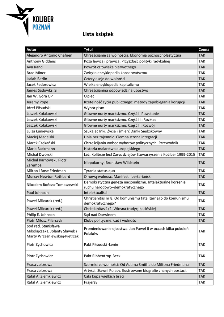 Lista książek Autor Alejandro Antonio Chafuen Anthony Giddens Ayn Rand Brad Miner Isaiah Berlin Jacek Fedorowicz James Sadowksi Si Jan W. Góra OP Jeremy Pope Józef Piłsudski Leszek Kołakowski Leszek Kołakowski Leszek Kołakowski Luiza Łuniewska Maciej Madelski Marek Czekaoski Maria Backmann Michał Dworski Michał Karnowski, Piotr Zaremba Milton i Rose Friedman Murray Newton Rothbard Nikodem Boocza-Tomaszewski Paul Johnson Paweł Milcarek (red.) Paweł Milcarek (red.) Philip E. Johnson Piotr Miłosz Pilarczyk pod red. Stanisława Mikołajczaka, Jolanty Sławek i Marty Wrześniewskiej-Pietrzak Tytuł Chrześcijanie za wolnością. Ekonomia późnoscholastyczna Poza lewicą i prawicą. Przyszłośd polityki radykalnej Powrót człowieka pierwotnego Zwięzła encyklopedia konserwatyzmu Cztery eseje do wolności Wielka encyklopedia kapitalizmu Chrześcijanina odpowiedź na ubóstwo Ojciec Rzetelnośd życia publicznego: metody zapobiegania korupcji Wybór pism Główne nurty marksizmu. Częśd I: Powstanie Główne nurty marksizmu. Częśd III: Rozkład Główne nurty marksizmu. Częśd II: Rozwój Szukając Inki. Życie i śmierd Danki Siedzikówny Unia bez tajemnic. Ciemna strona integracji Chrześcijanin wobec wyborów politycznych. Przewodnik Historia malarstwa europejskiego Led, Kolibrze led! Zarys dziejów Stowarzyszenia KoLiber 1999-2015 Cenna TAK TAK TAK TAK TAK TAK TAK TAK TAK TAK TAK TAK TAK TAK TAK TAK TAK TAK Niepokorny. Bronisław Wildstein TAK Tyrania status quo O nową wolnosd. Manifest libertariaoski Demokratyczna geneza nacjonalizmu. Intelektualne korzenie ruchu narodowo–demokratycznego Intelektualiści Christianitas nr 8. Od komunizmu tatalitarnego do komunizmu demokratycznego? Christianitas 1/2. Wiosna tradycji łacioskiej Sąd nad Darwinem Kluby polityczne. Ład i wolnośd TAK TAK TAK TAK TAK TAK TAK TAK Promieniowanie ojcostwa. Jan Paweł II w oczach kilku pokoleo Polaków TAK Piotr Zychowicz Pakt Piłsudski -Lenin TAK Piotr Zychowicz Pakt Ribbentrop-Beck TAK Praca zbiorowa Praca zbiorowa Rafał A. Ziemkiewicz Rafał A. Ziemkiewicz Szermierze wolności: Od Adama Smitha do Miltona Friedmana Artyści. Sławni Polacy. Ilustrowane biografie znanych postaci. Cała kupa wielkich braci Frajerzy TAK TAK TAK TAK Rafał A. Ziemkiewicz Rafał A. Ziemkiewicz Rafał A. Ziemkiewicz Rafał A. Ziemkiewicz Robert Gwiazdowski Roger Scruton Stanisław Cat-Mackiewicz Stefan Zabieglik Tadeusz Płużaoski Ted Honderich Tomasz Teluk Wacław Wilczyoski Wojciech Kłosowski, Jacek Warda Wolfgang Wickler Ayn Rand Cyril Northcote Parkinson Dario Fo Dariusz Hybel Epiktet Frédéric Bastiat Friedrich August von Hayek Hernando de Soto Jacek Łuczak John Ehrman Joseph Kardynał Ratzinger Józef Tarnowski (red.) Karl Adam Katarzyna Sójka-Zielioska Ken Schoolland ks. Kazimierz Pielatowski Leon XIII Ludwig von Mises Marcin Libicki Marian Zdiechowski Michał Wojciechowski Michał Wojciechowski Piotr Niszczor Viagra mad Polactwo Pieprzony los kataryniarza Walc stulecia Ekonomiczny aspekt opodatkowania Co znaczy konserwatyzm Europa in flagranti Adam Smith. Seria "Myśli i ludzie" Lista Oprawców Ile mamy wolności? Problem determinizmu Mitologia efektu cieplarnianego Wrogie paostwo opiekuocze czyli trudna droga Polski do gospodarki rynkowej TAK TAK TAK TAK TAK TAK TAK TAK TAK TAK TAK Wyspy szans. Jak budowad strategie rozwoju lokalnego? TAK Biologia dziesięciu przykazao. Dlaczego natura nie jest dla nas wzorem. Hymn Prawo Parkinsona czyli w pogoni za postępem Przypadkowa śmierd anarchisty UE – w drodze do totalitarnego paostwa Byd wolnym Co widad i czego nie widad Zgubna pycha rozumu. O błędach socjalizmu Tajemnica kapitału - dlaczego kapitalizm triumfuje na zachodzie, a zawodzi gdzie indziej Wielkopolska. Przewodnik turystyczny Neokonserwatyzm Czas przemian w Europie. Miejsce Kościoła i świata Filozofia liberalizmu Natura katolicyzmu Drogi i bezdroża prawa. Drogi i bezdroża prawa. Szkice z dziejów kultury prawnej Europy Przygody Jonatana Poczciwego: Odyseja wolnego rynku Uśmiech Jana Pawła II Rerum Novarum o kwestii socjalnej Biurokracja Cywilizacja u progu trzeciego tysiąclecia. Konstatacje i przestrogi Widmo przyszłości Wiara - Cywilizacja - Polityka W ustroju biurokratycznym Jak rozpętałem aferę taśmową TAK TAK NIE NIE NIE NIE NIE NIE NIE NIE NIE NIE NIE NIE NIE NIE NIE NIE NIE NIE NIE NIE NIE NIE NIE Pod red. Mariusza Staniszewskiego Praca zbiorowa Ryszard Legutko Ryszard Wytrych Samuel P. Huntington Stan Spielberg Tomasz P. Terlikowski Tomasz Teluk Rzeczy Wspólne nr 8 (2/2012) NIE Mały przewodnik po Polsce Czasy wielkiej imitacji Orły na śniegu Zderzenie cywilizacji Socjaldemokratyczny park Pojedynki Libertarianizm - teoria paostwa NIE NIE NIE NIE NIE NIE NIE
