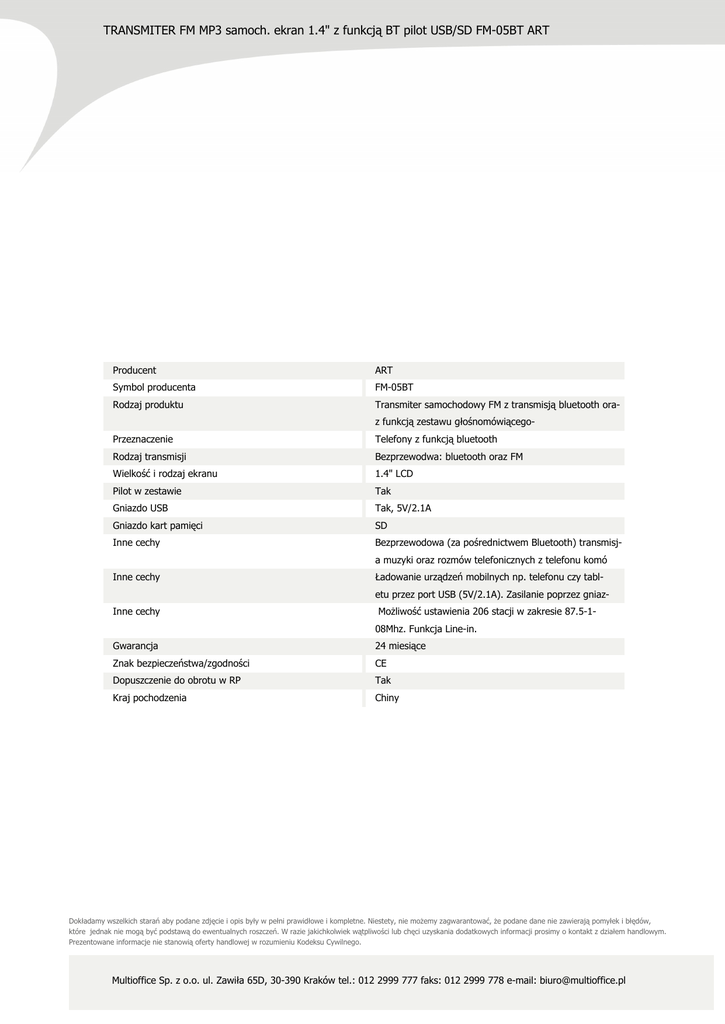 TRANSMITER FM MP3 samoch. ekran 1.4" z funkcją BT pilot USB/SD FM-05BT ART Producent ART Symbol producenta FM-05BT Rodzaj produktu Transmiter samochodowy FM z transmisją bluetooth oraz funkcją zestawu głośnomówiącego- Przeznaczenie Telefony z funkcją bluetooth Rodzaj transmisji Bezprzewodwa: bluetooth oraz FM Wielkość i rodzaj ekranu 1.4" LCD Pilot w zestawie Tak Gniazdo USB Tak, 5V/2.1A Gniazdo kart pamięci SD Inne cechy Bezprzewodowa (za pośrednictwem Bluetooth) transmisja muzyki oraz rozmów telefonicznych z telefonu komó Inne cechy Ładowanie urządzeń mobilnych np. telefonu czy tabletu przez port USB (5V/2.1A). Zasilanie poprzez gniaz- Inne cechy Możliwość ustawienia 206 stacji w zakresie 87.5-108Mhz. Funkcja Line-in. Gwarancja 24 miesiące Znak bezpieczeństwa/zgodności CE Dopuszczenie do obrotu w RP Tak Kraj pochodzenia Chiny Dokładamy wszelkich starań aby podane zdjęcie i opis były w pełni prawidłowe i kompletne. Niestety, nie możemy zagwarantować, że podane dane nie zawierają pomyłek i błędów, które jednak nie mogą być podstawą do ewentualnych roszczeń. W razie jakichkolwiek wątpliwości lub chęci uzyskania dodatkowych informacji prosimy o kontakt z działem handlowym. Prezentowane informacje nie stanowią oferty handlowej w rozumieniu Kodeksu Cywilnego. Multioffice Sp. z o.o. ul. Zawiła 65D, 30-390 Kraków tel.: 012 2999 777 faks: 012 2999 778 e-mail: [email protected]