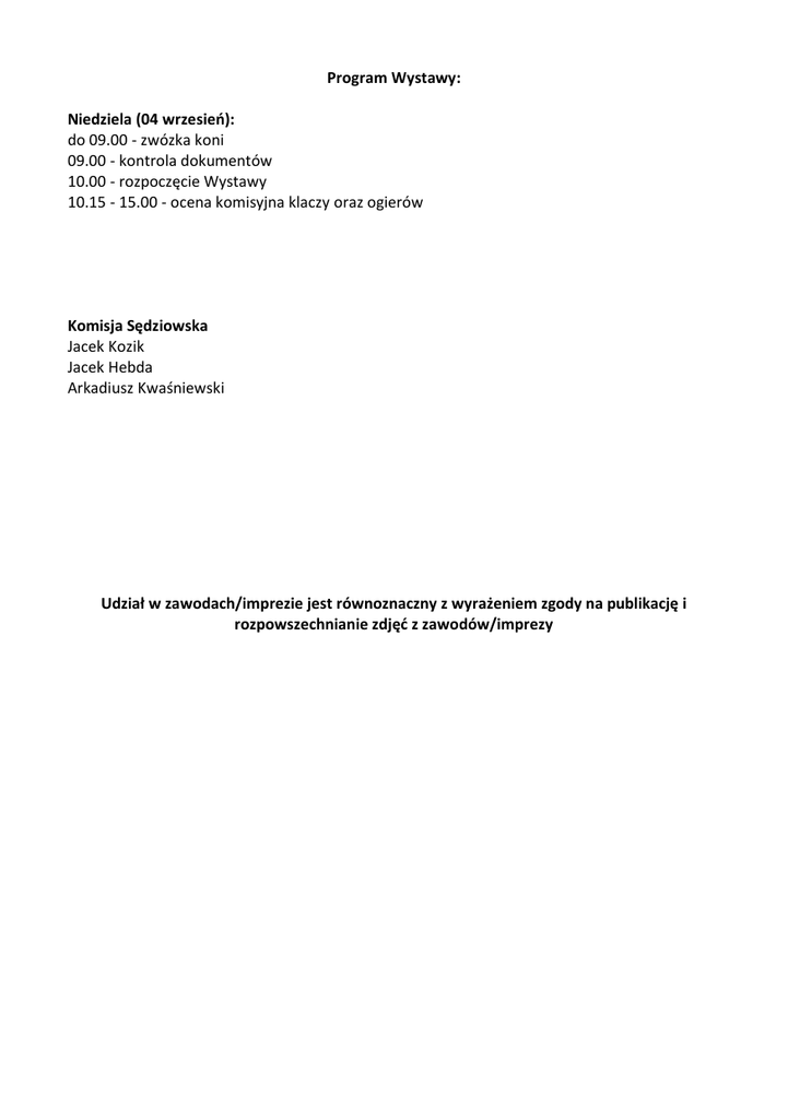 Program Wystawy: Niedziela (04 wrzesień): do 09.00 - zwózka koni 09.00 - kontrola dokumentów 10.00 - rozpoczęcie Wystawy 10.15 - 15.00 - ocena komisyjna klaczy oraz ogierów Komisja Sędziowska Jacek Kozik Jacek Hebda Arkadiusz Kwaśniewski Udział w zawodach/imprezie jest równoznaczny z wyrażeniem zgody na publikację i rozpowszechnianie zdjęć z zawodów/imprezy REGULAMIN WYSTAWY KLACZY – SIEDLCE 2016 I Organizatorzy: Wojewódzki Związek Hodowców Koni w Warszawie II Patronat: MODR Siedlce III Data i miejsce wystawy: 04.09.2016 r. – MODR Siedlce IV Warunki uczestnictwa w wystawie W wystawie mogą brać udział klacze i ogiery, które posiadają licencję hodowlaną wpis do księgi stadnej koni rasy: małopolskiej, wielkopolskiej, polski koń szlachetny półkrwi, śląskiej, huculskiej, konik polski, polski koń zimnokrwisty. Brak udziału w dekoracji w dniu 04.09.2016 pozbawia klacz lub ogiera prawa do klasyfikacji i zdobytych nagród, nagrody finansowe są wypłacane tylko Członkom WZHK w Warszawie, którzy opłacili składkę członkowską w roku 2015 lub 2016. Nie dopuszcza się klaczy, które w poprzednich latach na wystawie w Siedlcach zajęły pierwsze miejsce lub uzyskały tytuł czempionki w swojej klasie, czy tytuł Czempionki Wystawy. Wszystkie konie muszą posiadać paszport hodowlany (zarejestrowany w Centralnej Bazie Danych Koniowatych) z wpisem aktualnego właściciela konia. Wszystkie konie muszą posiadać potwierdzenie aktualnych szczepień przeciwko grypie wpisane do paszportu. Środki służące do transportu winny być poddane dezynfekcji, potwierdzone stosownym zaświadczeniem od lekarza weterynarii (honorowane również paragony, faktury za zakup środka odkażającego) Konie powinny być odpowiednio wypielęgnowane (czyste, wyczesane) oraz prawidłowo okiełznane (wędzidło gładkie, jeżeli ma 2 kółka to wodze zapięte za 2 kółka, wodze skórzane). Wszystkich wystawców obowiązuje schludny ubiór, odpowiedni przy prezentacji koni oraz regulamin panujący na terenie MODR Siedlce. Właściciel lub osoba przez niego upoważniona, okazująca brak szacunku względem jednej lub kilku osób oficjalnych (organizatora, sędziego, lekarza wet., asystenta, sekretarza), zostanie natychmiastowo wyłączona z wystawy decyzją Przewodniczącego lub Organizatora. Dotyczy to również prezenterów i osób poganiających konie. Organizator zastrzega sobie prawo do wprowadzania zmian w programie. Organizator nie ubezpiecza ludzi, koni, transportu na czas trwania imprezy oraz nie ponosi odpowiedzialności za wypadki, kradzieże i zdarzenia losowe mające miejsce w tym czasie. V Komisja Oceny: Oceny koni dokonuje komisja w składzie 3 osobowym powołana przez Wojewódzki Związek Hodowców Koni w Warszawie. Ocena komisji jest jedną wspólną notą, opatrzoną indywidualnym komentarzem dla każdego konia. Komisja podaje wyniki do publicznej wiadomości. Wyniki oceny są ostateczne, nie przewiduje się odwołań. W przypadku jednakowej liczby punktów o wyższym miejscu zadecyduje najwyższa liczba punktów przyznana za typ. O ile ocena za typ będzie również taka sama, o przyznaniu pierwszego miejsca zadecyduje wyższa ocena za ruch (stęp i kłus łącznie). Jeżeli i w tym przypadku oceny sędziów będą jednakowe, o przyznaniu pierwszego miejsca zadecyduje komisja sędziowska. Ocena wystawowa: - We wszystkich klasach konie pokazywane są w ręku - w stępie i kłusie oraz w pozycji „stój” - Rywalizacja odbywa się w następujących klasach: I-II - klacze ras zimnokrwistych III - ogiery ras zimnokrwistych IV - klacze rasy śląskiej V - klacze ras szlachetnych VI - klacze i ogiery konie małe w ocenie indywidualnej koni komisja stosuje skalę od 1 do 10 pkt. (co 0,5 pkt.) za następujące elementy: 1. typ 2. pokrój 3. stęp 4. kłus 5. kondycja, pielęgnacja i przygotowanie do wystawy. Dla koni polski koń zimnokrwisty cechy podlegające ocenie i skale ocen określiła komisja ksiąg stadnych i wygląda to następująco: 1. za typ max 10 pkt 2. za pokrój (głowa, szyja, kłoda) max 10 pkt 3. nogi i kopyta max 10 pkt 4. stęp max 10 pkt 5. kłus max 10 pkt 6. wrażenie ogólne max -5 pkt* *W elemencie „wrażenie ogólne” są to punkty ujemne, odejmowane od całości oceny. W ocenie będą brane pod uwagę: pielęgnacja (czystość sierści i ogona, stan grzywy, korekcja kopyt), kondycja (otłuszczenie, słaba kondycja, zarobaczenie), limfatyczność (opoje, wypryski, suchość stawów),nakostniaki przygotowanie konia do prezentacji w ręku, współpraca konia z prezenterem. Komisja ma prawo odmówić oceny konia, który jest: kulawy, zraniony, niebezpieczny lub nieprzygotowany do pokazu Nadużywanie bata oraz innych przedmiotów służących do nadmiernego pobudzania koni jest zabronione podczas trwania pokazu Warunkiem rozegrania czempionatu rasowego jest uczestnictwo min. 5 klaczy w grupie. Czempionką w danej rasie zostaje klacz która uzyskała największą ilość punktów. W przypadku jednakowej liczby punktów o wyższym miejscu zadecyduje najwyższa liczba punktów przyznana za typ. O ile ocena za typ będzie również taka sama, o przyznaniu pierwszego miejsca zadecyduje wyższa ocena za ruch (stęp i kłus łącznie). Jeżeli i w tym przypadku oceny sędziów będą jednakowe, o przyznaniu pierwszego miejsca zadecyduje komisja sędziowska. Po ocenie wszystkich klas Komisja Sędziowska dokonuje wyboru Najlepszej Klaczy Wystawy. Spośród czempionek wszystkich ras komisja wybiera - Najlepszą Klacz Wystawy, która w oczach komisji zaprezentowała się najlepiej (nie musi to być klacz z najwyższą oceną punktową). VI Katalog: Sporządzony jest w oparciu o dokumenty hodowlane znajdujące się w Wojewódzkim Związku Hodowców Koni w Warszawie. KOLEJNOŚĆ PREZENTOWANIA KONI NAZWA RASA NR LICENCJI WŁAŚCICIEL 1 SORELLA z 2842 G Wr DMOWSKI MIROSŁAW BASTYLIA z 3403 G Ol MRÓZ WOJCIECH AMANDA z 6876 G Wr KOSIERADZKI REMIGIUSZ GORA z 6552 G 