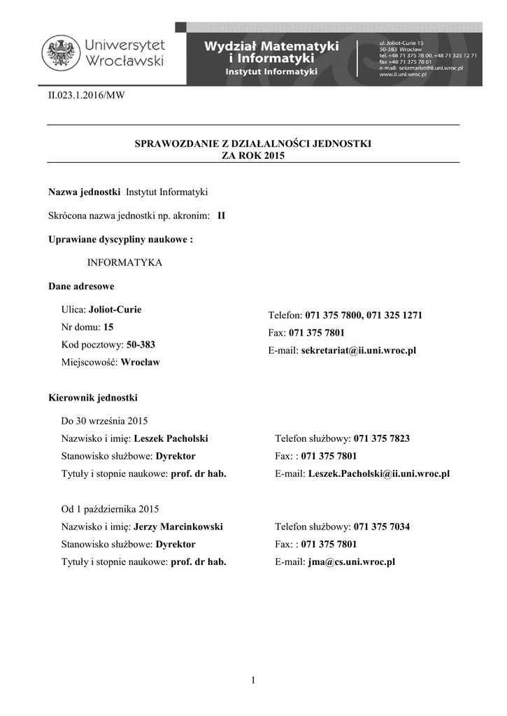 II.023.1.2016/MW SPRAWOZDANIE Z DZIAŁALNOŚCI JEDNOSTKI ZA ROK 2015 Nazwa jednostki Instytut Informatyki Skrócona nazwa jednostki np. akronim: II Uprawiane dyscypliny naukowe : INFORMATYKA Dane adresowe Ulica: Joliot-Curie Telefon: 071 375 7800, 071 325 1271 Nr domu: 15 Fax: 071 375 7801 Kod pocztowy: 50-383 E-mail: [email protected] Miejscowość: Wrocław Kierownik jednostki Do 30 września 2015 Nazwisko i imię: Leszek Pacholski Telefon służbowy: 071 375 7823 Stanowisko służbowe: Dyrektor Fax: : 071 375 7801 Tytuły i stopnie naukowe: prof. dr hab. E-mail: [email protected] Od 1 października 2015 Nazwisko i imię: Jerzy Marcinkowski Telefon służbowy: 071 375 7034 Stanowisko służbowe: Dyrektor Fax: : 071 375 7801 Tytuły i stopnie naukowe: prof. dr hab. E-mail: [email protected] 1 Aparatura naukowa Wykaz najcenniejszej aparatury naukowej zakupionej (uzyskanej) w roku sprawozdawczym. Nie dotyczy Dane liczbowe o składzie Rady Naukowej Liczba członków ogółem: 20 - w tym członków z tytułem prof. oraz dr hab.: Liczba członków spoza jednostki: 13 0 Zatrudnienie Zatrudnionych ogółem : 63 - w tym nauczycieli akademickich: 44 z tytułem profesora: 5 (4 + 1/4 etatu) na stanowisku profesora: 5 ze stopniem dr hab.: 4 ze stopniem dr: 25 z tytułem mgr: 4 wykładowcy: 3 - w tym nienauczycieli: 17 pracowników technicznych: 4 pracowników administracyjnych: 7 (5 + 1 os. na 1/2 etatu + 1 os. na 7/8 etatu) innych: 6 (1 os. na 3/4 etatu) - w tym nienauczycieli z wykształceniem wyższym: średnim: podstawowym: 8 4 5 Uprawnienia do nadawania stopni naukowych Czy jednostka posiada uprawnienia do nadawania stopni doktora: TAK (w ramach Wydziału) Czy jednostka posiada uprawnienia do nadawania stopni doktora habilitowanego: TAK (w ramach Wydziału) Podać rodzaj i zakres uprawnień Stopnia doktora: nauk matematycznych - w zakresie: informatyki Podać rodzaj i zakres uprawnień Stopnia doktora habilitowanego: - w zakresie: nauk matematycznych informatyki 2 Liczba nadanych stopni dr w okresie sprawozdawczym ogółem: (w tym kobiety) 4 (0) w tym: - pracownicy 0 - doktoranci 3 (P. Witkowski, Ł. Stafiniak, M. Szykuła) - osoby spoza Uczelni 1 (M. Kardas) Liczba nadanych stopni dr hab. w okresie sprawozdawczym ogółem: (w tym kobiety) 1 (0) w tym: 1 (A. Jeż) - pracownicy - osoby spoza Uczelni 0 Liczba nadanych tytułów prof. w okresie sprawozdawczym ogółem: (w tym kobiety) 0 (0) - pracownicy razem: 0 - osoby spoza Uczelni 0 Liczba uzyskanych stopni dr poza Uczelnią ogółem: (w tym kobiety) 0 (0) w tym: - pracownicy 0 - doktoranci 0 Liczba uzyskanych stopni dr hab. poza Uczelnią ogółem: (w tym kobiety) 0 (0) Liczba uzyskanych tytułów prof. poza Uczelnią ogółem: (w tym kobiety) 0 (0) Kilka najważniejszych osiągnięć naukowych uszeregowanych w formie rankingu: Za najważniejsze osiągnięcia naukowe, traktowane równorzędnie, uznaje się (kolejność alfabetyczna): [1] Bieńkowski Marcin, Byrka Jarosław, Jurdziński Tomasz Provable fairness for TDMA scheduling / Marcin Bieńkowski, Jarosław Byrka, Krzysztof Chrobak, Tomasz Jurdziński, Dariusz R. Kowalski // W: IEEE Conference on Computer Communications, INFOCOM 2015, Kowloon, Hong Kong, April 26 - May 1, 2015, Proceedings. - Piscataway : IEEE, 2015.- S. 1320-1327 W pracy rozważaliśmy problem sprawiedliwego przydziału zasobów radiowych użytkownikom sieci komórkowej w warunkach zmieniającej się jakości kanału. Badaliśmy model TDM (ang. Time Domain Moultiplexing), w którym użytkownikom przydzielane są prawa do użytkowania pasma w określonych slotach czasowych. Ten model jest podstawą popularnej technologii 4G 3 (LTE). Powszechnie uważanym za najlepsze rozwiązanie jest algorytm Proportional Fair, który efektywnie wykorzystuje spektrum jednocześnie starając się utrzymywać zrównoważony dostęp poszczególnych użytkowników do zasobów radiowych. W naszych badaniach chcieliśmy odpowiedzieć na pytanie, czy możliwy jest sprawiedliwy podział zasobów w modelu adwersarialnych zmian kanału. Innymi słowy, chcieliśmy ustalić, czy można podać algorytm rozdzielający online zasoby radiowe, który każdemu użytkownikowi, przy dowolnej zmienności jakości kanału, zagwarantuje proporcjonalny udział w zasobach. Głównym wynikiem naszej pracy jest formalny dowód, że pewna modyfikacja algorytmu Proportional Fair daje takie gwarancje. Dodatkowo pokazaliśmy, że o sprawiedliwym podziale, w kontekście algorytmów rozdzielających zasoby, można myśleć jak o twardym wymaganiu w procesie optymalizacji wybranej funkcji celu, a nie tylko jako o właściwości wybranych algorytmów. [2] Byrka Jarosław, Rybicki Bartosz Bi-factor approximation algorithms for hard capacitated k-median problems / Jarosław Byrka, Krzysztof Fleszar, Bartosz Rybicki, Joachim Spoerhase // W: SODA '15 Proceedings of the Twenty-Sixth Annual ACM-SIAM Symposium on Discrete Algorithms : [San Diego, California, USA, January 4 - 6, 2015] / [jointly sponsored by SIGACT (the ACM Special Interest Group on Algorithms and Computation Theory) and by the SIAM Activity Group on Discrete Mathematics. Program committee chair Piotr Indyk] / Piotr Indyk (ed.). - New York, Philadelphia : Association for Computing Machinery, Society for Industrial and Applied Mathematics, 2015.- S. 722-736 : W pracy rozpatrujemy najbardziej naturalne rozszerzenie problemu k-median do wersji z pojemnościami, gdzie występują ograniczenia na maksymalną moc tworzonych podzbiorów Jako dane otrzymujemy zbiór lokalizacji klientów oraz potencjalnych lokalizacji dla fabryk. Zadana jest również funkcja pojemności fabryk oraz parametr k. Naszym zadaniem jest otwarcie co najwyżej k fabryk oraz połączenie klientów z otwartymi fabrykami tak by zminimalizować koszt połączenia oraz nie przekroczyć pojemności żadnej fabryki. Zakładamy, że odległości między klientami oraz fabrykami tworzą metrykę. W naszej pracy pokazaliśmy algorytmy dla dwóch wersji t