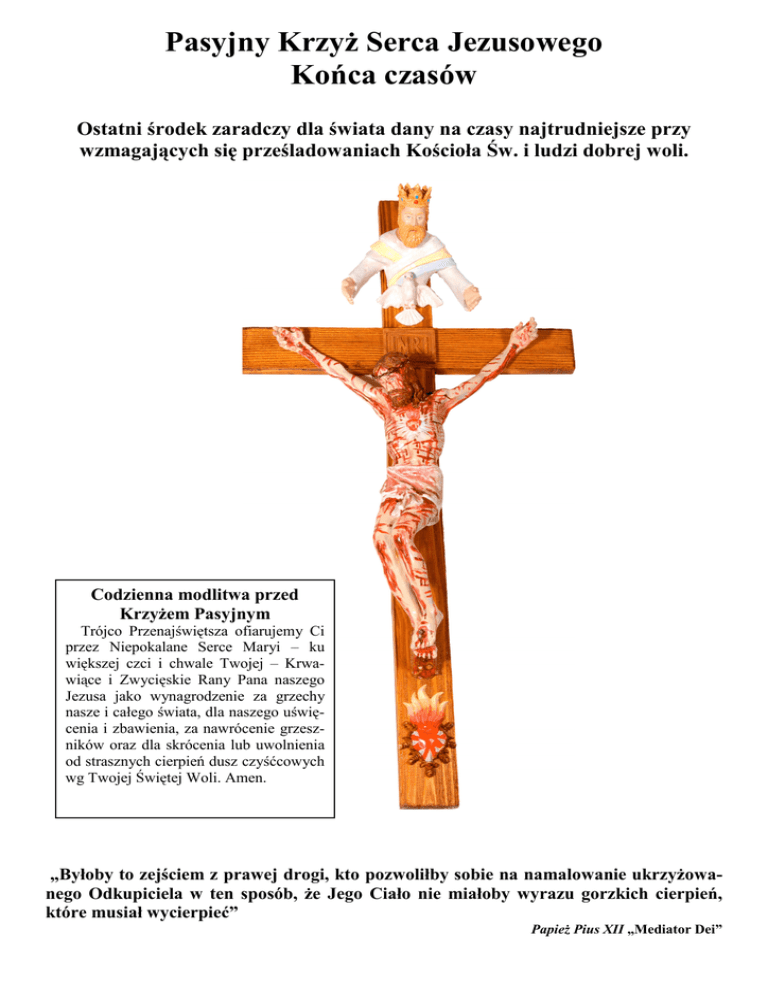Pasyjny Krzyż Serca Jezusowego Końca czasów Ostatni środek zaradczy dla świata dany na czasy najtrudniejsze przy wzmagających się prześladowaniach Kościoła Św. i ludzi dobrej woli. Codzienna modlitwa przed Krzyżem Pasyjnym Trójco Przenajświętsza ofiarujemy Ci przez Niepokalane Serce Maryi – ku większej czci i chwale Twojej – Krwawiące i Zwycięskie Rany Pana naszego Jezusa jako wynagrodzenie za grzechy nasze i całego świata, dla naszego uświęcenia i zbawienia, za nawrócenie grzeszników oraz dla skrócenia lub uwolnienia od strasznych cierpień dusz czyśćcowych wg Twojej Świętej Woli. Amen. „Byłoby to zejściem z prawej drogi, kto pozwoliłby sobie na namalowanie ukrzyżowanego Odkupiciela w ten sposób, że Jego Ciało nie miałoby wyrazu gorzkich cierpień, które musiał wycierpieć” Papież Pius XII „Mediator Dei” „Koniec czasów” nie oznacza końca świata, tylko koniec - zmierzch epoki w której żyjemy, nacechowanej permanentną walką z Bogiem i Jego Św. Kościołem. Krzyż ten jest znakiem czasów apokaliptycznych, w którym dojdzie do ostatecznej konfrontacji między zorganizowanymi siłami antychrysta i założonym przez Chrystusa (dla naszego zbawienia), Kościołem katolickim. Ojciec Św. Jan Paweł II wielokrotnie przypominał, że w walce tej ostatnie słowo będzie należało do Boga, po czym nastąpi „cywilizacja miłości” i całkowity triumf i królowanie Najświętszego Serca Jezusowego przez uprzedni triumf Niepokalanego Serca Maryi. Bóg w swoim nieskończonym miłosierdziu do człowieka, w odpowiednim czasie w zależności od sytuacji i stopnia zagrożenia, podawał Kościołowi różne środki i pomoce służące nam do uświęcenia i zbawienia. Do takich między innymi należą sakramentalia, do których zaliczamy Cudowny Medalik Niepokalanej, Medalik Św. Benedykta, Szkaplerz Karmelitański, obraz Jezusa Miłosiernego i inne. Krzyż Pasyjny jest dany na obecne czasy, gdzie nienawiść szatana i oddanych mu ludzi do Boga i Jego Świętych Praw osiągnęła niespotykane dotąd rozmiary. Modlący się przed tym Krzyżem doświadczą umocnienia i bliskości Boga, a grzesznicy doznają skruchy i żalu za grzechy, a ich domy będą cieszyły się błogosławieństwem Bożym i będą szczególniej chronione przed szatanem i jego sługami. Wykonanie krzyża W 100 procentach ręczne arcydzieło. Misterna robota. • Krzyż wykonany z drewna, szczotkowany, bejcowany i malowany lakierem dzięki czemu wygląda jeszcze bardziej realnie. • Postacie i elementy z krucyfiksu ze specjalnej żywicy, dzięki czemu są one o wiele bardziej wytrzymałe od gipsu (zazwyczaj w sprzedaży są oferowane figurki gipsowe), jak i detale, szczegóły są bardziej uwidocznione • Wszystko ręcznie pieczołowicie malowane przez artystę malarza • Korona cierniowa Pana Jezusa wykonana z drutu • Krzyż jest przygotowany do zawieszenia na ścianie Z racji na koronkową i misterną pracę jaką trzeba włożyć w wykonanie tego krucyfiksu ilość sztuk ograniczona! Na Krzyżu tym jest ukazany Bóg Ojciec, Duch Święty, a pod stopami Pana Jezusa Niepokalane Serce Maryi przebite siedmioma mieczami. Ukazane jest zatem zaangażowanie się całej Trójcy Przenajświętszej w dzieło odkupienia człowieka i wyjątkowa w tym rola Matki Bożej jako Współodkupicielki świata, a co za tym idzie Pośredniczki wszystkich łask Bożych i najpotężniejszej Orędowniczki, którą ks. kard. Stefan Wyszyński nazywał często „Wszechmocą błagającą”. Wymiary krucyfiksu: • Wysokość Krzyża – 62cm, szerokość ramion krzyża 30cm • Postać Pana Jezusa – wysokość 32cm, długość ramion 24cm Cena: 320zł Papieże ostrzegają Polskę i inne narody Ostatniego dnia roku 1993 w kościele św. Ignacego Loyoli w Rzymie papież Jan Paweł II wygłosił homilię, wobec której nie można przejść obojętnie. „Antychryst jest wśród nas – zawołał Jan Paweł II. Początek nowego roku otwiera horyzonty, które choć nie pozbawione przebłysku światła, są mroczne i groźne, nie możemy przymykać oczu na to, co nas otacza. Musimy nazwać po imieniu złego. Nie możemy przeoczyć faktu, że wraz z kulturą miłości i życia na świecie rozpoczyna się inna cywilizacja, cywilizacja śmierci1, będąca bezpośrednim działaniem szatana i stanowiąca jeden z przejawów zbliżającej się Apokalipsy” (O. Bonifacjus Gunther Szatan istnieje naprawdę). O. Święty Jan Paweł II w takich oto słowach ostrzegał nasz naród przed największą herezją wszechczasów jaką jest masońsko-ateistyczny liberalizm: „Przyszłość Polski zależy od tego, jaką drogą pójdzie nasz naród. Jeśli odrzucimy Dekalog i wybierzemy szatańską cywilizację śmierci będziemy pogrążać się w otchłani samozniszczenia” (Ks. Ottavio Michellini Orędzia Pana Jezusa do Kapłanów). Dlaczego Pasyjny Krzyż? – Pasyjny Krzyż jest przedstawiony w ten sposób - dla uczczenia i ofiarowania Najświętszych Ran i Najdroższej Krwi naszego Pana i Boga, Jezusa Chrystusa oraz dla zwycięstwa i triumfu Niepokalanie Poczętej Najświętszej Dziewicy i Matki Boga, Maryi. W r. 1876 ukazała się Matka Boża trzem pastuszkom w Marpingen (Niemcy). W setną rocznicę (1987) pewna uprzywilejowana osoba otrzymała polecenie w objawieniu duchowo - mistycznym, żeby wykonywano i rozpowszechniano krzyże uliczne, ołtarzowe i domowe pod nazwą: „Pasyjny Krzyż Serca Jezusowego Końca Czasu” z Krwawiącymi, Zwycięskimi Ranami, jak ukaże się Jezus zakrwawiony i wielki na niebie. [O ukazaniu się Krzyża na niebie przy końcu czasów powiedział Pan Jezus Św. Faustynie, a także wielu innym mistykom]. Pewien wizjoner pod Paryżem otrzymał szczegółowe wytyczne, by możliwie na wielką skalę i to jak najszybciej, z powodu zbliżającego się Ostrzeżenia te Krzyże rozpowszechniać [w razie niemożności nabycia lub z braku środków finansowych rolę tę może pełnić o