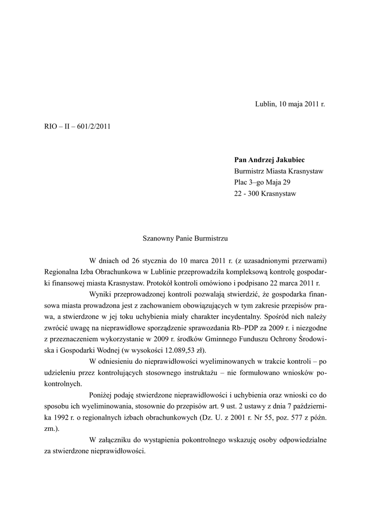 Lublin, 10 maja 2011 r. RIO – II – 601/2/2011 Pan Andrzej Jakubiec Burmistrz Miasta Krasnystaw Plac 3–go Maja 29 22 - 300 Krasnystaw Szanowny Panie Burmistrzu W dniach od 26 stycznia do 10 marca 2011 r. (z uzasadnionymi przerwami) Regionalna Izba Obrachunkowa w Lublinie przeprowadziła kompleksową kontrolę gospodarki finansowej miasta Krasnystaw. Protokół kontroli omówiono i podpisano 22 marca 2011 r. Wyniki przeprowadzonej kontroli pozwalają stwierdzić, że gospodarka finansowa miasta prowadzona jest z zachowaniem obowiązujących w tym zakresie przepisów prawa, a stwierdzone w jej toku uchybienia miały charakter incydentalny. Spośród nich należy zwrócić uwagę na nieprawidłowe sporządzenie sprawozdania Rb–PDP za 2009 r. i niezgodne z przeznaczeniem wykorzystanie w 2009 r. środków Gminnego Funduszu Ochrony Środowiska i Gospodarki Wodnej (w wysokości 12.089,53 zł). W odniesieniu do nieprawidłowości wyeliminowanych w trakcie kontroli – po udzieleniu przez kontrolujących stosownego instruktażu – nie formułowano wniosków pokontrolnych. Poniżej podaję stwierdzone nieprawidłowości i uchybienia oraz wnioski co do sposobu ich wyeliminowania, stosownie do przepisów art. 9 ust. 2 ustawy z dnia 7 października 1992 r. o regionalnych izbach obrachunkowych (Dz. U. z 2001 r. Nr 55, poz. 577 z późn. zm.). W załączniku do wystąpienia pokontrolnego wskazuję osoby odpowiedzialne za stwierdzone nieprawidłowości. 2 1. W zakresie dochodów budżetowych: 1.1. Nieopodatkowanie podatkiem rolnym użytków rolnych, będących w posiadaniu wojewódzkiej jednostki budżetowej. Opodatkować posiadacza użytków rolnych, będącego jednostką organizacyjną nieposiadającą osobowości prawnej, wskazanego w protokole kontroli, mając na uwadze przepisy art. 3 ust. 1 pkt 4 ustawy z dnia 15 listopada 1984 r. o podatku rolnym (Dz. U. z 2006 r. Nr 136, poz. 969 z późn. zm.), z uwzględnieniem okresu przedawnienia zobowiązań podatkowych, określonego w przepisach art. 70 § 1 ustawy z dnia 29 sierpnia 1997 r. Ordynacja podatkowa (Dz. U. z 2005 r. Nr 8, poz. 60 z późn. zm.) – str. 17, 18 protokołu. 1.2. Nieprawidłowe opodatkowanie gruntów stanowiących współwłasność, polegające na: - opodatkowaniu w drodze decyzji wymiarowych gruntów, o powierzchni odpowiadającej udziałom osób fizycznych we współwłasności z osobą prawną, - opodatkowaniu jedną decyzją wymiarową gruntów, stanowiących odrębną własność osób fizycznych oraz gruntów,o powierzchni odpowiadającej udziałom osób fizycznych we współwłasności z osobą prawną bądź osobami fizycznymi, - nieopodatkowaniu podatkiem rolnym gruntów, o powierzchni odpowiadającej udziałowi Skarbu Państwa, gminy miejskiej Krasnystaw oraz osoby fizycznej. Przy opodatkowaniu gruntów – stanowiących współwłasność dwóch lub więcej podmiotów – uwzględniać zasadę, że grunty te stanowią odrębny przedmiot opodatkowania. Oznacza to, że podatnik (osoba fizyczna lub osoba prawna) powinien wykazać w odrębnej informacji (deklaracji) – obejmującej grunty stanowiące współwłasność – cały grunt, a nie tylko część odpowiadającą jego udziałowi we współwłasności i wyliczyć podatek od całego gruntu stanowiącego współwłasność, gdyż obowiązek podatkowy ciąży solidarnie na wszystkich współwłaścicielach, przy czym do odpowiedzialności solidarnej za zobowiązania podatkowe stosować przepisy ustawy z dnia 23 kwietnia 1964 r. Kodeks cywilny (Dz. U. Nr 16, poz. 93 z późn. zm.) dla zobowiązań cywilnoprawnych, stosownie do przepisów art. 3 ust. 5 ustawy o podatku rolnym i art. 3 ust. 4 ustawy o podatkach i opłatach lokalnych, w związku z art. 91 Ordynacji podatkowej. W sytuacji gdy użytki rolne albo grunty zadrzewione i zakrzewione na użytkach rolnych stanowią gospodarstwo rolne, prowadzone w całości przez jednego ze współwłaścicieli – podatek ustalać (określać) tylko temu współwłaścicielowi, który w całości prowadzi to gospodarstwo, zgodnie z art. 3 ust. 6 ustawy o podatku rolnym. 3 Jeżeli użytki rolne (nieruchomości) stanowią współwłasność osób fizycznych i osób prawnych – egzekwować od osób fizycznych i prawnych deklaracje na podatek rolny (od nieruchomości) i opłacanie podatku na zasadach obowiązujących osoby prawne, w związku z przepisami art. 6a ust. 8 pkt 1 i ust. 10 ustawy o podatku rolnym i art. 6 ust. 11 ustawy o podatkach i opłatach lokalnych oraz art. 274a § 1 Ordynacji podatkowej. Jeżeli użytki rolne stanowią współwłasność osób fizycznych i Skarbu Państwa bądź gminy, podatkiem rolnym opodatkowywać – zgodnie z zasadą solidarności – wszystkich współwłaścicieli tych gruntów, z wyjątkiem Skarbu Państwa i gminy, pamiętając że przepis art. 3a ustawy o podatku rolnym nie stanowi przedmiotowego wyłączenia z opodatkowania określonej kategorii gruntów, a jedynie wymienia podmioty, których nie dotyczy obowiązek podatkowy w podatku rolnym. Grunty stanowiące odrębną własność osób fizycznych opodatkowywać w drodze odrębnych decyzji wymiarowych, w związku z przepisami art. 3 ust. 1 pkt 1 ustawy o podatku rolnym i art. 3 ust. 1 pkt 1 ustawy o podatkach i opłatach lokalnych, stosownie do których podatnikiem jest osoba fizyczna będąca właścicielem gruntów (nieruchomości) – str. 17, 19 - 25 protokołu. Ponadto: - wyjaśnić, czy wskazane w protokole grunty (odpowiadające udziałowi Skarbu Państwa we współwłasności z osobą fizyczną) oznaczone w ewidencji geodezyjnej symbolem „dr” (drogi), podlegają opodatkowaniu podatkiem od nieruchomości, mając na uwadze przepisy art. 2 ust. 1 pkt 1 i art. 3 ustawy z dnia 12 stycznia 1991 r. o podatkach i opłatach lokalnych (Dz. U. z 2010 r. Nr 95, poz. 613 z późn. zm.); jeśli tak opodatkować właściciela (posiadacza) tych gruntów należnym podatkiem, uwzględniając okres przedawnienia prawa do wymiaru zob
