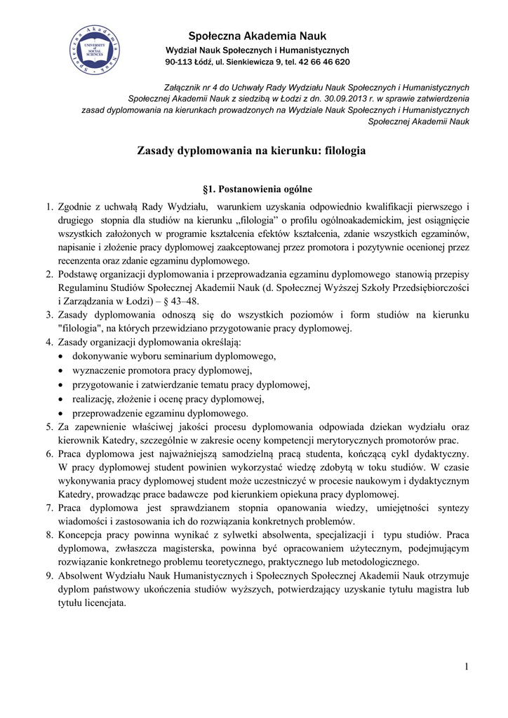 Społeczna Akademia Nauk Zasady dyplomowania na