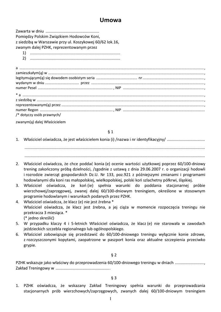 Umowa Zawarta w dniu ................................................ Pomiędzy Polskim Związkiem Hodowców Koni, z siedzibą w Warszawie przy ul. Koszykowej 60/62 lok.16, zwanym dalej PZHK, reprezentowanym przez 1) ................................................................................. 2) ................................................................................. a .................................................................................................................................................................................... , zamieszkałym(ą) w ........................................................................................................................................................ , legitymującym(ą) się dowodem osobistym seria ........................................ nr ............................................................ , wydanym w dniu ................................. przez .............................................................................................................. , numer Pesel ......................................................................... , NIP ............................................................................... , * a ................................................................................................................................................................................. , z siedzibą w ................................................................................................................................................................... , reprezentowanym(ą) przez ........................................................................................................................................... , numer Regon ....................................................................... , NIP ................................................................................ /* dotyczy osób prawnych/ zwanym(ą) dalej Właścicielem §1 1. Właściciel oświadcza, że jest właścicielem konia (i) /nazwa i nr identyfikacyjny/ .................................. .................................................................................................................................................................. .................................................................................................................................................................. 2. 3. 4. 5. 6. Właściciel oświadcza, że chce poddać konia (e) ocenie wartości użytkowej poprzez 60/100-dniowy trening zakończony próbą dzielności, /zgodnie z ustawą z dnia 29.06.2007 r. o organizacji hodowli i rozrodzie zwierząt gospodarskich Dz.U. Nr 133, poz.921 z późniejszymi zmianami i programami hodowlanymi dla koni ras małopolskiej, wielkopolskiej, polski koń szlachetny półkrwi, śląskiej. Właściciel oświadcza, że koń (ie) spełnia warunki do poddania stacjonarnej próbie wierzchowej/zaprzęgowej, zwanej dalej 60/100-dniowym treningiem, określone w stosownym programie hodowlanym i warunkach podanych przez PZHK. Właściciel oświadcza, że klacz (e) nie jest źrebna * Właściciel oświadcza, że klacz jest źrebna, a jej ciąża w momencie rozpoczęcia treningu nie przekracza 3 miesiąca. * (* jedno skreślić) W przypadku klaczy 4 i 5-letnich Właściciel oświadcza, że klacz (e) nie starowała w zawodach jeździeckich szczebla regionalnego lub ogólnopolskiego. Właściciel zobowiązuje się przedstawić do 60/100-dniowego treningu wyłącznie konie zdrowe, z rozczyszczonymi kopytami, zaopatrzone w paszport konia oraz aktualne szczepienia przeciwko grypie. §2 PZHK wskazuje jako właściwy do przeprowadzenia 60/100-dniowego treningu w dniach .......................... , Zakład Treningowy w ................................................ . §3 1. PZHK oświadcza, że wskazany Zakład Treningowy spełnia warunki do przeprowadzania stacjonarnych prób wierzchowych/zaprzęgowych, zwanych dalej 60/100-dniowym treningiem 1 2. 3. /zgodnie z ustawą z dnia 29.06.2007 r. o organizacji hodowli i rozrodzie zwierząt gospodarskich Dz.U. Nr 133, poz.921 z późniejszymi zmianami/. PZHK oświadcza, że wskazany Zakład Treningowy spełnia warunki do właściwego utrzymywania koni podczas treningu zakończonego próbą dzielności zgodnie z rozporządzeniem Ministra Rolnictwa i Rozwoju Wsi z dnia 28 czerwca 2010 r. w sprawie minimalnych warunków utrzymywania gatunków zwierząt gospodarskich innych niż te, dla których normy ochrony zostały określone w przepisach Unii Europejskiej (Dz.U. Nr 116, poz. 778). PZHK oświadcza ponadto, że Zakład Treningowy przeprowadzi 60/100-dniowy trening, zakończony próbą dzielności i będzie utrzymywać konie zgodnie z dokumentami „Program studyjny 60/100-dniowego treningu wierzchowego/zaprzęgowego koni” oraz „Warunki jakie powinien spełniać zakład treningowy o kierunku wierzchowym/zaprzęgowym”, stanowiącymi załącznik nr 1 i 2 do umowy. PZHK dołoży należytej staranności by wskazany Zakład Treningowy spełniał powyższe warunki podczas 60/100-dniowego treningu. §4 1. 2. PZHK oświadcza, że wskazany Zakład Treningowy ponosi wszelką odpowiedzialność za spełnienie warunków określonych w § 3, ust 1-3 umowy. Właściciel oświadcza, że wyraża zgodę na powyższe i w wypadku zaistnienia jakiejkolwiek szkody związanej z poddaniem konia 60/100-dniowemu treningowi, z wyjątkiem przypadków poronień i martwo urodzonych źrebiąt, skieruje swoje roszczenia przeciwko Zakładowi Treningowemu. §5 1. 2. PZHK oświadcza, że koszt przeprowadzenia oceny wartości użytkowej konia, o której mowa w § 1, ust.2 umowy wynosi ......................... zł. brutto /słownie: .................................................................. / Kwota ta będzie płacona w następujący sposób: a. 30% wpłaca właściciel na konto PZHK nr 68 1240 6175 1111 0000 4571 0410 najpóźniej w ciągu 7 dni o