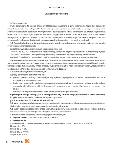 ROZDZIAŁ XV Okładziny ceramiczne 1. Wprowadzenie: Płytki ceramiczne to płaskie elementy okładzinowe wypalane z gliny, krzemionki, topników, barwników i innych surowców mineralnych. Produkowane są w różnych formatach i kształtach, służą do wykonywania podłóg oraz okładzin ściennych wewnętrznych i zewnętrznych. Płytki ceramiczne są twarde, wytrzymałe, łatwe do czyszczenia, ognioodporne, niepalne. Wyjątkowa trwałość oraz parametry techniczne, bogata kolorystyka, mnogość formatów i różnorodność powierzchni stanowią o tym, że układa się je w obiektach użyteczności publicznej, budynkach przemysłowych, mieszkaniach i domach prywatnych 1.1 Ceramika budowlana to wszelkiego rodzaju wyroby produkowane z surowców naturalnych wypalanych w różnych temperaturach Wypalanie wyrobów ceramicznych składa się z kilku faz: - od 0 ºC do 300 ºC – odparowanie resztek wody, wypalenie części organicznych, kurczenie się wyrobu - od 300 ºC do 600 ºC usunięcie wody związanej chemicznie, początek reakcji chemicznych - od 600 ºC do 900 ºC czasami do 1300 ºC zachodzą trwałe i nieodwracalne zmiany w wyrobie. 1.2 Negatywnym skutkiem wypalania jest nierównomierne kurczenie się wyrobu. Powstają ”takie same” wyroby o różnych wymiarach. Wymusza to na producentach konieczność wprowadzenia kalibracji – sortowania ze względu na wymiary. Wadą procesu wypalania mogą być różnice kolorystyczne wyrobów (różnice w odcieniach). Powoduje to konieczność sortowania na tonacje. 1.3 Sortowanie wyrobów ceramicznych Wyroby ceramiczne sortowane są na: -- gatunki: pierwszy, drugi oraz trzeci ( ocenę wykonują specjalne przyrządy – ocena techniczna oraz człowiek – ocena estetyczna) -- kalibracja: ze względu na deformacje wymiarowe płytek w trakcie procesu wypalania wymiary płytek mogą się od siebie nieco różnić. Dlatego płytki grupowane są w partie o tym samym wymiarze – kalibrze. -- tonacje: ze względu na odcienie płytki selekcjonowane są na odcienie. Płytki tego samego rodzaju, ale o różnej tonacji czy kalibrze mogą być uznane z różne produkty. Przykładowe oznaczenie opakowania płytek z gresu np.: gat. I, rozmiar 30 x 30, kaliber 03, odcień 60. 1.4 Wady techniczne płytek ceramicznych: odchylenia wymiarowe, wichrowatość powierzchni, deformacja kształtu, pęknięcia lub rozwarstwienia, pęknięcia włosowate. 1.5 Wady estetyczne (oceniane przez człowieka): przebarwienia, różnice w odcieniach, różnice połysku, nie dolane szkliwo, muszki (ciemne kropki), nakłucia, zaprószenia. 1.6 Podstawowe parametry techniczne płytek ceramicznych: -- wymiarowość (zgodnie z PN-EN ISO 10545-2) -- nasiąkliwość (nasiąkliwość E = maksymalna masa wody wchłoniętej prze płytkę / masa płytki x 100%) Grupa I, E < 3% Grupa IIa, E < 6% Grupa IIIb, E < 10% Grupa III, E > 10% 84 PORADNIK -- ścieralność (określana jest dla płytek podłogowych szkliwionych i nieszkliwionych) Klasy ścieralności płytek – określana jest w obrotach tarczy ścierającej po których widoczne są ślady tarcia Kl.I–150obrotów Płytki ceramiczne do pokrycia powierzchni podłóg, po których chodzi się w butach o miękkiej podeszwie lub boso, które nie są narażone na działanie materiałów ścierających ( np.: łazienki i pokoje bez bezpośredniego wejścia z zewnątrz) Kl. II – 600 obrotów Płytki ceramiczne do pokrycia powierzchni podłóg, po których powierzchni chodzi się w obuwiu z podeszwami miękkimi lub normalnymi, które narażone są na niewielkie ilości brudu oraz materiałów ścierających (np.: pokoje mieszkalne w mieszkaniach, jadalnie. Płytek ceramicznych tej klasy nie można stosować tam, gdzie chodzi się w butach nietypowych z zelówkami metalowymi lub podkutych. Kl. III – 750 - 1500 obrotów Płytki ceramiczne do pokrycia powierzchni podłóg, po których chodzi się w butach z normalnymi podeszwami, z niewielkimi ilościami brudu i materiału ścierającego (np.: kuchnie, hole, korytarze, balkony, loggie, tarasy. Płytek tej klasy nie można stosować tam, gdzie chodzi się w butach nietypowych, np.: z zelówkami metalowymi lub podkutych. Kl. IV – 2100, 6000, 12 000 obrotów Płytki ceramiczne do pokrycia powierzchni podłóg, po których odbywa się ruch normalny, na które wnoszone są niewielkie ilości materiału ścierającego w taki sposób, że warunki są bardziej surowe niż dla klasy 3 (np.: wejścia, kuchnie, pomieszczenia handlowe, hotele, salony wystawowe i salony sprzedaży) W domach jednorodzinnych mogą być stosowane we wszystkich rodzajach pomieszczeń. Kl. V – powyżej 12 000 obrotów Płytki ceramiczne do pokrycia powierzchni podłóg narażanych na wzmożony ciągły ruch pieszy, gdzie wnoszone są cząstki materiału ścierającego (np.: miejsca publiczne, takie jak centra handlowe, korytarze, lotniska, sale hotelowe, przejścia publiczne i hale przemysłowe) Klasyfikacja ta ważna jest tylko dla wymienionych przykładów i w warunkach normalnych przy czym za warunki normalne uważa się sytuację, gdy schody i wejścia do pomieszczeń jak i chodniki przed budynkami są często zmywane, a obuwie normalne oznacza obuwie z gładką powierzchnią i nie podkute. Przy doborze płytek ceramicznych należy brać pod uwagę buty, typ ruchu oraz metody i możliwości czyszczenia. Wejścia do budynków należy zabezpieczyć przed przedostawaniem się materiału ścierającego poprzez położenie na podłodze wycieraczek. --------- twardość (oznaczana jest przez zarysowanie powierzchni płytki minerałem o znanej twardości tzw. skala Mohsa od 1 do 10) i tak: twardość 1 – posiada talk twardość 2 – posiada gips, sól kuchenna twardość 3 – posiada kalcyt twardość 4 – posiada marmur twardość 5 – posiada apatyt twardość 6 – posiada ortoklaz twardość 7 – posiada granit, piasek kwarcowy 85 PORADNIK -- twardość 8 – posiada topaz -- twardość 9 – posiada korund -