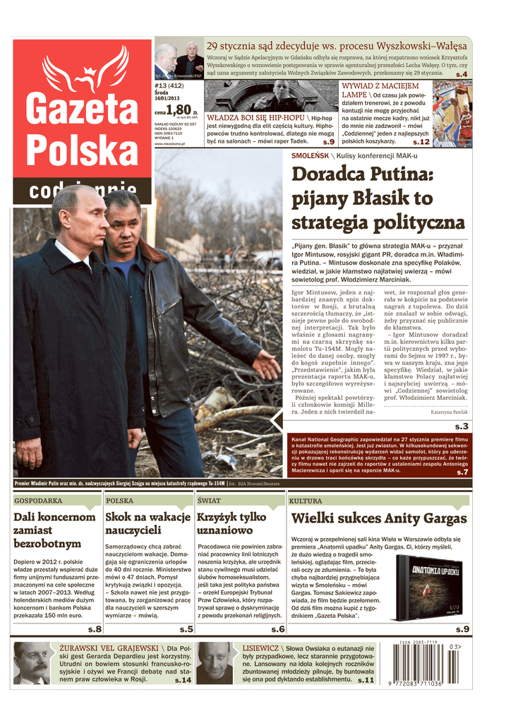 29 stycznia sąd zdecyduje ws. procesu Wyszkowski–Wałęsa fot. Stefan Kraszewski/PAP Środa 16/01/2013 1,80 cena WYWIAD Z MACIEJEM LAMPE \ Od czasu jak powie- fot. arch. #13 (412) Wczoraj w Sądzie Apelacyjnym w Gdańsku odbyła się rozprawa, na której rozpatrzono wniosek Krzysztofa Wyszkowskiego o wznowienie postępowania w sprawie agenturalnej przeszłości Lecha Wałęsy. O tym, czy sąd uzna argumenty założyciela Wolnych Związków Zawodowych, przekonamy się 29 stycznia. s.4 ZŁ (w tym 8% VAT) NAKŁAD OGÓLNY 92 557 INDEKS 100625 ISSN 2083-7119 WYDANIE 1 www.niezalezna.pl WŁADZA BOI SIĘ HIP-HOPU \ Hip-hop jest niewygodną dla elit częścią kultury. Hiphopowców trudno kontrolować, dlatego nie mogą być na salonach – mówi raper Tadek. s.9 działem trenerowi, że z powodu kontuzji nie mogę przyjechać na ostatnie mecze kadry, nikt już do mnie nie zadzwonił – mówi „Codziennej” jeden z najlepszych polskich koszykarzy. s.12 fot. Peter Andrews / Reuters SMOLEŃSK \ Kulisy konferencji MAK-u Doradca Putina: pijany Błasik to strategia polityczna „Pijany gen. Błasik” to główna strategia MAK-u – przyznał Igor Mintusow, rosyjski gigant PR, doradca m.in. Władimira Putina. – Mintusow doskonale zna specyfikę Polaków, wiedział, w jakie kłamstwo najłatwiej uwierzą – mówi sowietolog prof. Włodzimierz Marciniak. Igor Mintusow, jeden z najbardziej znanych spin doktorów w Rosji, z brutalną szczerością tłumaczy, że „istnieje pewne pole do swobodnej interpretacji. Tak było właśnie z głosami nagranymi na czarną skrzynkę samolotu Tu-154M. Mogły należeć do danej osoby, mogły do kogoś zupełnie innego”. „Przedstawienie”, jakim była prezentacja raportu MAK-u, było szczegółowo wyreżyserowane. Później spektakl powtórzyli członkowie komisji Millera. Jeden z nich twierdził na- wet, że rozpoznał głos generała w kokpicie na podstawie nagrań z tupolewa. Do dziś nie znalazł w sobie odwagi, żeby przyznać się publicznie do kłamstwa. – Igor Mintusow doradzał m.in. kierownictwu kilku partii politycznych przed wyborami do Sejmu w 1997 r., bywa w naszym kraju, zna jego specyfikę. Wiedział, w jakie kłamstwo Polacy najłatwiej i najszybciej uwierzą – mówi „Codziennej” sowietolog prof. Włodzimierz Marciniak. Katarzyna Pawlak s.3 Kanał National Geographic zapowiedział na 27 stycznia premierę filmu o katastrofie smoleńskiej. Jest już zwiastun. W kilkusekundowej sekwencji pokazującej rekonstrukcję wydarzeń widać samolot, który po uderzeniu w drzewo traci końcówkę skrzydła – co każe przypuszczać, że twórcy filmu nawet nie zajrzeli do raportów z ustaleniami zespołu Antoniego Macierewicza i oparli się na raporcie MAK-u. s.7 Premier Władimir Putin oraz min. ds. nadzwyczajnych Siergiej Szojgu na miejscu katastrofy rządowego Tu-154M |fot. RIA Novosti/Reuters GOSPODARKA POLSKA ŚWIAT KULTURA Dali koncernom Skok na wakacje Krzyżyk tylko zamiast nauczycieli uznaniowo bezrobotnym Samorządowcy chcą zabrać Pracodawca nie powinien zabraDopiero w 2012 r. polskie władze przestały wspierać duże firmy unijnymi funduszami przeznaczonymi na cele społeczne w latach 2007–2013. Według holenderskich mediów dużym koncernom i bankom Polska przekazała 150 mln euro. s.8 nauczycielom wakacje. Domagają się ograniczenia urlopów do 40 dni rocznie. Ministerstwo mówi o 47 dniach. Pomysł krytykują związki i opozycja. – Szkoła nawet nie jest przygotowana, by zorganizować pracę dla nauczycieli w szerszym wymiarze – mówią. s.5 ŻURAWSKI VEL GRAJEWSKI \ Dla Pol- ski gest Gerarda Depardieu jest korzystny. Utrudni on bowiem stosunki francusko-rosyjskie i ożywi we Francji debatę nad stanem praw człowieka w Rosji. s.14 niać pracownicy linii lotniczych noszenia krzyżyka, ale urzędnik stanu cywilnego musi udzielać ślubów homoseksualistom, jeśli taka jest polityka państwa – orzekł Europejski Trybunał Praw Człowieka, który rozpatrywał sprawę o dyskryminację z powodu przekonań religijnych. Wielki sukces Anity Gargas Wczoraj w przepełnionej sali kina Wisła w Warszawie odbyła się premiera „Anatomii upadku” Anity Gargas. Ci, którzy myśleli, że dużo wiedzą o tragedii smoleńskiej, oglądając film, przecierali oczy ze zdumienia. – To była chyba najbardziej przygnębiająca wizyta w Smoleńsku – mówi Gargas. Tomasz Sakiewicz zapowiada, że film będzie przełomem. Od dziś film można kupić z tygodnikiem „Gazeta Polska”. s.6 LISIEWICZ \ Słowa Owsiaka o eutanazji nie były przypadkowe, lecz starannie przygotowane. Lansowany na idola kolejnych roczników zbuntowanej młodzieży pilnuje, by buntowała się ona pod dyktando establishmentu. s.11 s.9 OPINIE \\ Mówię o miłosierdziu. Niekiedy najzupełniej nieoczekiwanie i zdradliwie wciska się ono w najmniejsze szczeliny. \\ CODZIENNIE ŚRODA 16 STYCZNIA 2012 2 Michał Bułhakow (1891– 1940) rosyjski pisarz, cytat pochodzi z jego najgłośniejszej powieści „Mistrz i Małgorzata” Gazeta Polska www.niezalezna.pl fot. Wikipedia Marcin Wolski Piosenka lotnicza W Modlinie pas, na pasie syf i flota co lata z dala, jak Eksperss Olt jak Ameber Gold, dreamliner, co znów nawala. | Polskie skrzydła połamane OPINIE i pech wciąż doskwiera, 2 | | fot. Radek Pietruszka/PAP RSDG\ĂQLHJX R ZACHÓD ÓD D VïRñFD 07 37 15 55 *GDĽVN NE -2°C -2°C WarV]awa WrRFâaw N N NW N NW NE -2°C -7°C N -1°C -6°C -1°C -6°C NW p GOSPODARKA -2°C -6°C PR]QDĽ 0°C -4°C NW p | áyGŬ .UDNyZ p 0°C -4°C Lublin 0°C -4°C N ZACHÓD ksiÚĝyca 09 19 22 17 p Katowice WSCHÓD W S ksiÚĝyca p ŚWIAT 8 WSCHÓD VïRñFD 16.01 p POLSKA 6-7 POGODA P ŒURGD p TEMAT DNIA 4-5 to loty premiera! p | 3 jedyne pewne połączenia N IMIENINY: :âRG]LPLHU]D | NE -1°C -4°C -3°C -6°C áyGŬ -4°C -6°C WarV]awa | -2°C -6°C Lublin -2°C -5°C .UDNyZ PR]QDĽ WrRFâaw N N N -4°C -7°C -2°C -7°C NW N NW p Katowice Antoni Chodorowski ZACHÓD ksiÚĝyca 