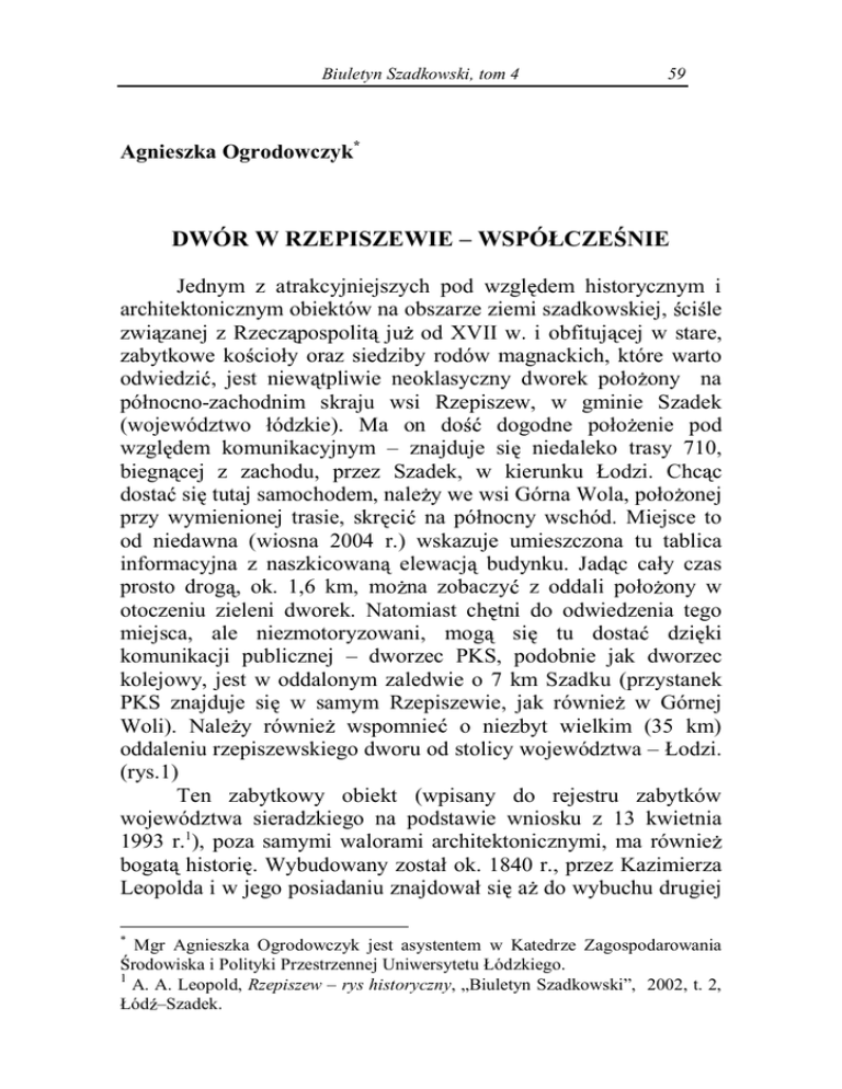 Biuletyn Szadkowski, tom 4 59 Agnieszka Ogrodowczyk* DWÓR W RZEPISZEWIE – WSPÓŁCZE NIE Jednym z atrakcyjniejszych pod wzgl dem historycznym i architektonicznym obiektów na obszarze ziemi szadkowskiej, ci le zwi zanej z Rzecz pospolit ju od XVII w. i obfituj cej w stare, zabytkowe ko cioły oraz siedziby rodów magnackich, które warto odwiedzi , jest niew tpliwie neoklasyczny dworek poło ony na północno-zachodnim skraju wsi Rzepiszew, w gminie Szadek (województwo łódzkie). Ma on do dogodne poło enie pod wzgl dem komunikacyjnym – znajduje si niedaleko trasy 710, biegn cej z zachodu, przez Szadek, w kierunku Łodzi. Chc c dosta si tutaj samochodem, nale y we wsi Górna Wola, poło onej przy wymienionej trasie, skr ci na północny wschód. Miejsce to od niedawna (wiosna 2004 r.) wskazuje umieszczona tu tablica informacyjna z naszkicowan elewacj budynku. Jad c cały czas prosto drog , ok. 1,6 km, mo na zobaczy z oddali poło ony w otoczeniu zieleni dworek. Natomiast ch tni do odwiedzenia tego miejsca, ale niezmotoryzowani, mog si tu dosta dzi ki komunikacji publicznej – dworzec PKS, podobnie jak dworzec kolejowy, jest w oddalonym zaledwie o 7 km Szadku (przystanek PKS znajduje si w samym Rzepiszewie, jak równie w Górnej Woli). Nale y równie wspomnie o niezbyt wielkim (35 km) oddaleniu rzepiszewskiego dworu od stolicy województwa – Łodzi. (rys.1) Ten zabytkowy obiekt (wpisany do rejestru zabytków województwa sieradzkiego na podstawie wniosku z 13 kwietnia 1993 r.1), poza samymi walorami architektonicznymi, ma równie bogat histori . Wybudowany został ok. 1840 r., przez Kazimierza Leopolda i w jego posiadaniu znajdował si a do wybuchu drugiej * Mgr Agnieszka Ogrodowczyk jest asystentem w Katedrze Zagospodarowania rodowiska i Polityki Przestrzennej Uniwersytetu Łódzkiego. 1 A. A. Leopold, Rzepiszew – rys historyczny, „Biuletyn Szadkowski”, 2002, t. 2, Łód –Szadek. 60 Agnieszka Ogrodowczyk wojny wiatowej. W okresie wojennym dwór zarz dzany był przez Niemca o nazwisku Rajnchard. Po zako czeniu działa wojennych, na podstawie dekretu PKWN z 1944 r. obiekt ten przeszedł na własno pa stwa. W latach 1948–2000 miała tu swoj siedzib szkoła podstawowa, a do momentu odkupienia dworku od gminy przez nowego wła ciciela, A. Leopolda. Jednak ju w roku 2001 przeszedł on w r ce kolejnego i ostatniego, jak dot d, wła ciciela – Roberta Witkowskiego. Mo na powiedzie , e o takiej zmianie zadecydował szcz liwy zbieg okoliczno ci – R. Witkowski poszukiwał obiektu, który mógłby zakupi , w granicach dawnego województwa sieradzkiego. Zainteresowanie tym obszarem spowodowane było przede wszystkim silnymi zwi zkami i pochodzeniem rodziny wła ciciela z tego terenu. Natrafiwszy w 2001 r. na ogłoszenie dotycz ce sprzeda y dworku, postanowił go odkupi , przede wszystkim z ch ci ratowania tego zabytkowego obiektu przed zniszczeniem. W owym czasie pojawiła si równie koncepcja stworzenia w rzepiszewskim dworze kwatery agroturystycznej. Poj cie „agroturystyka” pojawiło si w naszym kraju stosunkowo niedawno. Jest ona okre lana, jako forma wypoczynku, odbywaj ca si na terenach wiejskich o charakterze rolniczym, oparta na bazie noclegowej i aktywno ci rekreacyjnej, zwi zane z gospodarstwem rolnym lub równowa nym i jego otoczeniem – przyrodniczym, produkcyjnym i usługowym 2. groturystyka swoje korzenie wywodzi z XIX-wiecznych wyjazdów na letniska, kiedy to letnicy przyje d ali na wie na kilka tygodni lub nawet miesi cy w poszukiwaniu ciszy i spokoju oraz sielskiej atmosfery. Mie ci si ona w obr bie zdecydowanie szerzej definiowanej turystyki wiejskiej, czyli formy rekreacji, która odbywa si na obszarach „prawdziwej wsi" i obejmuje wiele rodzajów aktywno ci zwi zanej z turystyk pobytow , krajoznawcz , aktywn , specjalistyczn , kulturow , itp. Zarówno turystyka wiejska, jak i agroturystyka mieszcz si w granicach bardziej ogólnego nurtu turystyki przyjaznej rodowisku, a mianowicie turystyki ekologicznej. 2 M. Drzewiecki, Agroturystyka: zało enia – uwarunkowania – działania, Instytut Wydawniczy wiadectwo, Bydgoszcz 1995. Dwór w Rzepiszewie –współcze nie 61 DWÓR Rys. 1. Poło enie dworu w Rzepiszewie ródło: A. A. Leopold, 2002, Rzepiszew – rys historyczny, „Biuletyn Szadkowski”, t. 2, Łód –Szadek. Ma ona przede wszystkim za zadanie: sprzyjanie poprawie jako ci ycia ludno ci wiejskiej; zapewnienie turystom odpoczynku o wysokiej jako ci; rozwój w zgodzie ze rodowiskiem naturalnym i niepowodowanie jego degradacji. Rozpatruj c zarówno charakter samego dworu, jak i stan najbli szego otoczenia, mo na wymieni wiele jego cech przemawiaj cych za tak funkcj i zagospodarowaniem tego terenu. 62 Agnieszka Ogrodowczyk Budynek dworku otoczony jest parkiem o powierzchni ok. 4 ha, stanowi cym nie tylko naturaln stref izolacyjn , obszar jakby stworzony do spacerów i wypoczynku, ale maj cym równie znaczenie pod wzgl dem historyczno-kulturowym. Rosn tu cenne okazy drzew: 7 jesionów oraz 1 modrzew europejski, które znajduj si pod ochron Wojewódzkiego Konserwatora Zabytków. (rys. 2) W krajobrazie najbli szego otoczenia dworu dominuj pola uprawne. Zabudowa zwi zana jest głównie z gospodarstwami pobliskich wsi – Rzepiszewa i wspomnianej ju Górnej Woli – ulicówki, posiadaj cej zarówno starsze, tradycyjne, wiejskie zabudowania, jak i nowocze niejsze budynki mieszkalne. Z tej wła nie wsi do dworu prowadzi droga obsadzona, obu stronach drzewami (m. in. lipami), o niewielkim nat eniu ruchu, co sprawia, e obecna tu cisza i spokój sprzyja wypoczynkowi agroturystów. Okolica jest malownicza, a dowodem na to s odbywaj ce si tu plenery studentów szkół plastycznych, rysuj cych dwór i jego najbli sze s siedztwo (prace mo na obejrze na terenie dworku). Pod wzgl dem przystosowania obiektu do pełnienia nowej funkcji istotne jest przeanalizowanie zagospodarowania samego budynku. Nowi wła ciciele, adaptuj c kolejne pomieszczenia na pokoje go cinne