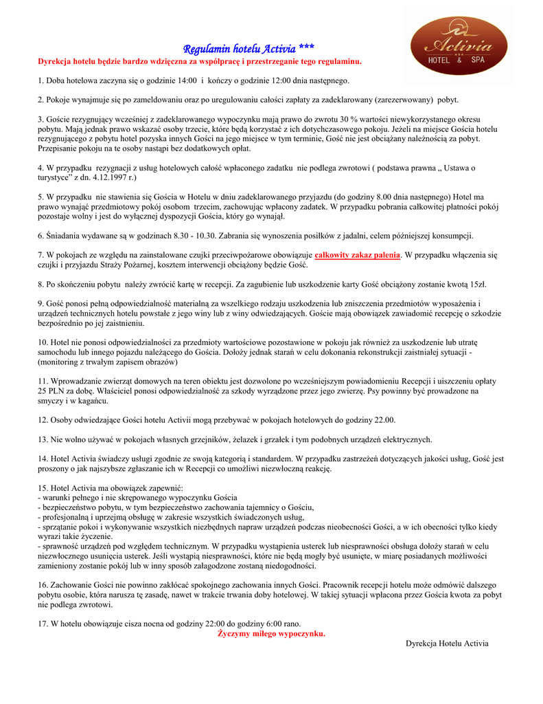 Regulamin hotelu Activia *** Dyrekcja hotelu będzie bardzo wdzięczna za współpracę i przestrzeganie tego regulaminu. 1. Doba hotelowa zaczyna się o godzinie 14:00 i kończy o godzinie 12:00 dnia następnego. 2. Pokoje wynajmuje się po zameldowaniu oraz po uregulowaniu całości zapłaty za zadeklarowany (zarezerwowany) pobyt. 3. Goście rezygnujący wcześniej z zadeklarowanego wypoczynku mają prawo do zwrotu 30 % wartości niewykorzystanego okresu pobytu. Mają jednak prawo wskazać osoby trzecie, które będą korzystać z ich dotychczasowego pokoju. Jeżeli na miejsce Gościa hotelu rezygnującego z pobytu hotel pozyska innych Gości na jego miejsce w tym terminie, Gość nie jest obciążany należnością za pobyt. Przepisanie pokoju na te osoby nastąpi bez dodatkowych opłat. 4. W przypadku rezygnacji z usług hotelowych całość wpłaconego zadatku nie podlega zwrotowi ( podstawa prawna „ Ustawa o turystyce” z dn. 4.12.1997 r.) 5. W przypadku nie stawienia się Gościa w Hotelu w dniu zadeklarowanego przyjazdu (do godziny 8.00 dnia następnego) Hotel ma prawo wynająć przedmiotowy pokój osobom trzecim, zachowując wpłacony zadatek. W przypadku pobrania całkowitej płatności pokój pozostaje wolny i jest do wyłącznej dyspozycji Gościa, który go wynajął. 6. Śniadania wydawane są w godzinach 8.30 - 10.30. Zabrania się wynoszenia posiłków z jadalni, celem późniejszej konsumpcji. 7. W pokojach ze względu na zainstalowane czujki przeciwpożarowe obowiązuje całkowity zakaz palenia. W przypadku włączenia się czujki i przyjazdu Straży Pożarnej, kosztem interwencji obciążony będzie Gość. 8. Po skończeniu pobytu należy zwrócić kartę w recepcji. Za zagubienie lub uszkodzenie karty Gość obciążony zostanie kwotą 15zł. 9. Gość ponosi pełną odpowiedzialność materialną za wszelkiego rodzaju uszkodzenia lub zniszczenia przedmiotów wyposażenia i urządzeń technicznych hotelu powstałe z jego winy lub z winy odwiedzających. Goście mają obowiązek zawiadomić recepcję o szkodzie bezpośrednio po jej zaistnieniu. 10. Hotel nie ponosi odpowiedzialności za przedmioty wartościowe pozostawione w pokoju jak również za uszkodzenie lub utratę samochodu lub innego pojazdu należącego do Gościa. Dołoży jednak starań w celu dokonania rekonstrukcji zaistniałej sytuacji (monitoring z trwałym zapisem obrazów) 11. Wprowadzanie zwierząt domowych na teren obiektu jest dozwolone po wcześniejszym powiadomieniu Recepcji i uiszczeniu opłaty 25 PLN za dobę. Właściciel ponosi odpowiedzialność za szkody wyrządzone przez jego zwierzę. Psy powinny być prowadzone na smyczy i w kagańcu. 12. Osoby odwiedzające Gości hotelu Activii mogą przebywać w pokojach hotelowych do godziny 22.00. 13. Nie wolno używać w pokojach własnych grzejników, żelazek i grzałek i tym podobnych urządzeń elektrycznych. 14. Hotel Activia świadczy usługi zgodnie ze swoją kategorią i standardem. W przypadku zastrzeżeń dotyczących jakości usług, Gość jest proszony o jak najszybsze zgłaszanie ich w Recepcji co umożliwi niezwłoczną reakcję. 15. Hotel Activia ma obowiązek zapewnić: - warunki pełnego i nie skrępowanego wypoczynku Gościa - bezpieczeństwo pobytu, w tym bezpieczeństwo zachowania tajemnicy o Gościu, - profesjonalną i uprzejmą obsługę w zakresie wszystkich świadczonych usług, - sprzątanie pokoi i wykonywanie wszystkich niezbędnych napraw urządzeń podczas nieobecności Gości, a w ich obecności tylko kiedy wyrazi takie życzenie. - sprawność urządzeń pod względem technicznym. W przypadku wystąpienia usterek lub niesprawności obsługa dołoży starań w celu niezwłocznego usunięcia usterek. Jeśli wystąpią niesprawności, które nie będą mogły być usunięte, w miarę posiadanych możliwości zamieniony zostanie pokój lub w inny sposób załagodzone zostaną niedogodności. 16. Zachowanie Gości nie powinno zakłócać spokojnego zachowania innych Gości. Pracownik recepcji hotelu może odmówić dalszego pobytu osobie, która narusza tę zasadę, nawet w trakcie trwania doby hotelowej. W takiej sytuacji wpłacona przez Gościa kwota za pobyt nie podlega zwrotowi. 17. W hotelu obowiązuje cisza nocna od godziny 22:00 do godziny 6:00 rano. Życzymy miłego wypoczynku. Dyrekcja Hotelu Activia
