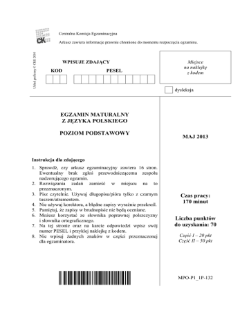 Centralna Komisja Egzaminacyjna Układ graficzny © CKE 2010 Arkusz zawiera informacje prawnie chronione do momentu rozpoczęcia egzaminu. WPISUJE ZDAJĄCY KOD PESEL Miejsce na naklejkę z kodem dysleksja EGZAMIN MATURALNY Z JĘZYKA POLSKIEGO POZIOM PODSTAWOWY MAJ 2013 Instrukcja dla zdającego 1. Sprawdź, czy arkusz egzaminacyjny zawiera 16 stron. Ewentualny brak zgłoś przewodniczącemu zespołu nadzorującego egzamin. 2. Rozwiązania zadań zamieść w miejscu na to przeznaczonym. 3. Pisz czytelnie. Używaj długopisu/pióra tylko z czarnym tuszem/atramentem. 4. Nie używaj korektora, a błędne zapisy wyraźnie przekreśl. 5. Pamiętaj, że zapisy w brudnopisie nie będą oceniane. 6. Możesz korzystać ze słownika poprawnej polszczyzny i słownika ortograficznego. 7. Na tej stronie oraz na karcie odpowiedzi wpisz swój numer PESEL i przyklej naklejkę z kodem. 8. Nie wpisuj żadnych znaków w części przeznaczonej dla egzaminatora. Czas pracy: 170 minut Liczba punktów do uzyskania: 70 Część I – 20 pkt Część II – 50 pkt MPO-P1_1P-132 2 Egzamin maturalny z języka polskiego Poziom podstawowy Część I - rozumienie czytanego tekstu Przeczytaj uważnie tekst, a następnie wykonaj zadania umieszczone pod nim. Odpowiadaj tylko na podstawie tekstu i tylko własnymi słowami – chyba że w zadaniu polecono inaczej. Udzielaj tylu odpowiedzi, o ile jesteś proszona/y. ŚWIAT W 44 ZERACH 1. Widzialny Wszechświat ma rozmiar kilkunastu miliardów lat świetlnych. To około 26 10 (1 z 26 zerami) metra. Z kolei najmniejsze struktury, których istnienia jesteśmy pewni, to kwarki, budujące między innymi protony i neutrony. Kwark ma rozmiar kilku attometrów, czyli 10-18 metra. Najmniejsze obserwowane przez człowieka obiekty dzielą od tych największych aż 44 rzędy wielkości! A zatem taki kwark jest 100 000 000 000 000 000 000 000 000 000 000 000 000 000 000 razy mniejszy od największego obiektu dociekań naukowców. Nasz świat mieści się w tych 44 zerach. Są w nim cząstki elementarne, żywe organizmy i ich DNA, Ziemia i inne planety. Są gwiazdy, galaktyki i gromady galaktyk. A gdzieś w tym wszystkim jest człowiek. Jedyna znana istota, która chce wiedzieć i chce to wszystko zrozumieć. 2. Świat, ten zamknięty między 44 zerami, jest skonstruowany według uniwersalnych reguł. Człowiek ich nie tworzy, najwyżej odkrywa i nazywa. Na razie znamy je wycinkowo, choć chcielibyśmy ogarniać w całości. Marzy nam się też, by w pełni je wykorzystywać. Nanotechnolodzy chcieliby tworzyć komputery oparte na węglu i projektować cząsteczki leków atom po atomie. Na razie jednak nie wiedzą jak. Biotechnolodzy chcą nadawać żywym organizmom dowolne cechy, z jednej komórki hodować tkanki, a może nawet całe organy. Inni chcą poznać tajemnice mózgu (by skuteczniej się z nim komunikować), początków materii (by znaleźć źródło niewyczerpywalnej energii) czy klimatu (by zapobiegać ekstremalnym zjawiskom pogodowym). Odkrywamy coraz więcej i nieustannie jesteśmy zaskakiwani złożonością świata, w którym żyjemy. Odkrywamy coraz więcej, a ciągle tak wiele pozostaje do poznania i zrozumienia. Horyzont poznania wcale się nie przybliża, gorzej – można odnieść wrażenie, że się oddala. Nie przeszkadza nam to jednak marzyć. 3. Świat przyszłości – świat czasów, w których wszystkie reguły zostaną poznane (jeżeli w ogóle to kiedykolwiek nastąpi) – będzie światem dostosowanym przez człowieka do człowieka. Tylko czy w ostatecznym rachunku dla człowieka? To wizja bardzo odległa, ale przecież zmierzamy ku niej od zawsze. Zaglądamy za horyzont zdarzeń w poszukiwaniu mechanizmów, które za tym wszystkim stoją, ponieważ chcemy je wykorzystywać po swojemu, albo inaczej, na swój użytek. Coraz częściej zresztą nam się to udaje. Tymi mechanizmami, trybami i zębatkami są naukowe prawa przyrody. Nauczyliśmy się kontrolować reakcje jądrowe i dlatego potrafimy korzystać z energii atomowej. Wybudowaliśmy urządzenia odczytujące niektóre intencje mózgu i dlatego możemy pomagać osobom niepełnosprawnym. W końcu dzięki poznaniu właściwości materii w skali mikro budujemy komputery, a zrozumienie sposobu zapisu informacji w naszym DNA już niedługo zaowocuje terapiami genowymi. To wszystko, te niewątpliwe osiągnięcia ludzkiego intelektu, nie zmienia jednak faktu, że do poznania wszystkich reguł rządzących przyrodą (a może jest tylko jedna reguła uniwersalna, która stosuje się do wszystkiego?) sporo nam jeszcze brakuje. Czy w związku z tym warto zaprzątać sobie głowę refleksją nad przyszłością? Nad kierunkiem i tempem rozwoju nauki? Może lepiej upajać się wizją świata ułożonego, oswojonego i dostosowanego? Powód jest – jak sądzę – jeden. Uczymy się przez Egzamin maturalny z języka polskiego Poziom podstawowy 3 eksperyment. Rozwój sam się nie dzieje, a bez prób i bez błędów nie ma postępu. No właśnie – błędów. O te najłatwiej w pośpiechu. Świat rozwija się dzisiaj szybciej niż kiedykolwiek wcześniej, niekiedy nawet szybciej niż refleksja nad nim. Nie ma tygodnia bez spektakularnego odkrycia, bez przesunięcia granicy poznania. Wszystko dzieje się tak szybko, że słowo drukowane już dawno przestało nadążać. 4. Nasz świat jest pędzącym pociągiem, z którego patrzymy przez okno. Wszystko jest zamazane. Nie widać szczegółów, nie ma czasu na analizę detali. Pędzimy do przodu. To wspaniałe, ale trzeba uważać. W przeszłości, na przykład w czasie wojen i rewolucji, zdarzało się, że gdy historia przyspieszała, brakowało czasu na refleksję. Rzeczy działy się tak szybko, że konsekwencje czynów i decyzji niejednokrotnie uświadamiano sobie zbyt późno. Wchodząc więc w erę „nano” czy „cyber”, warto byłoby zdawać sobie sprawę ze wszystkich ewentualnych konsekwencji. Dopiero ta wiedza pozwala na w pełni świadome funkcjonowan