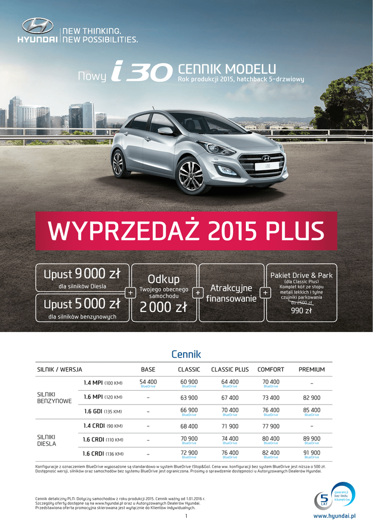 CENNIK MODELU Nowy Rok produkcji 2015, hatchback 5-drzwiowy WYPRZEDAŻ 2015 PLUS Upust 9 000 zł dla silników Diesla Upust 5 000 zł dla silników benzynowych Pakiet Drive & Park Odkup Twojego obecnego samochodu 2 000 zł (dla Classic Plus) Komplet kół ze stopu metali lekkich i tylne czujniki parkowania do 2500 zł Atrakcyjne finansowanie 990 zł Cennik SILNIK / WERSJA SILNIKI BENZYNOWE BASE CLASSIC CLASSIC PLUS COMFORT PREMIUM 1.4 MPI (100 KM) 54 400 60 900 64 400 70 400 BlueDrive - 1.6 MPI (120 KM) - 63 900 67 400 73 400 82 900 1.6 GDI - 66 900 70 400 76 400 85 400 (90 KM) - 68 400 71 900 77 900 - 1.6 CRDI (110 KM) - 70 900 74 400 80 400 89 900 1.6 CRDI - 72 900 76 400 82 400 91 900 (135 KM) 1.4 CRDI SILNIKI DIESLA (136 KM) BlueDrive BlueDrive BlueDrive BlueDrive BlueDrive BlueDrive BlueDrive BlueDrive BlueDrive BlueDrive BlueDrive BlueDrive BlueDrive BlueDrive BlueDrive Konfiguracje z oznaczeniem BlueDrive wyposażone są standardowo w system BlueDrive (Stop&Go). Cena ww. konfiguracji bez system BlueDrive jest niższa o 500 zł. Dostępność wersji, silników oraz samochodów bez systemu BlueDrive jest ograniczona. Prosimy o sprawdzenie dostępności u Autoryzowanych Dealerów Hyundai. Cennik detaliczny PLN. Dotyczy samochodów z roku produkcji 2015. Cennik ważny od 1.01.2016 r. Szczegóły oferty dostępne są na www.hyundai.pl oraz u Autoryzowanych Dealerów Hyundai. Przedstawiona oferta promocyjna skierowana jest wyłącznie do Klientów indywidualnych. 1 www.hyundai.pl Wyposażenie Bezpieczeństwo NOWY HYUNDAI Base Classic Classic Plus Comfort Premium - - - - - - - - - - - Pakiet zimowy 1000 zł - - - Pakiet 4000 zł Pakiet 4000 zł - - - Pakiet 5500 zł Pakiet 5500 zł 1900 zł 195/65 R15 - 1900 zł 195/65 R15 - 1900 zł 195/65 R15 1900 zł 205/55 R16 1900 zł 225/45 R17 Komputer pokładowy Zegar cyfrowy Uchwyt na kubek Kierownica regulowana w dwóch płaszczyznach Oparcie siedzenia tylnego dzielone w proporcji 60:40 Półka nad przestrzenią bagażową Schowek pod podłogą bagażnika Schowek na okulary w konsoli centralnej nad głową Materiałowe wykończenie drzwi Podświetlana stacyjka Podłokietnik przedni ze schowkiem Podłokietnik tylny Kieszenie w oparciach siedzeń przednich Skórzane koło kierownicy i gałka dźwigni zmiany biegów Elektrochromatyczne lusterko wsteczne Lusterko wsteczne z kamerą cofania Tapicerka materiałowo-skórzana (skóra naturalna/sztuczna + dzianina) Elektrycznie regulcja położenia fotela kierowcy Zestaw wskaźników typu Supervision z wyświetlaczem TFT - - - - Ilość głośników (w tym wysokotonowe) Radio z RDS + CD + MP3 Zdalne sterowanie systemem audio na kierownicy System Bluetooth Podłączenie AUX + USB + iPod 4 - 4 - 4 6 (2) 6 (2) Automatyczna skrzynia biegów (dla silników 1.6 MPI) - 4000 zł 4000 zł 4000 zł 4000 zł Dwusprzęgłowa automatyczna skrzynia biegów (dla silnika 1.6 GDI) - 5500 zł 5500 zł 5500 zł 6000 zł Dwusprzęgłowa automatyczna skrzynia biegów (dla silnika 1.6 CRDI) - 6000 zł 6000 zł 6000 zł 6000 zł Poduszki bezpieczeństwa przednie Poduszki bezpieczeństwa boczne Poduszki bezpieczeństwa kurtynowe (przód i tył) Poduszki bezpieczeństwa - kolanowa kierowcy Wyłącznik przedniej poduszki bezpieczeństwa pasażera ESC, VSM - systemy stabilizacji toru jazdy HAC - asystent ruszania pod górę Blokada zamka drzwi tylnych Sygnalizacja niezapiętych pasów (przód i tył) Mocowanie fotelików dziecięcych - system ISOFIX Ilość tarcz hamulcowych (w tym wentylowane) Czujnik ciśnienia w oponach Komfort Elektryczne wspomaganie kierownicy Elektrycznie regulowane szyby przednie Gniazdko 12V Gniazdko 12V w bagażniku Nawiew zimnego / ciepłego powietrza na tylne siedzenia Centralny zamek sterowany kluczykiem Składany kluczyk z pilotem centralnego zamka Alarm Chłodzony schowek po stronie pasażera Klimatyzacja manualna Klimatyzacja automatyczna (dwustrefowa) Flex Steer (trzy tryby pracy wspomagania kierownicy) Regulacja wysokości siedzenia kierowcy Regulacja wysokości siedzenia pasażera z przodu Lampki do czytania z przodu Elektrycznie regulowane szyby tylne Szyby atermiczne Elektryczna regulacja podparcia lędźwiowego dla siedzenia kierowcy Podświetlone lusterka do makijażu Tempomat Czujniki parkowania (tył) Czujnik deszczu Częściowo ogrzewana szyba przednia Elektrycznie regulowane szyby przednie z funkcją bezpieczeństwa i Auto Up / Down Inteligentny system wspomagania parkowania Dostęp bezkluczykowy z przyciskiem Start/Stop Podgrzewane koło kierownicy Podgrzewane siedzenia przednie Panoramiczne okno dachowe i przyciemniane szyby (niedostępne dla Comfort 1.6 GDi oraz 1.6 CRDi) Nawigacja fabryczna z kamerą cofania i pakietem aktualizacji MapCare Zewnętrzne Lakier metaliczny/perłowy Spojler dachowy Lusterka zewnętrzne regulowane elektrycznie i podgrzewane Lusterka zewnętrzne w kolorze nadwozia Lusterka zewnętrzne ze zintegrowanymi kierunkowskazami Światła do jazdy dziennej typu LED Przednie światła przeciwmgielne Statyczne doświetlanie zakrętów Przednie światła ksenonowe (adaptacyjne) Tylne światła typu LED Rozmiar opon i kół Zestaw naprawczy Dojazdowe koło zapasowe Felgi aluminiowe Klamki zewnętrzne w kolorze nadwozia Wewnętrzne Audio 4 (2) 4 (2) 4 (2) 4 (2) 4 (2) Opcje dodatkowe 2 Gwarancja NOWY HYUNDAI 5 lat gwarancji bez limitu kilometrów* wyraża nasze zaangażowanie w oferowanie najwyższej jakości i świetnej obsługi. Dzięki temu będziesz cieszyć się jazdą przez długie lata. Gwarancja obejmuje również: 5 lat Assistance | Pięcioletnia usługa pomocy drogowej obejmuje próbę naprawienia pojazdu na miejscu. W zależności od sytuacji zapewniamy: holowanie do najbliższego dealera Hyundaia, pojazd zastępczy, transport pasażerów lub zakwaterowanie. Szczegółowe warunki u dealerów. 5 lat bezpłatnej kontroli stanu technicznego | Raz w roku użytkownik ma prawo do wykonania w ASO bezpłatnego sprawdzenia pięciu punktów kontrolnych samochodu. Usługa 