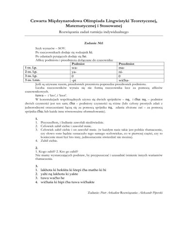 Czwarta Międzynarodowa Olimpiada Lingwistyki Teoretycznej, Matematycznej i Stosowanej Rozwiązania zadań turnieju indywidualnego Zadanie №1 Szyk wyrazów – SOV. Po rzeczownikach dodaje się rodzajnik ki. Po zdaniach pytających dodaje się he. Afiksy podmiotu i przedmiotu dołączane do czasownika: Podmiot Przedmiot 1 os. l.p. wama2 os. l.p. yani3 os. l.p. 0 0 3 os. l.mn. -pi wičhaJeśli są używane razem, przedorstek przemiotu poprzedza przedrostek podmiotu. Liczba rzeczowników wyraża się nie formą rzeczownika lecz za pomocą afiksów czasownikowych. tuwa – i ‘kto’, i ‘ktoś’. W konstrukcjach współrzędnych używa się dwóch spójników – ną, i čha: ną, – podmiot dwóch czynności jest ten sam; čha – podmioty czynności są różne (lub: człony prostych zdań z jednorodnymi orzeczeniami łączą się za pomocą spójnika ną, zdania złożone zaś – za pomocą spójnika čha; lub każde inne równoważne sformułowanie). 1. 1. Przyszedłem, i Indianie zawołali niedźwiedzie. 2. Człowiek zabił ciebie i zawołał mnie. 3. Człowiek zabił ciebie i on zawołał mnie. (w każdym razie takie jest polskie tłumaczenie, czy słowo «on» będzie oznaczało tego samego «człowieka», co w pierwzej części, czy to koniecznie musi być kto inny, jednoznacznie stwierdzić nie można). 4. Zabił ciebie. 2. 1. Kogo zabił? 2. Kto go zabił? Nie mamy wystarczających podstaw, by przypuszczać i uzasadnić istnienie innych wariantów tłumaczenia. 3. 1. 2. 3. 4. lakhota ki hokšita ki ktepi čha matho ki hi yahi ną lakhota ki yakte tuwa wačho he wičhaša ki hipi čha tuwa wičhakte Zadanie: Piotr Arkadiew Rozwiązanie: Aleksandr Piperski Czwarta Międzynarodowa Olimpiada lingwistyki. Rozwiązania zadań turnieju indywidualnego 2 Zadanie №2 1. Rodzajniki. W zadaniu były podane rzeczowniki z rodzajnikami el (w l.mn. els) i la (w l.mn. les). Jest oczywiste, że te rodzajniki należą odpowiednio do rodzaju męskiego i żeńskiego, to widać między innymi w katalońskich wyrazach ‘zwolennik’ i ‘zwolenniczka’. 2. Akcent. Widać, że znak знак ` zaznacza się nad literami e, o, a, zaś znak ´ – nad literami i, u. Z zestawienia słów kończących się na –s wynika, że znaki akcentu zaznaczane są tylko nad ostatnią i trzecią sylabą od końca. Można z tego wyciągnąć wniosek, iż akcent w takich wyrazach pada zazwyczaj na przedostatnią sylabę (w innych przypadkach akcent zaznacza się na piśmie). We wszystkich pozostałych wyrazach akcent pada na ostatnią sylabę (inaczej zaznacza się). 3. Liczba mnoga. Widać, że wspomniana wyżej końcówka –s nie jest dodawana do wyrazów, których forma liczby pojedynczej już kończy się na -s. Oprócz tego, w zadaniu podane są wyrazy z końcówką l.mn –os. Podzielmy wszystkie wyrazy na grupy w zależności od ich rodzaju, spółgłoski końcowej i tego, jak tworzą formę l.mn.: Spółgłoska Forma l.mn. –s (0 po s) Forma l.mn. –os końcowa rodzaj męski rodzaj żeński rodzaj męski rodzaj żeński -s el cactus la càries el gimnàs el pàncrees la trencadís el permís el vas -x el apèndix la hèlix el flux el índex el suffix el teix -ç la faç el contumaç (la sequaç) el pedaç (el sequaç) Widać, że wyrazy r.ż. tworzą liczbę mnogą tylko za pomocą końcówki -s (0 po s). W r.m. końcówka –os dodaje się do wyrazów, w których akcent pada na ostatnią sylabę (między innymi do jednosylabowych wyrazów), zaś –s (0 po s) – do wszystkich pozostałych wyrazów. 1. tragarz els bastaixos el bastaix els troleibusos trolejbus el troleibús łąka la clos les clos tęcza els iris el iris pętla els llaços el llaç onyks els ònixs el ònix miednica les pelvis la pelvis mieszkanie els pisos el pis zwolennik el els sequaços sequaç zwolenniczka la les sequaçs el tastaolletes els tastaolletes lekkoduch (litera) iks les xeixs la xeix Teoretycznie możliwe formy *la clo i *el tastaollete średnio odpowiadają danym wyjściowym, z których wynika, że chodzi tylko o rzeczowniki kończące się na s, x lub ç. Formy *el sequaços i *la sequaçs też nie są poprawne, ponieważ widać, że wyrazy ‘zwolennik’ i ‘zwolenniczka’ różnią się w l.p. tylko rodzajnikiem. 2. Znaki ` i ´ są pisane, jeśli akcent pada na inną sylabę niż zazwyczaj. 3. Kiedy nie ma znaków ` i ´, akcent pada na przedostatnią sylabę, jeśli słowo kończy się na s, lub na ostatnią sylabę (w pozostałych przypadkach). Zadanie i rozwiązanie: Boris Iomdin Czwarta Międzynarodowa Olimpiada lingwistyki. Rozwiązania zadań turnieju indywidualnego 3 Zadanie №3 «Haczyk», który ma miejsce w każdym wyrazie w środku lub po prawej stronie (w wyrazach, składających się z dwóch znaków), oznacza obecność samogłoski. Kółeczko nad nim oznacza krótkość (brak kółeczka odpowiednio długość). Dzięki wyrazom «namiętność» i «skręcać», które zawierają znak nie spotykany gdzie indziej, określamy, że kierunek pisma z lewej na prawo, a «rzadki znak» to k. Pozostałe znaki tych wyrazów – m (ostatnia spółgłoska w wyrazie «namiętność») i ŋ (w wyrazie «skręcać»). Wyraz «mieć» – jako jedyny, zaczynający się na m, pozwala ustalić znak dla n i t.d. Każda spółgłoska ma swoje własne oznaczenie, oprócz końcowego m w wyrazach z krótkimi samogłoskami; istnieje specjalny znak dla początkowej zerowej spółgłoski. 1. ‘namiętność’ ‘móc’ ka:m a:c ‘ssać pierś’ ‘czekać’ am cam ‘delta’ piъm poьm ‘trzymać w zębach’ ‘piec na rożnie’ noьm ‘prowadzić’ aŋ ŋoьm ‘niewyraźnie’ peьŋ ‘zagradzać drogę’ ‘skręcać’ ŋiъk miъn ‘mieć’ ‘ociosywać’ caŋ Aby zapisać wyrazy w transkrypcji łacińskiej, konieczne jest ustalenie zasad wyboru samogłoski: ponieważ znak dla samogłoski jest wszędzie ten sam, jakość samogłoski powinna zależeć od spółgłosek (i, możliwie, od ilości). 