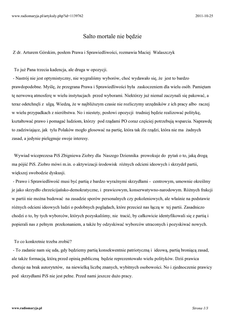 www.radiomaryja.pl/artykuly.php?id=1139762 2011-10-25 Salto mortale nie będzie Z dr. Arturem Górskim, posłem Prawa i Sprawiedliwości, rozmawia Maciej Walaszczyk To już Pana trzecia kadencja, ale druga w opozycji. - Nastrój nie jest optymistyczny, nie wygraliśmy wyborów, choć wydawało się, że jest to bardzo prawdopodobne. Myślę, że przegrana Prawa i Sprawiedliwości była zaskoczeniem dla wielu osób. Pamiętam tę nerwową atmosferę w wielu instytucjach przed wyborami. Niektórzy już niemal zaczynali się pakować, a teraz odetchnęli z ulgą. Wiedzą, że w najbliższym czasie nie rozliczymy urzędników z ich pracy albo raczej w wielu przypadkach z nieróbstwa. No i niestety, posłowi opozycji trudniej będzie realizować politykę, kształtować prawo i pomagać ludziom, którzy pod rządami PO coraz częściej potrzebują wsparcia. Naprawdę to zadziwiające, jak tylu Polaków mogło głosować na partię, która tak źle rządzi, która nie ma żadnych zasad, a jedynie pielęgnuje swoje interesy. Wywiad wiceprezesa PiS Zbigniewa Ziobry dla Naszego Dziennika prowokuje do pytań o to, jaką drogą ma pójść PiS. Ziobro mówi m.in. o aktywizacji środowisk różnych odcieni ideowych i skrzydeł partii, większej swobodzie dyskusji. - Prawo i Sprawiedliwość musi być partią z bardzo wyraźnymi skrzydłami - centrowym, umownie określmy je jako skrzydło chrześcijańsko-demokratyczne, i prawicowym, konserwatywno-narodowym. Różnych frakcji w partii nie można budować na zasadzie sporów personalnych czy pokoleniowych, ale właśnie na podstawie różnych odcieni ideowych ludzi o podobnych poglądach, które przecież nas łączą w tej partii. Zasadniczo chodzi o to, by tych wyborców, których pozyskaliśmy, nie tracić, by całkowicie identyfikowali się z partią i popierali nas z pełnym przekonaniem, a także by odzyskiwać wyborców utraconych i pozyskiwać nowych. To co konkretnie trzeba zrobić? - To zadanie nam się uda, gdy będziemy partią konsekwentnie patriotyczną i ideową, partią broniącą zasad, ale także formacją, którą przed opinią publiczną będzie reprezentowało wielu polityków. Dziś prawica choruje na brak autorytetów, na niewielką liczbę znanych, wybitnych osobowości. No i zjednoczenie prawicy pod skrzydłami PiS nie jest pełne. Przed nami jeszcze dużo pracy. www.radiomaryja.pl Strona 1/3 Co można zrobić w parlamencie, w którym pojawił się Palikot z byłym szefem Faktów i Mitów , powrócił Leszek Miller, a rząd znów tworzy bezideowa PO? Jaki ma Pan plan działania? - Mamy trzy lata do najbliższych wyborów, a może nawet mniej czasu, jeśli rząd potwierdzi swoją nieudolność w najbliższych miesiącach i latach. Musimy pokazać wyborcom, że tylko PiS jako formacja centroprawicowa jest alternatywą rządów PO. Myślę, że w ludziach będzie narastała tęsknota za porządkiem społecznym opartym na zasadach moralnych, że z czasem zaczną dostrzegać wartość w takich sprawach, jak Polska, patriotyzm i krzyż. PiS musi z jednej strony wyczuć te tęsknoty Polaków, ale z drugiej nie może czekać na falę, która przyjdzie, lecz samemu tę falę spowodować. Będzie to możliwe, jeśli nawiążemy bardzo szeroką współpracę z organizacjami społecznymi i mediami, którym zależy na odnowie moralnej i swoistej kulturowej kontrrewolucji. No i wydaje się, że trzeba przeprosić się z niektórymi dawnymi liderami PiS, którzy kiedyś stanowili wielką wartość naszej partii. To poważna deklaracja. - Musimy jednoczyć siły, nie możemy utracić już ani jednego posła. No i musimy być dobrze zorganizowani wewnętrznie, w Sejmie i w strukturach krajowych, nadal rozbudowywać PiS w stałym wewnętrznym dialogu, bo nikt nie ma monopolu na pomysł, jak zwyciężyć następne wybory. Które ze spraw wymagają dziś szczególnego monitoringu przez lobby konserwatywne i chrześcijańskie w parlamencie? - Niewątpliwie sprawy światopoglądowe, które będą zagrożone, które znajdą się pod presją Palikotów i Millerów. Partie, które są reprezentowane przez tych polityków, będą prześcigały się w uwiarygodnianiu swojej lewicowości, będziemy świadkami spirali radykalizmu. Pojawią się projekty ustaw, które będą uderzały w ludzkie życie i w porządek moralny i tak już poważnie nadszarpnięty. Walka z krzyżem i próby wykluczenia głosu katolickiego z debaty publicznej staną się normą. Już politycy lewicy starają się odbierać głos Kościołowi. Musimy postawić temu zdecydowanie tamę, ale też uważać, by nie dać się sprowokować do podobnie skrajnych postaw. Nasza walka o państwo chrześcijańskie nie może ograniczać się do werbalnych sporów. Mam nadzieję, że hasło niskie podatki dla ojca i matki zostanie zrealizowane w konkretnej ustawie, która będzie ekonomicznie wzmacniała nasze rodziny. Niewątpliwie PO będzie jeszcze raz musiała zająć stanowisko, czy jest za pełną ochroną życia. Pamiętajmy, że bez poparcia przynajmniej części posłów PO nie da się zrealizować polityki prorodzinnej. Senator elekt PO Jan Filip Libicki, a kiedyś poseł PiS, wzywa do wspierania prawego skrzydła PO. To dość bałamutne, ale odkrywające intencje Tuska - on właśnie zbudował lewicowe skrzydło i nie zrezygnował www.radiomaryja.pl Strona 2/3 z tworzenia koncesjonowanej prawicy. - Platforma ewidentnie przesuwa się w lewo. Zagospodarowała znaczną część elektoratu centrowego, a teraz we współpracy z Palikotem będzie chciała rozszabrować resztki po Sojuszu Lewicy Demokratycznej. Takie kwiatki do kożucha jak senator Libicki nie zmienią prawdziwego obrazu tej partii. To że frakcja konserwatywna w PO jest fikcją, pokazały głosowania nad obywatelskim projektem ustawy antyaborcyjnej. Przy pierwszym głosowaniu frakcja konserwatywna liczyła 56 posłów, ale gdy premier Tusk wprowadził dyscyplinę głosowania - stopniała do 15. Takie osoby jak senator Lib