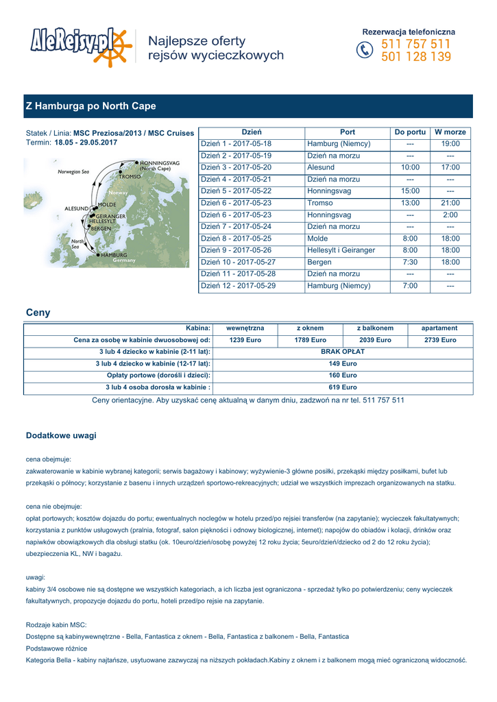 Z Hamburga po North Cape Dzień Statek / Linia: MSC Preziosa/2013 / MSC Cruises Termin: 18.05 - 29.05.2017 Dzień 1 - 2017-05-18 Port Do portu W morze --- 19:00 Hamburg (Niemcy) Dzień 2 - 2017-05-19 Dzień na morzu Dzień 3 - 2017-05-20 Alesund --- --- 10:00 17:00 Dzień 4 - 2017-05-21 Dzień na morzu --- --- Dzień 5 - 2017-05-22 Honningsvag 15:00 --- Dzień 6 - 2017-05-23 Tromso 13:00 21:00 Dzień 6 - 2017-05-23 Honningsvag --- 2:00 Dzień 7 - 2017-05-24 Dzień na morzu --- --- Dzień 8 - 2017-05-25 Molde 8:00 18:00 Dzień 9 - 2017-05-26 Hellesylt i Geiranger 8:00 18:00 Dzień 10 - 2017-05-27 Bergen 7:30 18:00 Dzień 11 - 2017-05-28 Dzień na morzu --- --- Dzień 12 - 2017-05-29 Hamburg (Niemcy) 7:00 --- Ceny Kabina: Cena za osobę w kabinie dwuosobowej od: wewnętrzna z oknem z balkonem apartament 1239 Euro 1789 Euro 2039 Euro 2739 Euro 3 lub 4 dziecko w kabinie (2-11 lat): BRAK OPŁAT 3 lub 4 dziecko w kabinie (12-17 lat): 149 Euro Opłaty portowe (dorośli i dzieci): 160 Euro 3 lub 4 osoba dorosła w kabinie : 619 Euro Ceny orientacyjne. Aby uzyskać cenę aktualną w danym dniu, zadzwoń na nr tel. 511 757 511 Dodatkowe uwagi cena obejmuje: zakwaterowanie w kabinie wybranej kategorii; serwis bagażowy i kabinowy; wyżywienie-3 główne posiłki, przekąski między posiłkami, bufet lub przekąski o północy; korzystanie z basenu i innych urządzeń sportowo-rekreacyjnych; udział we wszystkich imprezach organizowanych na statku. cena nie obejmuje: opłat portowych; kosztów dojazdu do portu; ewentualnych noclegów w hotelu przed/po rejsiei transferów (na zapytanie); wycieczek fakultatywnych; korzystania z punktów usługowych (pralnia, fotograf, salon piękności i odnowy biologicznej, internet); napojów do obiadów i kolacji, drinków oraz napiwków obowiązkowych dla obsługi statku (ok. 10euro/dzień/osobę powyżej 12 roku życia; 5euro/dzień/dziecko od 2 do 12 roku życia); ubezpieczenia KL, NW i bagażu. uwagi: kabiny 3/4 osobowe nie są dostępne we wszystkich kategoriach, a ich liczba jest ograniczona - sprzedaż tylko po potwierdzeniu; ceny wycieczek fakultatywnych, propozycje dojazdu do portu, hoteli przed/po rejsie na zapytanie. Rodzaje kabin MSC: Dostępne są kabinywewnętrzne - Bella, Fantastica z oknem - Bella, Fantastica z balkonem - Bella, Fantastica Podstawowe różnice Kategoria Bella - kabiny najtańsze, usytuowane zazwyczaj na niższych pokładach.Kabiny z oknem i z balkonem mogą mieć ograniczoną widoczność. Możliwość zamówienia do kabiny śniadania za dopłatą. Kategoria Fantastica - kabiny droższe, usytuowane na wyższych pokładach.W cenie- bezpłatne śniadanie do kabiny- 50% zniżki na zajęcia fitness, joga lub treningi na siłowni z indywidualnym trenerem ALL INCLUSIVE (opcja)Warunkiem skorzystania z pakietu all inclusive jest wykupienie pakietu przez wszystkich pasażerów podróżujących w jednej kabinie na czas całego rejsu. ALL INCLUSIVE - ALLEGRISSIMO - 26euro/doba/osoba - napoje w restauracji i barze samoobsługowym: wybrane wina serwowane w kieliszkach (2 białe, 2 czerwone, 1 różowe), woda mineralna, piwo z nalewaka, napoje bezalkoholowe, napoje w barach: wybrane koktajle alkoholowe i bezalkoholowe, napoje bezalkoholowe, aperitifs, wybrane wina serwowane w kieliszkach, wybrane wódki, likiery i bitters, caffeteria (kawa, cappuccino, gorąca czekolada, gorąca herbata), lody na wynos w kubeczku lub wafelku, (niektóre marki drinków są wykluczone z w/w pakietu zgodnie z listą dostępną na pokładzie statku) ALL INCLUSIVE ALLEGRISSIMO CHILD (DLA DZIECI) - 13euro/doba/osoba - napoje w restauracji i barze samoobsługowym: woda mineralna i napoje bezalkoholowe, soki owocowe, woda mineralna, gorące napoje, świeżo wyciskane soki, smoothies, milkshakes, lody na wynos w wafelku lub kubeczku. ALL INCLUSIVE - PREMIUM - 44euro/doba/osoba - napoje w restauracji i barze samoobsługowym: wino serwowane w kieliszkach, woda mineralna, piwo (również w butelkach), napoje bezalkoholowe, napoje w mini barze oraz woda mineralna w kabinie, napoje w barach: wszystkie napoje z Menu w barze (również marki premium) specjalne Menu: wszystkie produkty z Menu "Gelateria", Chocolate bar i Pastry, shop delights, jedzenie z Room Service Menu. PAKIETY NAPOJÓW - można też skorzystać z zakupu napojów w pakietach, można je dowolnie komponować. Przykładowe pakiety napojów wraz z ich orientacyjnymi cenami*:Pakiet wody - 14 butelek wody mineralnej (1 litr) - 27,00 euro,Pakiet napojów bezalkoholowych - 14 napoje w puszkach lub soki 34.00 euro,Pakiet piwa - 14 butelek/puszek piwa - 59,00 euro,Pakiet win - 4 wybrane butelki wina w restauracji głównej - 69,00 euro.*Szczegółowy opis pakietów all inclusive oraz pakietów napojów przedstawiamy klientom na życzenie. MSC Preziosa/2013 MSC Preziosa Rok budowy: 2013 - najnowszy statek linii MSC Tonaż: 139.000 ton Długość: 333 m Szerokość: 38 m Szybkość: 23,7 węzłów Pokłady pasażerskie: 13 Załoga:1370 Pasażerowie: 3.959 Waluta: EURO BARY I RESTAURACJE: Bar przy basenie, lodziarnia, Piano Show Bar, kawiarnia, cukiernia, winiarnia; Preziosa Bar, Phoenician Plaza, Safari Lounge, The Green Sax, Diamond, El Dorado, Il Cappuccino, Saphir Bar, Turquoise Bar. Bufet/kawiarnia samoobsługowa, restauracje główne, pizzeria, restauracja Tex Mex, specjalne restauracje dedykowane gościom Yacht Club; The Golden Lobster, L'Arabesque, La Locanda, Pizzeria Wine Bar, Eataly Restaurant, Ristorante Italia, Maya&Inca, La Palmeraie, Sports and Bowling Diner, Galaxy Lounge. *SPA, ATRAKCJE SPORTOWE: Bieżna, centrum sportowe, solarium, koszykówka, tenis, MSC AUREA SPA oferuje nowoczesne zabiegi, takie jak pakiety lecznicze z błota, zabiegi aromaterapii, masaże i wiele innych. *ROZRYWKA: Biblioteka, Teatr Platinum w którym co wieczór odbywają się interesujące spektakle, widowiska muzyczne oraz taneczne, Dyskoteka, Dyskoteka dla nastolatkówKącik zabaw dla dzieci, Kafejka internetowa, Kino 4D, Kasyno M