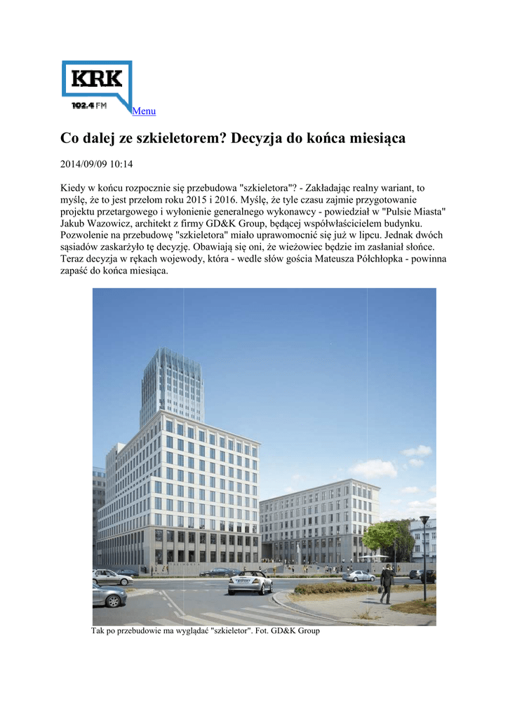 Menu Co dalej ze szkieletorem? szkielet Decyzja do końca ca miesi miesiąca 2014/09/09 10:14 Kiedy w końcu cu rozpocznie się przebudowa "szkieletora"? - Zakładającc realny wariant, to myślę, żee to jest przełom roku 2015 i 2016. Myślę, My żee tyle czasu zajmie przygotowanie projektu przetargowego i wyłonienie wyłonieni generalnego wykonawcy - powiedział w "Pulsie Miasta" Jakub Wazowicz, architekt z firmy GD&K Group, będącej b współwłaścicielem cicielem budynku. Pozwolenie na przebudowęę "szkieletora" miało uprawomocnić uprawomocni się już w lipcu. Jednak dwóch sąsiadów zaskarżyło tę decyzję. decyzję Obawiają się oni, że wieżowiec będzie dzie im zasłaniał słońce. sło Teraz decyzja w rękach kach wojewody, która - wedle słów gościa cia Mateusza Półchłopka - powinna zapaść do końca miesiąca. Tak po przebudowie ma wyglądać wygl "szkieletor". Fot. GD&K Group Mateusz Półchłopek: Witam państwa, witam też mojego gościa Jakuba Wazowicza, architekta z grupy GD&K, czyli inaczej mówiąc nieoficjalnego rzecznika prasowego współwłaściciela szkieletora. Jakub Wazowicz: Witam państwa. Jak jeden problem znika, to pojawia się następny. Pozwolenie na budowę miało szansę uprawomocnić się już w lipcu, ale dwóch sąsiadów protestuje. Obawiają się, że wasz wieżowiec zasłoni im słońce, zasłoni? To dopiero rozstrzygnie wydział, który te dwa wnioski rozpatruje. Rozumiem, że państwo zarzekacie się, że absolutnie tam żadnego błędu projektowego nie było i to słońce będzie dla wszystkich sąsiadów? Nie my jesteśmy autorem projektu. Na szczęście trafił on w ręce bardzo doświadczonego biura architektonicznego, co do kompetencji którego nie ma najmniejszych wątpliwości. Ufacie im? Powiem szczerze, że też miałem przyjemność obejrzeć tę analizę. Jest ona imponująca, ponieważ niecodziennie ogląda się linijkę słońca takiego budynku jak „szkieletor”. Nie mniej jednak, tutaj kluczowa do sprawdzenia jest taka kwestia, czy osoby, które wnoszą jakieś uwagi, mają zastrzeżenia do finalnej bryły i gabarytów budynku, czy do aktualnych. Jeśli są to osoby, które mieszkają w bezpośrednim sąsiedztwie „szkieletora”, to tak czy siak – mówiąc kolokwialnie – w jakiś sposób ten budynek oddziałuje na ich inwestycje, to tutaj tego typu wnioski są nieuzasadnione. A próbowali państwo jakoś dotrzeć do tych sąsiadów, do tych protestujących? Jakoś z nimi porozmawiać, wytłumaczyć? Powiem szczerze, że tego typu działania mogły by zostać odebrane dość dziwne. Nie naszą rolą jest rozmowa z sąsiadami. Czyli nie? Nie. Czyli teraz wszystko w rękach wojewody? Mamy informację, że do końca września powinniśmy mieć zinterpretowane te dwa wnioski. A sąsiedzi mogą jeszcze walczyć i ewentualnie odwołać się do sądu administracyjnego? Zobaczymy jak to będzie. Mamy dość komfortową sytuację, ponieważ teren objęty jest miejscowym planem. Tutaj naprawdę trzeba mieć mocne argumenty, żeby próbować z tym planem w jakiś sposób walczyć. Wydaje mi się, że te dwa wnioski, o których już nawet pisze Wikipedia – wczoraj to sprawdzałem – nie są jakąś realną dla nas groźbą. Czyli możemy założyć pozytywny scenariusz, że wojewoda i sądy nie przyznają im racji. Tak zakładając, że kolejnym krokiem będzie przetarg na projekt wykonawczy wieżowca? I tak, i nie. Przetarg na pewno, ale bazujący na projekcie przetargowym, który wcześniej trzeba będzie wykonać. To jest kolejny etap, dość żmudny i precyzyjny – trwający kilka miesięcy. Na podstawie tego projektu dopiero zostanie wybrany wykonawca i rozpocznie się jeszcze dłuższy, jeszcze żmudniejszy, bo właściwie trwający przez cały proces budowy projekt wykonawczy. To zakładając pozytywny wariant, kiedy może rozpocząć się budowa? Zakładając realny wariant, myślę, że jest to przełom roku 2015 i 2016. Tyle czasu zajmie przygotowanie projektu przetargowego i wyłonienie generalnego wykonawcy. A z tyłu głowy cały czas są te kary naliczane przez miasto za nierozpoczęcie budowy w terminie? W związku z tym ta budowa powinna ruszyć jak najszybciej i tutaj nie tylko nam, ale wielu innym osobom i instytucjom powinno zależeć, żeby to wszystko szło sprawnie. Współwłaściciel budynku Henryk Gaertner zdradził mi nie tak dawno, że jeśli kary będą cały czas naliczane, to hipotetycznie do końca budowy, mogą one wynieść nawet 190 milionów złotych. Sporo. Sporo. Dla porównania można powiedzieć, że koszt budowy dziesięciopiętrowego budynku mieszkalnego to jest około kilkunastu, kilkudziesięciu milionów złotych. To pokazuje, jaka to jest gigantyczna skala. Myślę, że nie powinniśmy się martwić karami na chwilę obecną, ale tym, aby wszystkie te procesy szły w miarę sprawnie. Rozumiem, że właściciele „szkieletora” zaczną negocjacje z miastem w sprawie kar w momencie, gdy będą mieli w ręku prawomocne pozwolenie na budowę. Tak, myślę, że to jest najlepszy moment. A na jakie złagodzenie kary liczycie? Ciężko mi powiedzieć. To są sytuacje bezprecedensowe, więc ciężko powiedzieć, jak to powinno wyglądać, ponieważ nie ma scenariusza, który już kiedyś jakikolwiek inwestor w Krakowie... Ale rozumiem, że waszym celem jest kara 0 zł, czy jednak trochę poczuwacie się do tego, że jednak ta budowa nie została rozpoczęta w terminie i trochę możecie zapłacić? Jak to jest? Na pewno byłbym tu bardzo ostrożny z deklaracjami, bo to są dość poważne sprawy. Niemniej jednak my jako inwestor na przestrzeni tych wszystkich lat, a przypomnę, że to jest już prawie dziesięć lat, dokładaliśmy wszelkich starań, aby ta inwestycja i ta budowa ruszyła jak najszybciej. A w jaki sposób chcecie uniknąć tych kar? Prezydent Jacek Majchrowski powiedział, że sprawa kar to już jest kwestia sądu, bo miasto tak po prostu, nawet gdyby chcia