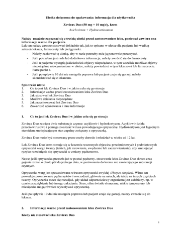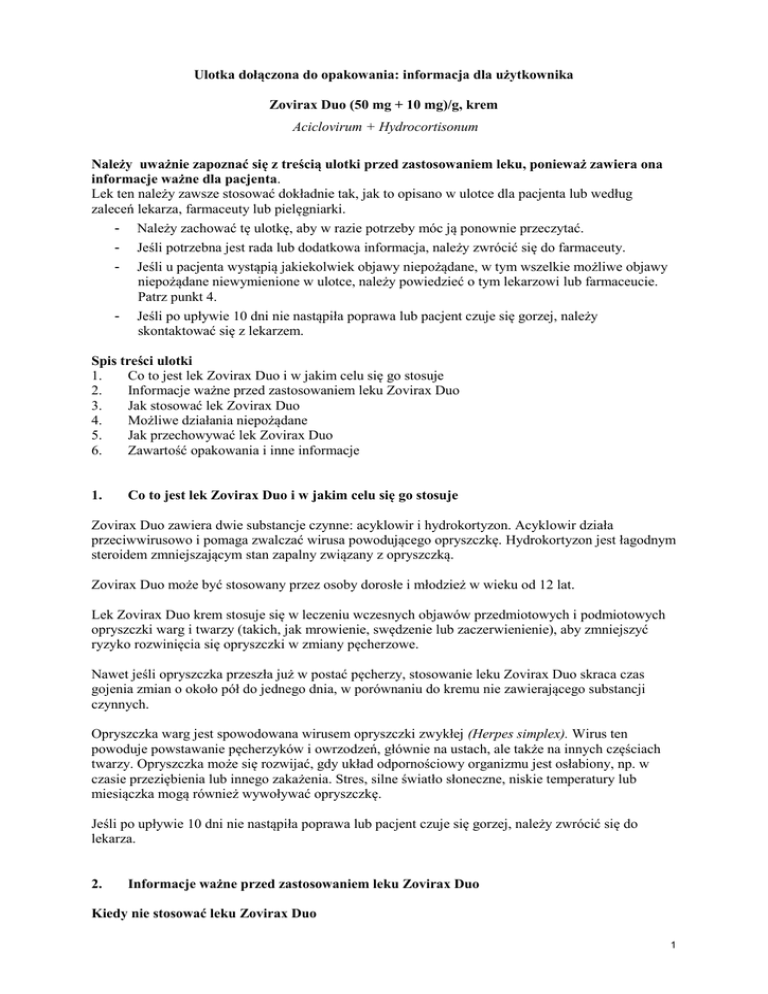 Ulotka dołączona do opakowania: informacja dla użytkownika Zovirax Duo (50 mg + 10 mg)/g, krem Aciclovirum + Hydrocortisonum Należy uważnie zapoznać się z treścią ulotki przed zastosowaniem leku, ponieważ zawiera ona informacje ważne dla pacjenta. Lek ten należy zawsze stosować dokładnie tak, jak to opisano w ulotce dla pacjenta lub według zaleceń lekarza, farmaceuty lub pielęgniarki. - Należy zachować tę ulotkę, aby w razie potrzeby móc ją ponownie przeczytać. - Jeśli potrzebna jest rada lub dodatkowa informacja, należy zwrócić się do farmaceuty. - Jeśli u pacjenta wystąpią jakiekolwiek objawy niepożądane, w tym wszelkie możliwe objawy niepożądane niewymienione w ulotce, należy powiedzieć o tym lekarzowi lub farmaceucie. Patrz punkt 4. - Jeśli po upływie 10 dni nie nastąpiła poprawa lub pacjent czuje się gorzej, należy skontaktować się z lekarzem. Spis treści ulotki 1. Co to jest lek Zovirax Duo i w jakim celu się go stosuje 2. Informacje ważne przed zastosowaniem leku Zovirax Duo 3. Jak stosować lek Zovirax Duo 4. Możliwe działania niepożądane 5. Jak przechowywać lek Zovirax Duo 6. Zawartość opakowania i inne informacje 1. Co to jest lek Zovirax Duo i w jakim celu się go stosuje Zovirax Duo zawiera dwie substancje czynne: acyklowir i hydrokortyzon. Acyklowir działa przeciwwirusowo i pomaga zwalczać wirusa powodującego opryszczkę. Hydrokortyzon jest łagodnym steroidem zmniejszającym stan zapalny związany z opryszczką. Zovirax Duo może być stosowany przez osoby dorosłe i młodzież w wieku od 12 lat. Lek Zovirax Duo krem stosuje się w leczeniu wczesnych objawów przedmiotowych i podmiotowych opryszczki warg i twarzy (takich, jak mrowienie, swędzenie lub zaczerwienienie), aby zmniejszyć ryzyko rozwinięcia się opryszczki w zmiany pęcherzowe. Nawet jeśli opryszczka przeszła już w postać pęcherzy, stosowanie leku Zovirax Duo skraca czas gojenia zmian o około pół do jednego dnia, w porównaniu do kremu nie zawierającego substancji czynnych. Opryszczka warg jest spowodowana wirusem opryszczki zwykłej (Herpes simplex). Wirus ten powoduje powstawanie pęcherzyków i owrzodzeń, głównie na ustach, ale także na innych częściach twarzy. Opryszczka może się rozwijać, gdy układ odpornościowy organizmu jest osłabiony, np. w czasie przeziębienia lub innego zakażenia. Stres, silne światło słoneczne, niskie temperatury lub miesiączka mogą również wywoływać opryszczkę. Jeśli po upływie 10 dni nie nastąpiła poprawa lub pacjent czuje się gorzej, należy zwrócić się do lekarza. 2. Informacje ważne przed zastosowaniem leku Zovirax Duo Kiedy nie stosować leku Zovirax Duo 1 jeśli pacjent ma uczulenie na acyklowir, walacyklowir, hydrokortyzon, lub którykolwiek z pozostałych składników tego leku (wymienionych w punkcie 6). w przypadku zakażeń skóry nie spowodowanych wirusem wywołującym opryszczkę. Ostrzeżenia i środki ostrożności Należy stosować lek Zovirax Duo jedynie na opryszczkę warg i twarzy. Należy porozmawiać z lekarzem w przypadku ciężkiej, nawracającej opryszczki aby sprawdzić czy u pacjenta nie występują inne problemy zdrowotne. Nie stosować leku Zovirax Duo: do oczu, wewnątrz jamy ustnej, do nosa lub na narządy płciowe, w leczeniu opryszczki narządów płciowych, jeżeli pacjent ma osłabiony układ odpornościowy, np. jest po przeszczepie szpiku kostnego lub jest zarażony wirusem HIV, razem z opatrunkami, takimi jak plastry opatrunkowe czy plastry na opryszczkę. Należy umyć ręce przed nałożeniem i po nałożeniu leku, w celu uniknięcia pogorszenia objawów choroby lub przeniesienia jej na inne osoby. Nie stosować leku dłużej niż przez 5 dni. Dzieci Nie stosować tego leku u dzieci w wieku poniżej 12 lat, ponieważ nie jest znana skuteczność oraz bezpieczeństwo jego stosowania w tej grupie wiekowej. Lek Zovirax Duo a inne leki Należy powiedzieć lekarzowi o wszystkich lekach przyjmowanych przez pacjenta obecnie lub ostatnio, a także o lekach, które pacjent planuje przyjmować, w tym wydawanych bez recepty. Nie wiadomo, czy działanie leku Zovirax Duo może się zmienić, jeśli pacjent stosuje w tym samym czasie inne leki. Zovirax Duo z jedzeniem i piciem Nie wolno nakładać tego leku tuż przed jedzeniem, ponieważ może być w takiej sytuacji zlizany. Ciąża, karmienie piersią i wpływ na płodność Jeśli pacjentka jest w ciąży lub karmi piersią, przypuszcza że może być w ciąży lub gdy planuje mieć dziecko, powinna poradzić się lekarza lub farmaceuty przed zastosowaniem tego leku. Nie należy stosować leku Zovirax Duo w okresie ciąży i karmienia piersią o ile lekarz nie uzna, że korzyść dla matki przeważa nieznane ryzyko. Prowadzenie pojazdów i obsługiwanie maszyn Lek Zovirax Duo nie wpływa na zdolność prowadzenia pojazdów i obsługi maszyn. Lek Zovirax Duo zawiera glikol propylenowy i alkohol cetostearylowy. Glikol propylenowy może powodować podrażnienie skóry. Alkohol cetostearylowy może powodować miejscowe reakcje skórne (np. kontaktowe zapalenie skóry). 3. Jak stosować lek Zovirax Duo Ten lek należy zawsze przyjmować dokładnie tak, jak to opisano w ulotce dla pacjenta lub według zaleceń lekarza, farmaceuty lub pielęgniarki. W razie wątpliwości należy zwrócić się do lekarza lub farmaceuty. 2 Lek Zovirax Duo jest przeznaczony wyłącznie do stosowania zewnętrznego. Stosowanie u dorosłych i dzieci w wieku powyżej 12 lat Nakładać lek 5 razy na dobę przez 5 dni (średnio co 3-4 godziny w ciągu dnia). Zaleca się rozpoczęcie leczenia jak najwcześniej, najlepiej po wystąpieniu pierwszych objawów opryszczki warg (takich, jak mrowienie, zaczerwienienie lub swędzenie). Nie stosować leku dłużej niż przez 5 dni. Jeśli objawy opryszczki utrzymują się dłużej niż przez 10 dni, należy skontaktować się z lekarzem. Stosowanie Należy myć ręce przed i po zastosowaniu kremu