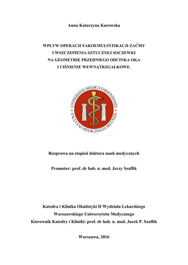 Anna Katarzyna Kurowska WPŁYW OPERACJI FAKOEMULSYFIKACJI ZAĆMY I WSZCZEPIENIA SZTUCZNEJ SOCZEWKI NA GEOMETRIĘ PRZEDNIEGO ODCINKA OKA I CIŚNIENIE WEWNĄTRZGAŁKOWE. Rozprawa na stopień doktora nauk medycznych Promotor: prof. dr hab. n. med. Jerzy Szaflik Katedra i Klinika Okulistyki II Wydziału Lekarskiego Warszawskiego Uniwersytetu Medycznego Kierownik Katedry i Kliniki: prof. dr hab. n. med. Jacek P. Szaflik Warszawa, 2016 STRESZCZENIE Postępujący z wiekiem proces mętnienia, powiększania się i przedniego przesunięcia soczewki, prowadzą do zmian parametrów biometrycznych w przednim odcinku oka. W niektórych oczach nałożenie się zmian związanych z wiekiem i specyficznej budowy anatomicznej obwodowej tęczówki i ciała rzęskowego, skutkuje powolnym, a czasem gwałtownym pierwotnym zamknięciem kąta (PZK) i wzrostem ciśnienia wewnątrzgałkowego. Odpowiednio długo trwające apozycyjne PZK może prowadzić do powstania obwodowych zlepów, a następnie zrostów przednich (PAS) i trwałego uszkodzenia beleczkowania. W konsekwencji wzrasta ciśnienie wewnątrzgałkowe, które z czasem doprowadza do uszkodzenia nerwu wzrokowego i rozwoju neuropatii jaskrowej. Współczesne techniki usuwania soczewki metodą fakoemulsyfikacji z wykorzystaniem technik małego cięcia i wszczepienie zwijalnej sztucznej soczewki do torebki, czynią operację zaćmy coraz bardziej bezpieczną, a efekt bardziej przewidywalny. Głównym celem operacji jest poprawa ostrości wzroku obniżonej na skutek zmętnienia soczewki. Dodatkowo wymiana naturalnej soczewki na cienki implant korzystnie wpływa na konfigurację struktur przedniego odcinka oka, zmniejsza lub eliminuje ryzyko przewlekłego zamknięcia kąta oraz usprawnia krążenie cieczy wodnistej. Skutkiem często bywa spadek ciśnienia wewnątrzgałkowego, co jest dodatkową korzyścią płynącą z operacji zaćmy, szczególnie dla oczu ze współistniejącą neuropatią jaskrową lub zagrożonych jej wystąpieniem. Na podstawie danych z literatury medycznej wiadomo, że efekt redukcji ciśnienia po operacji usunięcia soczewki występuje w oczach bez neuropatii jaskrowej oraz w różnych rodzajach jaskry pierwotnej i wtórnej. Poziom redukcji w określonych sytuacjach klinicznych oraz mechanizmy za to odpowiedzialne nie są jednoznaczne i pozostają przedmiotem badań i dyskusji. Liczni autorzy podejmowali próby ustalenia czynników wpływających na zakres pooperacyjnej redukcji ciśnienia. Korelację ciśnienia wykazano m.in. z głębokością komory przedniej, uwypukleniem soczewki (lens voult), dystansem otwarcia kąta (AOD500) i szerokością kąta tęczówkowo-rogówkowego (TIA). Najczęściej wykazywano, że spadek ciśnienia zależy głównie od jego przedoperacyjnych wartości. Możliwość prognozowania - na podstawie informacji przedoperacyjnych - zakresu pooperacyjnego spadku ciśnienia, jest tematem zainteresowania wielu badaczy. Taka informacja bowiem może być cenną wskazówką w podejmowaniu decyzji co do zakresu leczenia operacyjnego w danej sytuacji klinicznej. Celem niniejszej pracy była ocena wpływu operacji usunięcia zaćmy metodą fakoemulsyfikacji i wszczepienia sztucznej soczewki na parametry biometryczne przedniego odcinka oka oraz ciśnienie wewnątrzgałkowe we wczesnym i odległym okresie pooperacyjnym. Ponadto określenie parametrów biometrycznych wpływających na przed- i pooperacyjną głębokość komory przedniej oraz ocena zastosowania wskaźnika ITC (ITC index) w monitorowaniu obszaru zamknięcia kąta przy użyciu techniki swept-source AS-OCT. W końcu - poszukiwanie odpowiedzi na pytanie, czy na podstawie znajomości danych biometrycznych i ciśnienia wewnątrzgałkowego przed operacją możliwe jest prognozowanie wielkości spadku ciśnienia po operacji. Prospektywnym badaniem objęto 157 pacjentów (211 oczu) operowanych z powodu zaćmy w Katedrze i Klinice Okulistyki II Wydziału Lekarskiego WUM, Samodzielnym Publicznym Klinicznym Szpitalu Okulistycznym w Warszawie. Z badania wykluczono pacjentów po przebytych operacjach oka lub zabiegach laserowych; po urazach, z patologią rogówki, zapaleniem błony naczyniowej; wysokimi wadami refrakcji oraz innymi przyczynami jaskry wtórnej. Przebycie irydotomii laserowej Nd:YAG nie dyskwalifikowało z udziału w badaniu. Na podstawie wyniku pomiarów AS-OCT i informacji klinicznych, pacjenci zostali podzieleni na cztery grupy w zależności od przedoperacyjnego stanu kąta przesączania: JPOK (64 oczy) i grupę kontrolną otwartego kąta bez neuropatii (63 oczy) oraz z JPZK (41 oczu) i kontrolną do niej – pierwotnie zamkniętego kąta bez neuropatii (43 oczy). Wśród ocenianych parametrów znalazły się m.in.: ostrość wzroku i refrakcja przed i po operacji, ocena kąta wg skali Shaffera, obecność obwodowych zrostów przednich oraz liczba leków stosowanych w leczeniu jaskry; parametry biometryczne tj.: długość gałki ocznej, grubość i przednie uwypuklenie soczewki, głębokość i szerokość komory przedniej, parametry oceniające kąt tj. AOD500, TISA500, ARA500, TIA w czterech lokalizacjach (godz. 12.00, 6.00, 3.00 i 9.00), a także obszar zamknięcia kąta (wskaźnik ITC), szerokość źrenicy oraz centralna grubość rogówki. Parametry przedniego odcinka oceniano przed operacją oraz po 6 miesiącach od zabiegu z użyciem aparatu swept-source AS-OCT CASIA firmy Tomey; ciśnienie wewnątrzgałkowe mierzone metodą aplanacyjną Goldmanna przed operacją oraz w 1. dobie, po 2 i 4 tygodniach oraz 6, 12 i 36 (u części pacjentów) miesiącach po operacji. Pacjenci zostali poddani niepowikłanej procedurze fakoemulsyfikacji zaćmy z wszczepieniem sztucznej soczewki w okresie od lutego 2010 do stycznia 2012 roku. Dane poddano analizie statystycznej uzyskując następujące wyniki. Oczy z grupy zamkniętego kąta miały znacząco węższy kąt przesączania w badaniu klinicznym (p<0,0001) oraz wyższą nadwzroczność (p<0,05). Obwodowe z