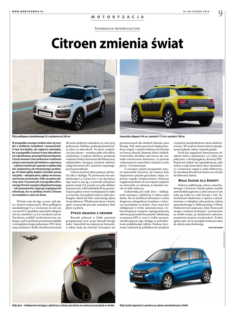 W W W.NOW YGORNIK.PL 16 –2 8 L U T E G O 2 014 M O T O R Y Z A C J A 9 Informacje motoryzacyjne MATERIAŁY PRASOWE MATERIAŁY PRASOWE Citroen zmienia świat Płyta podłogowa standardowego C4 z rozstawem osi 260 cm Samochód o długości 416 cm, szerokości 173 cm i wysokości 148 cm W przypadku nowego modelu mówi się zwykle o wielkości, kształtach i parametrach. O tym też będzie, ale najpierw pieniądze, bo w przypadku Cactusa to jest zdecydowanie najciekawsze, przynajmniej teoretycznie. Citroen bowiem chce zaoferować możliwość wzięcia samochodu jak telefonu u operatora – z planem taryfowym opartym o opłatę stałą lub uzależnioną od miesięcznego przebiegu. W skład opłaty będzie wchodzić prawie wszystko – ubezpieczenia, opłaty serwisowe, rata kosztu samochodu. Tylko za paliwo płacimy sami. To prawie jak w przypadku oferowanego firmom wynajmu długoterminowego – tak przynajmniej sugerują anglojęzyczne informacje, bo na polskiej stronie Citroena nie znalazłem o tym ani słowa. przeznaczonych dla młodych klientów poza Europą. Nad autem pracował międzynarodowy zespół z centrów badawczych Renault we Francji, Brazylii, Rumunii, Korei i Indiach. Uniwersalny charakter auta tworzy np. centralne umieszczenie kierownicy, co pozwala wykorzystywać samochód w krajach o ruchu prawo- i lewostronnym. Z zewnątrz pojazd przypomina mocne samochody terenowe, ale wnętrze było inspirowane ptasimi gniazdami, mając zapewnić wygodę i bezpieczeństwo. Masywny wygląd samochodu nie jest wsparty napędem na cztery koła, co wskazuje, że charakter macho to tylko stylizacja. Ciekawostką jest mały dron – helikopterek startujący z platformy w tylnej części dachu. Ma on uzyskiwać informacje o ruchu drogowym, fotografować krajobraz i wykrywać przeszkody na drodze. Dron może być obsługiwany w trybie automatycznym, wykorzystującym wstępnie zaprogramowaną sekwencję prowadzenia pojazdu i lokalizację za pomocą GPS-u, oraz w trybie ręcznym, umożliwiającym jego obsługę za pośrednictwem pokładowego tabletu. Funkcję sterowania większością pokładowych urządzeń Renault pokazał w Delhi prototyp przygotowany m.in. przez Renault Design India. Samochód ma pokazywać kierunek, w jakim będą się rozwijać koncepcje aut M ałe S uzuki dla E uropy Podczas najbliższego salonu samochodowego w Genewie Suzuki pokaże miejski samochodzik segmentu A, który jeszcze w tym roku ma trafić na rynki Europy i Azji. Samochód jest zbudowany w oparciu o przedstawiony w ubiegłym roku podczas salonu samochodowego w Delhi prototyp A:Wind. Podstawowymi pojęciami, które brano pod uwagę w tamtym prototypie i przeniesiono na model seryjny, są: dynamiczne nadwozie, przestronne wnętrze i wysoka jakość. To dość ogólny opis, ale na szczegóły trzeba poczekać do salonu samochodowego. PIOTR MYSZOR Mały dron – helikopterek startujący z platformy w tylnej części dachu ma wykrywać przeszkody na drodze MATERIAŁY PRASOWE P tasie gniazdo z dronem i systemów przejął dotykowy ekran obok kierownicy. We wnętrzu mamy motywy przeplatanych gałązek rodem z ptasich gniazd. Kwid jest napędzany benzynowym silnikiem turbo o pojemności 1,2 l, który jest połączony z dwusprzęgłową skrzynią EDC. Pojazd jest jednak tak zaprojektowany, żeby można w jego konstrukcji ukryć akumulatory i zastosować napęd w pełni elektryczny. Za znaczkiem Renault jest miejsce na wtyczkę do ładowania baterii. MATERIAŁY PRASOWE Wróćmy więc do tego, co jest, czyli opisu i danych technicznych. Płyta podłogowa standardowego C4 z rozstawem osi 260 cm, a na niej SUV-opodobny samochód o długości 416 cm, szerokości 173 cm i wysokości 148 cm. Ten dziwny „wafelek” na drzwiach to tzw. airbumps, czyli wypełnione powietrzem nakładki z termoplastycznego poliuretanu TPU, które mają zmniejszyć skutki charakterystycznych dla miast drobnych uszkodzeń czy otarć przy parkowaniu. Podobne „poduszki powietrzne” są także na zderzakach. Na desce rozdzielczej dwa ekrany – mniejszy pełni rolę tablicy rozdzielczej, a większy, dotykowy przejmuje większość funkcji sterowania dla klimatyzacji, multimediów, nawigacji, ustawień, telefonu, usług internetowych i systemów wspomagających prowadzenie. Citroen starał się także pokazać, jak bardzo dba o ekologię. W porównaniu do standardowego C4 Cactus jest o 200 kg lżejszy. Jego masa to 965 kg, co pozwala zmniejszyć poziom emisji CO2 poniżej 100 g dla silników benzynowych, a dla turbodiesla do 82 gramów. Zużycie paliwa wersji wysokoprężnej to tylko 3,1 l/100 km. Oszczędność dotyczy także drobiazgów, takich jak ilość zużywanego płynu do spryskiwaczy. Wbudowanie dyszy w koniec pióra wycieraczki pozwala zmniejszyć ilość płynu o połowę. Mały Suzuki segmentu A, premiera na salonie samochodowym w Delhi