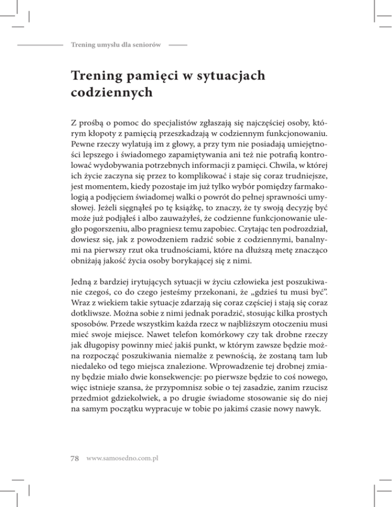 Trening umysłu dla seniorów Trening pamięci w sytuacjach codziennych Z prośbą o pomoc do specjalistów zgłaszają się najczęściej osoby, którym kłopoty z pamięcią przeszkadzają w codziennym funkcjonowaniu. Pewne rzeczy wylatują im z głowy, a przy tym nie posiadają umiejętności lepszego i świadomego zapamiętywania ani też nie potrafią kontrolować wydobywania potrzebnych informacji z pamięci. Chwila, w której ich życie zaczyna się przez to komplikować i staje się coraz trudniejsze, jest momentem, kiedy pozostaje im już tylko wybór pomiędzy farmakologią a podjęciem świadomej walki o powrót do pełnej sprawności umysłowej. Jeżeli sięgnąłeś po tę książkę, to znaczy, że ty swoją decyzję być może już podjąłeś i albo zauważyłeś, że codzienne funkcjonowanie uległo pogorszeniu, albo pragniesz temu zapobiec. Czytając ten podrozdział, dowiesz się, jak z powodzeniem radzić sobie z codziennymi, banalnymi na pierwszy rzut oka trudnościami, które na dłuższą metę znacząco obniżają jakość życia osoby borykającej się z nimi. Jedną z bardziej irytujących sytuacji w życiu człowieka jest poszukiwanie czegoś, co do czego jesteśmy przekonani, że „gdzieś tu musi być”. Wraz z wiekiem takie sytuacje zdarzają się coraz częściej i stają się coraz dotkliwsze. Można sobie z nimi jednak poradzić, stosując kilka prostych sposobów. Przede wszystkim każda rzecz w najbliższym otoczeniu musi mieć swoje miejsce. Nawet telefon komórkowy czy tak drobne rzeczy jak długopisy powinny mieć jakiś punkt, w którym zawsze będzie można rozpocząć poszukiwania niemalże z pewnością, że zostaną tam lub niedaleko od tego miejsca znalezione. Wprowadzenie tej drobnej zmiany będzie miało dwie konsekwencje: po pierwsze będzie to coś nowego, więc istnieje szansa, że przypomnisz sobie o tej zasadzie, zanim rzucisz przedmiot gdziekolwiek, a po drugie świadome stosowanie się do niej na samym początku wypracuje w tobie po jakimś czasie nowy nawyk. 78 www.samosedno.com.pl Rozdział 3. Nadal możesz pamiętać wszystko – zestawy ćwiczeń Zapamiętaj Wszystko powinno mieć swoje miejsce. Stwórz miejsce, w którym będziesz kłaść rzeczy „na potem”. Bądź uważny. To, że każda rzecz będzie miała przyporządkowane stałe miejsce, nie oznacza, że skazujesz się na bieganie po domu z każdym drobiazgiem i nerwowe odkładanie go na właściwą półeczkę. Można tego uniknąć choćby poprzez wyznaczenie sobie miejsca – półki lub pojemnika – do którego będziesz mógł wrzucić to, czego w danym momencie nie chce ci się lub nie jesteś w stanie odnieść. Wchodząc do domu, możesz umieścić tam klucze, telefon komórkowy, pomadkę i inne drobiazgi, których nie chcesz zostawić w kieszeni płaszcza. Możesz włożyć tam też długopis, którym musiałeś szybko coś zanotować podczas rozmowy telefonicznej, czy taśmę klejącą, którą przyniosłeś z drugiego pokoju. Dzięki temu przedmioty nie będą leżeć „gdziekolwiek”, a porządek w nich będziesz mógł zrobić wtedy, gdy znajdziesz na to chwilę czasu, który zdołasz z pewnością zaoszczędzić dzięki wyeliminowaniu notorycznych poszukiwań zawieruszonych przedmiotów. Ciekawostka Jeżeli nie wiesz, gdzie coś położyłeś, prawdopodobnie wcale o tym nie zapomniałeś. Po prostu nie zwróciłeś na to wystarczająco dużo uwagi, by móc to zapamiętać. Istnieje jeszcze jeden, o wiele trudniejszy do pozbycia się nawyk, który może sprawić, że znacznie częściej nie będziesz wiedzieć, w którym miejscu czegoś szukać. Niepamiętanie, gdzie się coś położyło, rzadko wiąże się z zaburzeniami pamięci – jest to raczej kwestia nieprzywiązywania wagi do tego, co się w danym momencie robi. Tak naprawdę nie 79 Trening umysłu dla seniorów możesz zapomnieć, gdzie coś położyłeś, jeżeli nigdy tego nie zapamiętałeś. Źródłem tych kłopotów są raczej problemy z koncentracją. Aby je rozwiązać, po pierwsze, odkładając coś w nietypowe miejsce, spróbuj poświęcić choćby sekundę na ogarnięcie uważnym spojrzeniem przedmiotu i jego otoczenia, po drugie powiedz sobie samemu w myślach o tym, co właśnie zrobiłeś. W celu poprawy koncentracji koniecznie wykonaj ćwiczenia z rozdziału 4. Kolejną bolączką, która dotyka ogromne rzesze ludzi – i to nie tylko tych, którzy przekroczyli 50. rok życia – jest zapominanie o tym, co mieliśmy zrobić. Zorientowanie się, że coś miało być zrobione kilka godzin temu, jest równie frustrujące jak dręczące poczucie, że coś mieliśmy robić, ale zupełnie nie wiemy co. Na szczęście istnieją proste środki zaradcze, które pomogą ci się wyzwolić z tej matni irytacji, jeżeli problem ten dotyczy również ciebie. Po pierwsze konieczne jest przygotowanie notesu lub kalendarza. Nawet jeżeli całe życie radziłeś sobie bez niego i wolałbyś, aby tak pozostało, warto się przełamać i zacząć notować. Dzisiejsze czasy nie sprzyjają spokojnemu bytowaniu i wymagają żwawszego kroczenia przez życie, a często także robienia wielu rzeczy jedna po drugiej lub nawet równocześnie. Konieczność planowania nie ogranicza się zatem wyłącznie do osób po pięćdziesiątce. Aby ogarnąć ogół zajęć, notować muszą wszyscy – uczniowie, studenci, osoby pracujące, nawet emeryci. Prowadzenie zapisków nie jest żadną ujmą – coraz więcej osób dostrzega, że stało się wręcz koniecznością. Zapamiętaj Wybierz odpowiedni dla siebie sposób planowania. Możesz wykorzystać papierowy kalendarz, telefon, komputer czy też inne urządzenie, do korzystania z którego jesteś przyzwyczajony. Każdy ze sposobów notowania ma swoje wady i zalety. Papierowy kalendarz może być mało poręczny, jednak nie jest wrażliwy na uszkodzenia i nie potrzebuje zasilania. Telefon komórkowy może 80 www.samosedno.com.pl Rozdział 3. Nadal możesz pamięt