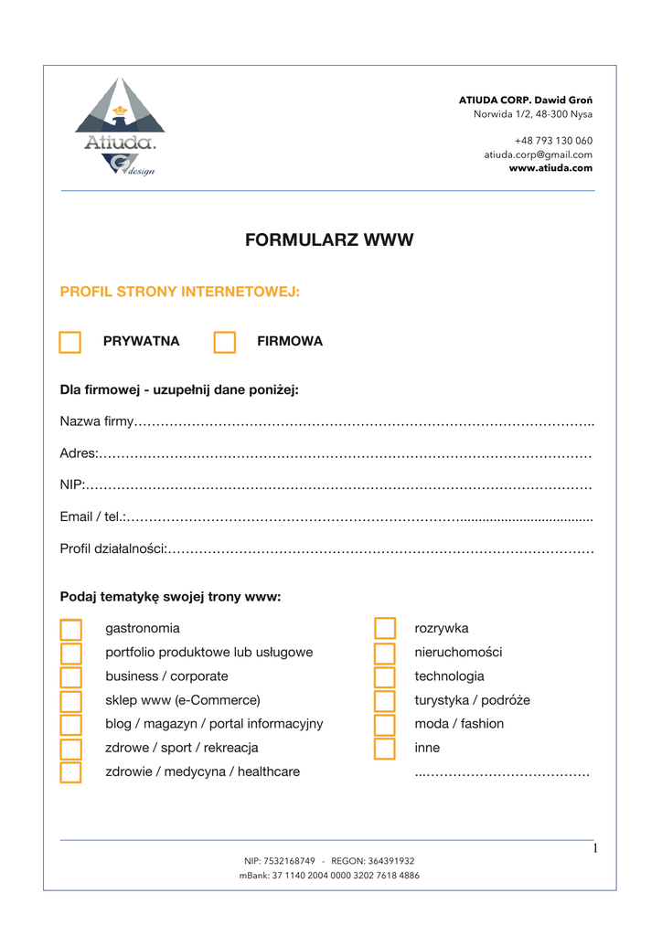 ATIUDA CORP. Dawid Groń Norwida 1/2, 48-300 Nysa +48 793 130 060 [email protected] www.atiuda.com FORMULARZ WWW PROFIL STRONY INTERNETOWEJ: PRYWATNA FIRMOWA Dla firmowej - uzupełnij dane poniżej: Nazwa firmy………………………………………………………………………………………….. Adres:………………………………………………………………………………………………… NIP:…………………………………………………………………………………………………… Email / tel.:………………………………………………………………….................................... Profil działalności:…………………………………………………………………………………… Podaj tematykę swojej trony www: gastronomia rozrywka portfolio produktowe lub usługowe nieruchomości business / corporate technologia sklep www (e-Commerce) turystyka / podróże blog / magazyn / portal informacyjny moda / fashion zdrowe / sport / rekreacja inne zdrowie / medycyna / healthcare ...………………………………. 1 NIP: 7532168749 - REGON: 364391932 mBank: 37 1140 2004 0000 3202 7618 4886 ATIUDA CORP. Dawid Groń Norwida 1/2, 48-300 Nysa +48 793 130 060 [email protected] www.atiuda.com DOMENA: Czy masz wykupioną i zarejestrowaną domenę TAK NIE nazwa domeny:……………………………………………………………………………………… operator domeny (np. nazwa.pl):…………………………………………………………….......... Jeśli nie posiadasz domeny, czy myślałeś już nad jej nazwą? ………………………………………………………………………………………………………… (musimy sprawdzić czy preferowana przez Ciebie domena jest dostępna) Jakie rozszerzenia preferujesz dla swojej domeny: pl com com.pl org eu inf inne……………………….. HOSTING: Czy posiadasz swój hosting (wirtualny serwer)? TAK NIE nazwa hostingu:……………………………………………………………………………………… operator hostingu (np. biznes-host.pl):…………………………………………………………… 2 NIP: 7532168749 - REGON: 364391932 mBank: 37 1140 2004 0000 3202 7618 4886 ATIUDA CORP. Dawid Groń Norwida 1/2, 48-300 Nysa +48 793 130 060 [email protected] www.atiuda.com BRANDING: Czy posiadasz swoją identyfikację wizualną (ID)? Logotyp, kolorystka, czcionki itd. TAK NIE Czy mamy dla Ciebie zrobić identyfikację wizualną (ID)? TAK NIE ZAKRES: logotyp wizytówki kolorystyka papier firmowy firmowe czcionki inne …………………………………………………. MATERIAŁY NA STRONĘ www: Czy posiadasz już jakiekolwiek materiały na swoją stronę www? TAK NIE ZAKRES: teksty / treść / opisy zdjęcia / obrazki / tła / ikony szablon / Layout strony www (projekt graficzny) / projekt inne……………………………………………………………………………………………... 3 NIP: 7532168749 - REGON: 364391932 mBank: 37 1140 2004 0000 3202 7618 4886 ATIUDA CORP. Dawid Groń Norwida 1/2, 48-300 Nysa +48 793 130 060 [email protected] www.atiuda.com E-MAILS INFORMACJA: Indywidualne, firmowe konta e-mail z rozszerzeniem będącym nazwą domeny. PRZYKŁAD: Posiadasz stronę www.przykladowa.pl, wówczas twoje adresy e-mail mogą wyglądać następująco: • • • • • [email protected] [email protected] [email protected] [email protected] itp. Czy chcesz firmowe konta e-mail? TAK NIE Jakie? Proszę o podanie nazw identyfikatorów użytkownika (np. biuro, kontakt) …………………………………………………. …………………………………………………. …………………………………………………. …………………………………………………. …………………………………………………. 4 NIP: 7532168749 - REGON: 364391932 mBank: 37 1140 2004 0000 3202 7618 4886 ATIUDA CORP. Dawid Groń Norwida 1/2, 48-300 Nysa +48 793 130 060 [email protected] www.atiuda.com PASEK MENU – ZAKŁADKI INFORMACJA: Pasek menu to interaktywny banner znajdujący się zazwyczaj na samej górze strony z listą zakładek. Jest elementem występującym praktycznie na każdej stronie internetowej. Umożliwia łatwiejszą nawigację. Kliknięcie na którąkolwiek z zakładek przenosi do poszczególnej strony. Jakie zakładki chciałbyś posiadać w swoim pasku menu? O NAS OFERTA PORTFOLIO GALERIA BLOG KONTAKT inne……………………………………………………………………………………………… PASEK MENU – POD ZAKŁADKI INFORMACJA: Pasek menu może być tak skonstruowany, że wszystkie bądź niektóre zakładki mogą być rozwijalne, tworzyć listę pod zakładek. 5 NIP: 7532168749 - REGON: 364391932 mBank: 37 1140 2004 0000 3202 7618 4886 ATIUDA CORP. Dawid Groń Norwida 1/2, 48-300 Nysa +48 793 130 060 [email protected] www.atiuda.com Czy chciałbyś rozwijalną listę pod zakładek? TAK NIE Jeśli tak, do jakich zakładek chciałbyś utworzyć pod zakładki? ZAKŁADKI POD ZAKŁADKI Przykład: O NAS AKTUALNOŚCI KIM JESTEŚMY NASZ MISJA ……………………………………… ……………………………………… ……………………………………… ……………………………………… ……………………………………… ……………………………………… ……………………………………… ……………………………………… ……………………………………… ……………………………………… ……………………………………… ……………………………………… ……………………………………… ……………………………………… ……………………………………… ……………………………………… 6 NIP: 753216