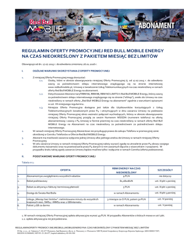 REGULAMIN OFERTY PROMOCYJNEJ RED BULL MOBILE ENERGY NA CZAS NIEOKREŚLONY Z PAKIETEM MIESIĄC BEZ LIMITÓW Obowiązuje od dn. 17.07.2015 r. do odwołania zmieniony 26.01.2016 r. I. OGÓLNE WARUNKI SKORZYSTANIA Z OFERTY PROMOCYJNEJ 1. Z niniejszej Oferty Promocyjnej mogą skorzystać: 1.1. Osoby, które w okresie obowiązywania niniejszej Oferty Promocyjnej tj. od 17.07.2015 r. do odwołania zawrą za pośrednictwem sklepu internetowego znajdującego się na stronie internetowej www.redbullmobile.pl, Umowę o świadczenie Usług Telekomunikacyjnych na czas nieokreślony w ramach oferty Red Bull MOBILE Energy na abonament. 1.2. Dotychczasowi Abonenci taryf RBM 66, RBM 88, RBM NO LIMITS II i Red Bull MOBILE Energy, którzy zawrą za pośrednictwem sklepu internetowego znajdującego się na stronie (“eShop”), aneks do Umowy na czas nieokreślony w ramach oferty „Red Bull MOBILE Energy na abonament” zgodnie z warunkami opisanymi w ust. VII niniejszego regulaminu. 1.3. Niniejsza Oferta Promocyjna dostępna jest także dla Użytkowników korzystających z Usług Telekomunikacyjnych świadczonych przez P4 i utrzymujących w dniu zawarcia Umowy na podstawie niniejszej Oferty Promocyjnej okres ważności połączeń wychodzących, którzy w okresie obowiązywania niniejszej Oferty Promocyjnej przejdą ze swoim Numerem MSISDN (numerem telefonu) na ofertę abonamentową i zawrą z P4 Umowę w formie pisemnej na czas nieokreślony w ramach oferty Red Bull MOBILE Energy na Abonament na czas nieokreślony za pośrednictwem za pośrednictwem sklepu internetowego. W ramach niniejszej Oferty Promocyjnej Abonentowi nie przysługuje prawo do zakupu Telefonu w promocyjnej cenie określonej w Cenniku Telefonów w Ofercie Red Bull MOBILE Energy. Abonent ma możliwość zawarcia wyłącznie jednej Umowy albo jednego aneksu do Umowy w ramach niniejszej Oferty Promocyjnej. W celu zawarcia Umowy w ramach niniejszej Oferty Promocyjnej należy wyrazić zgodę na utrwalenie przez P4 obrazu swojego dokumentu tożsamości oraz na przetwarzanie przez P4 danych w nim zawartych (łącznie z wizerunkiem i rysopisem). W przypadku braku takiej zgody zawarcie Umowy będzie możliwe tylko i wyłącznie w ramach Cennika (oferta podstawowa). 2. 3. 4. II. PODSTAWOWE WARUNKI OFERTY PROMOCYJNEJ Tabela nr 1: OFERTA 1. Abonament po uwzględnieniu wszystkich rabatów 2. Rabat podstawowy 3. Rabat za aktywną e-fakturę i terminową płatność 4. Dostęp do Świata Red Bulla 5. Usługa „Miesiąc bez limitów”: nielimitowane minuty do wszystkich krajowych sieci, SMSy, i MMSy oraz 2 GB Internetu. Pakiet 3 GB za darmo 6. RBM ENERGY NA CZAS NIEOKREŚLONY SZCZEGÓŁY 9 PLN nie dotyczy 81,081081% ust. III pkt 1 poniżej 5 PLN ust. III pkt 2 poniżej w ramach Abonamentu ust. III pkt 3 poniżej 3 miesiące za O PLN, potem 30 PLN ust. IV poniżej w ramach Abonamentu ust. V poniżej 1. W ramach niniejszej Oferty Promocyjnej opłata aktywacyjna wynosi 49 PLN. W przypadku Abonentów o których mowa w ust I pkt. 1.2. opłata aktywacyjna nie jest pobierana. REGULAMINOFERTY PROMOCYJNEJREDBULLMOBILEENERGYNA CZAS NIEOKREŚLONY Z PAKIETEM MIESIĄC BEZ LIMITÓW P4 Sp. z o.o., ul. Taśmowa 7, 02-677 Warszawa, Sąd Rejonowy dla m. st. Warszawy w Warszawie XIII Wydział Gospodarczy Krajowego Rejestru Sądowego, KRS 0000217207, REGON 015808609, NIP 951-21-20-077, kapitał zakładowy 48 456 500 III. SZCZEGÓŁY OFERTY PROMOCYJNEJ 1. Szczegóły dotyczące rabatu na Abonament (Tabela nr 1, pkt 2): 1.1. Rabat na Abonament w wysokości 81,081081% naliczany jest od kwoty Abonamentu (74 PLN zgodnie z Cennikiem Oferty Red Bull MOBILE Energy) przez cały okres obowiązywania Umowy. 1.2. W pierwszym, niepełnym Okresie Rozliczeniowym, w którym nastąpiła aktywacja Numeru MSISDN (numeru telefonu) lub nastąpiło rozpoczęcie świadczenia Usług Telekomunikacyjnych na zmienionych warunkach Umowy, kwota Abonamentu naliczana jest proporcjonalnie do liczby dni pozostałych do końca tego Okresu Rozliczeniowego i pomniejszona o rabat w wysokości 81,081081% 1.3. Przyznawany rabat dotyczy tylko opłaty za Abonament. Wszystkie opłaty poza Abonamentem będą naliczane zgodnie z Cennikiem Oferty Red Bull MOBILE Energy. Szczegóły dotyczące rabatu za aktywną e-fakturę i terminową płatność (Tabela nr 1, pkt 3): 2.1. Z zastrzeżeniem pkt 2.2 poniżej, dodatkowy rabat na Abonament jest przyznawany w odniesieniu do każdego następnego Okresu Rozliczeniowego przez cały Okres Umowy zawartej na czas nieokreślony. Dla naliczenia rabatu konieczne jest łączne spełnienie następujących warunków: 2. a. b. posiadanie aktywnej e-faktury dokonanie terminowej płatności należności wynikających z Rachunku Telekomunikacyjnego za poprzedni Okres Rozliczeniowy. Przez terminowa płatność należy rozumieć uznanie rachunku bankowego Operatora kwotą należności najpóźniej w ostatnim dniu płatności określonym w Rachunku Telekomunikacyjnym. 2.2. Pierwszy dodatkowy rabat w wysokości 5 PLN przyznawany jest w odniesieniu do sumy kwot Abonamentów za dwa pierwsze Okresy Rozliczeniowe, uwidocznionej na pierwszym Rachunku Telekomunikacyjnym. Przyznanie rabatu za ten okres nie jest uzależnione od spełnienia warunku polegającego na terminowej płatności. 2.3. Dodatkowy rabat dotyczy tylko opłaty za Abonament. Wszystkie opłaty poza Abonamentem będą naliczane zgodnie z Cennikiem Oferty Red Bull MOBILE Energy. 2.4. Dodatkowy rabat z tytułu wyboru e-faktury jest zawsze naliczany po rabacie na Abonament opisanym w ust. III pkt 2 niniejszej Oferty Promocyjnej. 2.5. W przypadku aktywacji elektronicznej faktury (e-faktura) podczas trwania Umowy dodatkowy rabat nie zostanie naliczony przy kolejnym Okresie Rozliczeniowym, jeżeli Abonent nie dokona aktywacji e-faktury maksimum pięć dni przed końcem Okresu Rozliczeniowego. 2.6. Jeżeli aktywacja elektronicznej faktury nastąpi później niż piątego dnia przed końcem Okresu Rozliczeniowego, usługa efaktura zosta