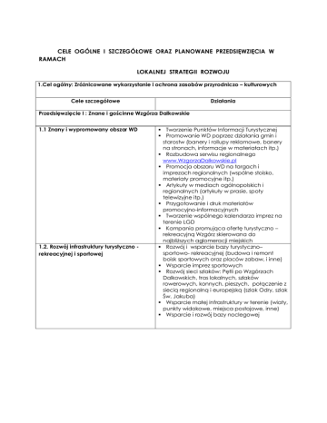 CELE OGÓLNE I SZCZEGÓŁOWE ORAZ PLANOWANE PRZEDSIĘWZIĘCIA W RAMACH LOKALNEJ STRATEGII ROZWOJU 1.Cel ogólny: Zróżnicowane wykorzystanie i ochrona zasobów przyrodniczo – kulturowych Cele szczegółowe Działania Przedsięwzięcie I : Znane i gościnne Wzgórza Dalkowskie 1.1 Znany i wypromowany obszar WD 1.2. Rozwój infrastruktury turystyczno rekreacyjnej i sportowej § Tworzenie Punktów Informacji Turystycznej § Promowanie WD poprzez działania gmin i starostw (banery i rollupy reklamowe, banery na stronach, informacje w materiałach itp.) § Rozbudowa serwisu regionalnego www.WzgorzaDalkowskie.pl § Promocja obszaru WD na targach i imprezach regionalnych (wspólne stoisko, materiały promocyjne itp.) § Artykuły w mediach ogólnopolskich i regionalnych (artykuły w prasie, spoty telewizyjne itp.) § Przygotowanie i druk materiałów promocyjno-informacyjnych § Tworzenie wspólnego kalendarza imprez na terenie LGD § Kampania promująca ofertę turystyczno – rekreacyjną Wzgórz skierowana do najbliższych aglomeracji miejskich § Rozwój i wsparcie bazy turystyczno– sportowo- rekreacyjnej (budowa i remont boisk sportowych oraz placów zabaw, i inne) § Wsparcie imprez sportowych § Rozwój sieci szlaków: Pętli po Wzgórzach Dalkowskich, tras lokalnych, szlaków rowerowych, konnych, pieszych, połączenie z siecią regionalną i europejską (szlak Odry, szlak Św. Jakuba) § Wsparcie małej infrastruktury w terenie (wiaty, punkty widokowe, miejsca postojowe, inne) § Wsparcie i rozwój bazy noclegowej Opis przedsięwzięć Przedsięwzięcie I – „Znane i gościnne Wzgórza Dalkowskie” Przedsięwzięcia przyczynią się do realizacji: · · · celu ogólnego 1. „Zróżnicowane wykorzystanie i ochrona zasobów przyrodniczokulturowych” celu szczegółowego 1.1. „Znany i wypromowany obszar Wzgórz Dalkowskich” celu szczegółowego 1.2. „Rozwój infrastruktury turystyczno-rekreacyjnej i sportowej” Uzasadnienie przedsięwzięcia i celu ogólnego (okres realizacji 2009-2014) Obszar Wzgórz Dalkowskich położony jest pomiędzy Doliną Odry a Borami Dolnośląskimi na terenie dwóch województw: dolnośląskiego i lubuskiego. Charakteryzuje się pagórkowatym terenem. Charakter wypiętrzeń ukształtował ciekawe i niepowtarzalne środowisko przyrodniczo-krajobrazowe. Środowisko kulturowe tego obszaru jest równie ciekawe. Wyróżnić można zabytki kultury sakralnej, dworskiej, średniowieczne układy miasteczek. Zarówno walory przyrodnicze jak i kulturowe z roku na rok coraz bardziej są eksponowane w ramach działań podejmowanych przez Fundację „Porozumienie Wzgórz Dalkowskich”, samorządy oraz partnerów działających na tym terenie. Została wyznakowany rowerowy szlak regionalny „Szlak Dziadoszan”, który ma być osią do tworzonych działań turystycznych. W części dolnośląskiej jest bardzo dobrze wyznakowana sieć szlaków rowerowych dzięki aktywności Związku Gmin Zagłębia Miedziowego i lokalnych samorządów. Natomiast w części lubuskiej został wyznaczony rowerowy szlak „Czarciego Kamienia” przebiegający po gminach z powiatu nowosolskiego. Bardzo aktywnie na terenie Wzgórz zaczęło rozwijać się wiele usług i ofert turystycznych, min. Lekcje w przyrodzie na Wzgórzach Dalkowskich, Stowarzyszenie Hodowców i Miłośników Koni „Koń i Człowiek” i wiele innych. Wszystkie te działania zaczęły pokazywać region Wzgórz, wykorzystując zasoby i walory które posiada, jako teren atrakcyjny dla spędzania wypoczynku sobotnio-niedzielnego dla mieszkańców terenu LGD oraz sąsiadujących aglomeracji miejskich. Zaplanowane działania w ramach LSR pomogą wykreować obszar Wzgórz Dalkowskich jako obszar atrakcyjny turystycznie. Cel szczegółowy 1.1. „Znany i wypromowany obszar Wzgórz Dalkowskich” Pomimo wielu atrakcji przyrodniczo-kulturowych, które posiadają Wzgórza Dalkowskie, w dalszym ciągu brak jest wspólnej oferty pokazującej region z wszystkimi jego atrakcjami. Ponad 200 tysięczna rzesza potencjalnych turystów, mieszkających w pobliżu Wzgórz Dalkowskich, posiada znikomą wiedzę o walorach tego terenu. W ramach Strategii zaplanowano szereg działań, które mają przyczynić się do zmiany tego wizerunku. Przewidziano aktualizację i dobre przygotowanie serwisu www.WzgorzaDalkowskie.pl, który jako najtańsza forma promocji, zawierać będzie w swoich zasobach aktualne i wyczerpujące informacje nt. walorów tego terenu oraz wszystkich ofert turystycznych. Przygotowany zostanie wspólny kalendarz imprez, który będzie promowany wśród mieszkańców regionu. Połączenie już organizowanych imprez w jeden pakiet, pokaże w prosty sposób bogactwo i aktywność instytucji i podmiotów z tego terenu. Opracowane i wydane materiały promocyjno-informacyjne, skierowane do różnego typu odbiorców, będą wsparciem dla zaplanowanej kampanii promującej ofertę turystyczno-rekreacyjną Wzgórz Dalkowskich, skierowaną do najbliższych aglomeracji miejskich. Artykuły w mediach lokalnych i krajowych oraz udział w targach turystycznych przyczyni się do umocnienia wizerunku Wzgórz Dalkowskich jako terenu, gdzie warto przyjechać. Cel szczegółowy 1.2. „Rozwój infrastruktury turystyczno-rekreacyjnej i sportowej” Na terenie LGD został zaprojektowany i wyznaczony w terenie regionalny szlak rowerowy „Szlak Dziadoszan”, który ma pełnić funkcję spoiwa łączącego gminy LGD. W części północnej przebiega też międzynarodowy Szlak Odry a także na terenie LGD ma swój początek szlak pątniczy „ Szlak Św. Jakuba”. Pomimo rozbudowanej sieci szlaków rowerowych i ścieżek edukacyjnych wymagają one doposażenia w małą infrastrukturę turystyczna np. wiaty, tablice informacyjne, tabliczki kierunkowe, miejsca postojowe itp. Szlaki turystyczne wymagają na bieżąco odnawiania aby były widoczne dla użytkujących je turystów. W Strategii nie zapomniano o boiskach sportowych i bazie 