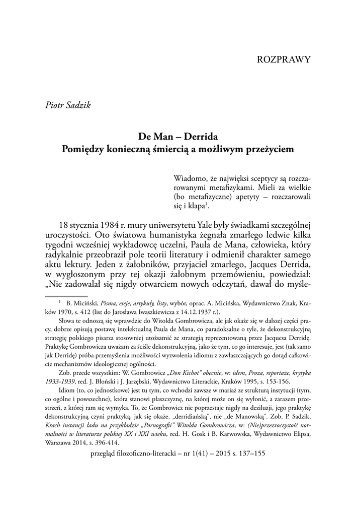 ROZPRAWY Piotr Sadzik De Man – Derrida Pomiędzy konieczną śmiercią a możliwym przeżyciem Wiadomo, że najwięksi sceptycy są rozczarowanymi metafizykami. Mieli za wielkie (bo metafizyczne) apetyty – rozczarowali się i klapa1. 18 stycznia 1984 r. mury uniwersytetu Yale były świadkami szczególnej uroczystości. Oto światowa humanistyka żegnała zmarłego ledwie kilka tygodni wcześniej wykładowcę uczelni, Paula de Mana, człowieka, który radykalnie przeobraził pole teorii literatury i odmienił charakter samego aktu lektury. Jeden z żałobników, przyjaciel zmarłego, Jacques Derrida, w wygłoszonym przy tej okazji żałobnym przemówieniu, powiedział: „Nie zadowalał się nigdy otwarciem nowych odczytań, dawał do myśle1 B. Miciński, Pisma, eseje, artykuły, listy, wybór, oprac. A. Micińska, Wydawnictwo Znak, Kraków 1970, s. 412 (list do Jarosława Iwaszkiewicza z 14.12.1937 r.). Słowa te odnoszą się wprawdzie do Witolda Gombrowicza, ale jak okaże się w dalszej części pracy, dobrze opisują postawę intelektualną Paula de Mana, co paradoksalne o tyle, że dekonstrukcyjną strategię polskiego pisarza stosowniej utożsamić ze strategią reprezentowaną przez Jacquesa Derridę. Praktykę Gombrowicza uważam za ściśle dekonstrukcyjną, jako że tym, co go interesuje, jest (tak samo jak Derridę) próba przemyślenia możliwości wyzwolenia idiomu z zawłaszczających go dotąd całkowicie mechanizmów ideologicznej ogólności. Zob. przede wszystkim: W. Gombrowicz „Don Kichot” obecnie, w: idem, Proza, reportaże, krytyka 1933-1939, red. J. Błoński i J. Jarzębski, Wydawnictwo Literackie, Kraków 1995, s. 153-156. Idiom (to, co jednostkowe) jest tu tym, co wchodzi zawsze w mariaż ze strukturą instytucji (tym, co ogólne i powszechne), która stanowi płaszczyznę, na której może on się wyłonić, a zarazem przestrzeń, z której ram się wymyka. To, że Gombrowicz nie poprzestaje nigdy na deziluzji, jego praktykę dekonstrukcyjną czyni praktyką, jak się okaże, „derridiańską”, nie „de Manowską”. Zob. P. Sadzik, Krach instancji ładu na przykładzie „Pornografii” Witolda Gombrowicza, w: (Nie)przezroczystość normalności w literaturze polskiej XX i XXI wieku, red. H. Gosk i B. Karwowska, Wydawnictwo Elipsa, Warszawa 2014, s. 396-414. przegląd filozoficzno-literacki – nr 1(41) – 2015 s. 137–155 Piotr Sadzik nia samą możliwość czytania, a czasem jego paradoksalną niemożliwość”2. Do pierwszego spotkania de Mana i Derridy doszło dwie dekady wcześniej, podczas sławetnej konferencji w Baltimore, w 1966 r., kiedy to pierwszy był świadkiem tego, jak błyskotliwy referat drugiego dystansuje strukturalizm, poddając wszelką strukturę anarchicznej próbie pisma. Od tamtego momentu nazwiska te splotły się ze sobą tak mocno, że umieszcza się je zazwyczaj w relacji ciągłości, podobieństwa i zależności. Nie sposób mówić o de Manie bez odniesienia do pism jego francuskiego przyjaciela, trudno zrozumieć swoistość myślenia Derridy bez skonfrontowania go z dorobkiem autora Ideologii estetycznej. W tradycyjnie przyjętym modelu de Man miałby być bezpośrednim spadkobiercą i kontynuatorem myśli Derridy na gruncie teorii literatury, a wyraźna odmienność dekonstrukcjonizmu (pod który podwaliny kładzie pierwszy) od dekonstrukcji (którą funduje drugi) nie zacierałaby równie wyraźnych rysów pokrewieństwa. Istnieje jedno miejsce, w którym obydwie te drogi rozchodzą się jednak bezpowrotnie w przeciwległe kierunki: tekst Waltera Benjamina, poświęcony „zadaniu tłumacza”. Oto loci communes, które stanowi punkt wyjścia dla całkowicie odrębnych i nieprzystawalnych dróg, w tym dróg tak zbliżonych i tak odległych, jak ta obrana przez de Mana i Derridę. Wciąż nie dość bowiem powtarzania, że obydwie te strategie, przy całym zasobie powinowactw, wykazują również nieprzekraczalne rozbieżności, stanowiąc „dwie formy dekonstrukcji”3. Rozbieżności te wyrażają się wprawdzie w akcentach raczej niż w fundamentalnych i bezpośrednich poróżnieniach, lecz jako takie radykalnie odmienne „bliskości” pozostają czymś tym bardziej intrygującym. Tym, co jednak w istocie problematyzuje tekst Benjamina, są specyficznie przez niego definiowane kategorie „życia” i „śmierci” i to relacja wobec nich, jak i sposób ich potraktowania, przesądza, jak się wydaje, o odmienności perspektyw: Derridiańskiej i de Manowskiej. W ostatnim wywiadzie, udzielonym przez Derridę już w obliczu diagnozy o raku trzustki, filozof mówił: 2 J. Derrida, In memoriam, „Yale French Studies” 1985, nr 69. Przedrukowany następnie w: idem, In memoriam: de l’âme, w: idem, Mémoires pour Paul de Man, Galilée, Paris 1988, s. 13-19 oraz idem, Chaque fois unique, la fin du monde, Galilée, Paris 2003. 3 Zob. O. Pasanen, Gasché on de Man and Derrida. Forgetting the moment of crisis, w: Deconstruction. Critical concepts in literary and cultural studies, red. J. Culler, Routledge, London-New York 2003, s. 349. Bodaj jako pierwszy za tym wyraźnym oddzieleniem strategii Derridy od namysłu de Mana optował Rodolphe Gasché. Zob. R. Gasché, „Setzung” and „Übersetzung”. Notes on Paul de Man, „Diacritics” 1981, nr 11, s. 36-57; R. Gasché, The Tain of the mirror. Derrida and the Philosophy of Reflection, Harvard University Press, Cambridge, Massachusetts and London 1997. 138 De Man – Derrida Zawsze interesowałem się ową tematyką przeżycia [la survie], którego sens nie łączy się ani z życiem, ani ze śmiercią. Jest ono prymarne: życie jest przeżyciem. Przeżyć [survivre], w obiegowym znaczeniu tego słowa, oznacza «kontynuować życie», jak i «żyć po śmierci». Przy okazji tłumaczenia, Walter Benjamin podkreśla różnicę między überleben z jednej strony, przeżyciem śmierci, tak jak książka może przeżyć śmierć autora lub dziecko śmierć ro