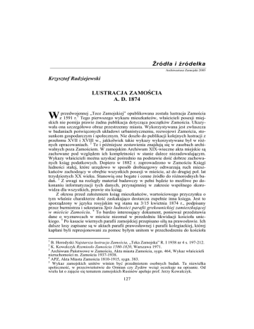 Źródła i źródełka Archiwariusz Zamojski 2005 Krzysztof Radziejewski LUSTRACJA ZAMOŚCIA A. D. 1874 przedwojennej „Tece Zamojskiej” opublikowana została lustracja Zamościa W z 1591 r. Tego pierwszego wykazu mieszkańców, właścicieli posesji miejskich nie pomija prawie żadna publikacja dotycząca początków Zamościa. Ukazy1 wała ona szczegółowo obraz przestrzenny miasta. Wykorzystywana jest zwłaszcza w badaniach poświęconych układowi urbanistycznemu, rozwojowi Zamościa, stosunkom gospodarczym i społecznym. Nie doszło do publikacji kolejnych lustracji z przełomu XVII i XVIII w., jakkolwiek takie wykazy wykorzystywane był w różnych opracowaniach. 2 Te i późniejsze zestawienia znajdują się w zasobach archiwalnych poza Zamościem. W zamojskim Archiwum XIX-wieczne akta miejskie są zachowane pod względem ich kompletności w stanie dalece niezadowalającym. Wykazy właścicieli można uzyskać pośrednio na podstawie dość dobrze zachowanych ksiąg podatkowych. Dopiero w 1882 r. zaprowadzono w Zamościu Księgi ludności stałej, które urzędowo w sposób drobiazgowy odtwarzają ruch mieszkańców zachodzący w obrębie wszystkich posesji w mieście, aż do drugiej poł. lat trzydziestych XX wieku. Stanowią one bogate i cenne źródło do różnorodnych badań. 3 Z uwagi na rozległy materiał badawczy w pełni będzie to możliwe po dokonaniu informatyzacji tych danych, przynajmniej w zakresie wspólnego skorowidza dla wszystkich, prawie stu ksiąg. Z okresu przed założeniem ksiąg mieszkańców, wartościowego przyczynku o tym właśnie charakterze dość zaskakująco dostarcza zupełnie inna księga. Jest to sporządzony w języku rosyjskim wg stanu na 3/15 kwietnia 1874 r., podpisany przez burmistrza i sekretarza Spis ludności parafii grekounickiej zamieszkującej w mieście Zamościu. 4 To bardzo interesujący dokument, ponieważ przedstawia dane o wyznawcach w mieście nieomal w przededniu likwidacji kościoła unickiego. 5 Po kasacie wiernych parafii zamojskiej przepisano siłą na prawosławie. Ich dalsze losy zapisane są w aktach parafii prawosławnej i parafii kolegiackiej, której kapłani byli represjonowani za pomoc byłym unitom w przechodzeniu do kościoła 1 B. Horodyski Najstarsza lustracja Zamościa, „Teka Zamojska” R. I 1938 nr 4 s. 197-212. K. Kowalczyk Rzemiosło Zamościa 1580-1820, Warszawa 1971. 3 Archiwum Państwowe w Zamościu, Akta miasta Zamościa, sygn. 464, Wykaz właścicieli nieruchomości m. Zamościa 1937-1938. 4 APZ, Akta Miasta Zamościa 1810-1915, sygn. 383. 5 Wykaz zamojskich unitów winien być przedmiotem osobnych badań. Ta niewielka społeczność, w przeciwieństwie do Ormian czy Żydów wciąż oczekuje na opisanie. Od wielu lat o zajęcie się tematem zamojskich Rusinów apeluje prof. Jerzy Kowalczyk. 2 127 katolickiego 6 Nas interesuje jednak inny aspekt informacyjny tej jednostki archiwalnej. Księga przedstawia tabelarycznie, w kolejności numerów posesji nie tylko rodziny unickie. Pod numerem posesji, w której takowych nie było wpisane jest nazwisko właściciela „nieunickiego”. Można na to spojrzeć z drugiej strony. To jest po prostu wykaz właścicieli posesji, w którym dane odnośnie domów unickich rozszerzono, wyszczególniając wszystkich zamieszkałych. Ta „lustracja Zamościa a.d. 1874” to zapewne pierwsze poważniejsze zadanie spisowe władz miejskich po kasacie twierdzy w 1866 r., opuszczeniu z końcem września tego roku Nowej Osady i rozpoczęciu ponownie urzędowania w ratuszu. W opublikowanym niżej zestawieniu przytoczono wyłącznie nazwiska właścicieli domów z przydatnymi do celów genealogicznych datami ich urodzenia, wyznaniem i ewentualnie innymi dodatkowymi informacjami. Spis stanowią osobne ciągi liczbowe dla poszczególnych części miasta. Spis w części „Zamość” zawiera się między nr 2 (ratusz) i 112, jednak dla czternastu „numerów” brak zapisu, być może oznaczający brak domu o takim numerze. Jeśli pominąć także trzy domy zamieszkałe przez duchownych, to w spisie zawarto nazwiska właścicieli 92 domów. Analogicznie dane dla pozostałych części miasta z podziałem na przynależność wyznaniową przedstawia poniższa tabela. Właściciele domów Łącznie Miasto RK U P M E b.d. 92 22 - 2 58 1 9 178 76 7 - 91 - 4 Przedm. Lubelskie 64 47 15 - 2 - - Majdan 75 42 31 1 - - 1 Wólka 14 12 2 - - - - 423 199 55 3 151 1 14 Nowa Osada Razem Przedstawiony tutaj materiał „lustracyjny” może być przydatnym do badań nad Zamościem po kasacie twierdzy, np. dotyczących statusu wyznaniowego czy majątkowego jego mieszkańców. Najwięcej domów w mieście posiadała Jadwiga Czerner, wdowa po cukierniku, obywatelu Szwajcarii, która według wykazu była właścicielką aż 6 domów. Właścicielem 3 domów był Szaja Margules a dwu Karol Namysłowski, ojciec kompozytora i założyciela orkiestry Włościańskiej. Objaśnienia do „wykazu ludności”. Nazwisko właściciela poprzedza numer domu. Oryginalny spis sporządzony został zgodnie ze zwyczajem rosyjskim, tutaj zamiast „otczestwa” imię ojca podawane jest po nazwisku (syn, córka...), po przecinku zamieszczona została data urodzenia (w spisie miesiąc zapisany jest słownie), następnie wyznanie (RK – rzymskokatolickie, P – prawosławne, M – mojżeszowe, U – unickie, E – ewangelickie) a po myślniku zawód i inne dopisane w tabeli informacje (kursywa). 5 Bojownicy Kapłani za sprawę Kościoła i Ojczyzny w latach 1861-1915 opr. P. Kubicki. Cz. I. t. 2, Sandomierz 1933, s. 27, 121, 136, 177. 128 SPIS WŁAŚCICIELI DOMÓW W ZAMOŚCIU W 1874 r. Miasto 2. Ratusz Miejski 3. Antoni Rogaczewski s. Jana, 10.05. 1831; RK - mierniczy 4. Rozalia Kuźmińska c.Józefa, 07.09. 1799; RK 5. Julian Zonawend s. Franciszka, 10.02. 1806; RK 6. Wdowa Czerner, szwajcarska poddana, przebywająca na podstawie paszportu 7. Karol Namysłowski, zamieszkujący w Gminie Stary Zamość 8. Wdowa C