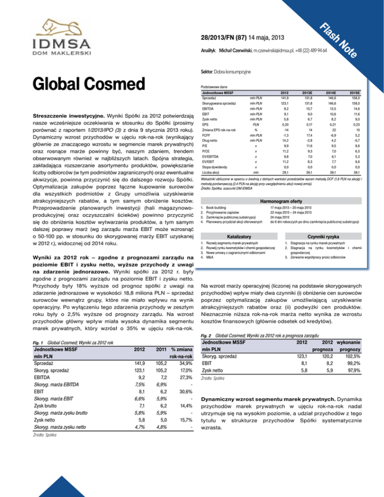 h as Fl 28/2013/FN (87) 14 maja, 2013 te No Analityk: Michał Czerwiński, [email protected], +48 (22) 489 94 64 Sektor: Dobra konsumpcyjne Global Cosmed Podstawowe dane Streszczenie inwestycyjne. Wyniki Spółki za 2012 potwierdzają nasze wcześniejsze oczekiwania w stosunku do Spółki (prosimy porównać z raportem 1/2013/IPO (3) z dnia 9 stycznia 2013 roku). Dynamiczny wzrost przychodów w ujęciu rok-na-rok (wynikający głównie ze znaczącego wzrostu w segmencie marek prywatnych) oraz rosnące marże powinny być, naszym zdaniem, trendem obserwowanym również w najbliższych latach. Spójna strategia, zakładająca rozszerzanie asortymentu produktów, powiększanie liczby odbiorców (w tym podmiotów zagranicznych) oraz ewentualne akwizycje, powinna przyczynić się do dalszego rozwoju Spółki. Optymalizacja zakupów poprzez łączne kupowanie surowców dla wszystkich podmiotów z Grupy umożliwia uzyskiwanie atrakcyjniejszych rabatów, a tym samym obniżenie kosztów. Przeprowadzenie planowanych inwestycji (hali magazynowoprodukcyjnej oraz oczyszczalni ścieków) powinno przyczynić się do obniżenia kosztów wytwarzania produktów, a tym samym dalszej poprawy marż (wg zarządu marża EBIT może wzrosnąć o 50-100 pp. w stosunku do skorygowanej marży EBIT uzyskanej w 2012 r.), widocznej od 2014 roku. Wyniki za 2012 rok – zgodne z prognozami zarządu na poziomie EBIT i zysku netto, wyższe przychody z uwagi na zdarzenie jednorazowe. Wyniki spółki za 2012 r. były zgodne z prognozami zarządu na poziomie EBIT i zysku netto. Przychody były 18% wyższe od prognoz spółki z uwagi na zdarzenie jednorazowe w wysokości 18,8 miliona PLN – sprzedaż surowców wewnątrz grupy, które nie miało wpływu na wynik operacyjny. Po wyłączeniu tego zdarzenia przychody w zeszłym roku były o 2,5% wyższe od prognozy zarządu. Na wzrost przychodów główny wpływ miała wysoka dynamika segmentu marek prywatnych, który wzrósł o 35% w ujęciu rok-na-rok. Jednostkowe MSSF Sprzedaż Skorygowana sprzedaż EBITDA EBIT Zysk netto EPS Zmiana EPS rok-na-rok FCFF Dług netto P/E P/CE EV/EBITDA EV/EBIT Stopa dywidendy Liczba akcji 2012 141,9 123,1 9,2 8,1 5,8 0,20 -14 -1,3 14,2 9,9 11,2 9,8 11,2 0,0 29,1 mln PLN mln PLN mln PLN mln PLN mln PLN PLN % mln PLN mln PLN x x x x x mln 2013E 131,8 131,8 10,7 9,0 6,7 0,17 14 17,4 -2,8 11,6 9,3 7,0 8,3 0,0 39,1 2014E 146,6 146,6 13,5 10,6 8,2 0,21 22 -6,9 4,2 9,5 7,0 6,1 7,7 0,0 39,1 2015E 158,0 158,0 14,6 11,6 9,0 0,23 10 5,2 -0,7 8,6 6,5 5,3 6,6 0,0 39,1 Wskaźniki obliczone w oparciu o średnią z dolnych wartości przedziałów wycen metodą DCF (1,6 PLN na akcję) i metodą porównawczą (2,4 PLN na akcję) przy uwzględnieniu akcji nowej emisji. Źródło: Spółka, szacunki DM IDMSA Harmonogram oferty 1. 2. 3. 4. Book building Przyjmowanie zapisów Zamknięcie publicznej subskrypcji Planowany przydział akcji oferowanych 17 maja 2013 – 20 maja 2013 22 maja 2013 – 24 maja 2013 24 maja 2013 do 6 dni roboczych po dniu zamknięcia publicznej subskrypcji Katalizatory 1. Rozwój segmentu marek prywatnych 2. Rozwój rynku kosmetyków i chemii gospodarczej 3. Nowe umowy z zagranicznymi odbiorcami 4.M&A Czynniki ryzyka 1. Stagnacja na rynku marek prywatnych 2.Stagnacja na rynku kosmetyków i chemii gospodarczej 3. Zerwanie współpracy przez odbiorców Na wzrost marży operacyjnej (liczonej na podstawie skorygowanych przychodów) wpływ miały dwa czynniki (i) obniżenie cen surowców poprzez optymalizację zakupów umożliwiającą uzyskiwanie atrakcyjniejszych rabatów oraz (ii) podwyżki cen produktów. Nieznacznie niższa rok-na-rok marża netto wynika ze wzrostu kosztów finansowych (głównie odsetek od kredytów). Fig. 2 Global Cosmed; Wyniki za 2012 rok a prognoza zarządu Fig. 1 Global Cosmed; Wyniki za 2012 rok Jednostkowe MSSF mln PLN Sprzedaż Skoryg. sprzedaż EBITDA Skoryg. marża EBITDA EBIT Skoryg. marża EBIT Zysk brutto Skoryg. marża zysku brutto Zysk netto Skoryg. marża zysku netto Źródło: Spółka 2012 141,9 123,1 9,2 7,5% 8,1 6,6% 7,1 5,8% 5,8 4,7% 2011 % zmiana rok-na-rok 105,2 34,9% 105,2 17,0% 7,2 27,3% 6,9% 6,2 30,6% 5,9% 6,2 14,4% 5,9% 5,0 15,7% 4,8% - Jednostkowe MSSF mln PLN Skoryg. sprzedaż EBIT Zysk netto 2012 2012 wykonanie prognoza prognozy 123,1 120,2 102,5% 8,1 8,2 99,2% 5,8 5,9 97,9% Źródło: Spółka Dynamiczny wzrost segmentu marek prywatnych. Dynamika przychodów marek prywatnych w ujęciu rok-na-rok nadal utrzymuje się na wysokim poziomie, a udział przychodów z tego tytułu w strukturze przychodów Spółki systematycznie wzrasta. Global Cosmed Etap II – prace ziemne i wykończeniowe – planowany koszt aa Fig. 3 Global Cosmed; Dynamika przychodów segmentu marek prywatnych i udział to 3,4 mln PLN, a termin zakończenia to II kwartał 2014 roku, w strukturze przychodów 50% 70% Udział w strukturze przychodów (lewa oś) 60% Etap III – zakup i montaż urządzeń automatycznej mieszalni aa Dynamika rok-na-rok (prawa oś) 39% 35% 50% 40% 32% 30% 40% 61% 30% 50% 53% 20% 20% 10% 10% 0% 0% 2010 2011 2012 Źródło: szacunki DM IDMSA Zmiana harmonogramu inwestycji w wyniku przesunięcia terminu IPO. W wyniku przesunięcia terminu IPO zmianie ulega harmonogram inwestycji. Spółka planuje przeznaczyć środki uzyskane z emisji akcji na budowę hali magazynowoprodukcyjnej oraz oczyszczalni ścieków. Całkowite nakłady mają wynieść 18,8 mln PLN. Aktualnie Spółka wystąpiła o pozwolenie na budowę. Szacujemy że terminy zakończenia inwestycji mogą być przesunięte o około 6 miesięcy w stosunku do wcześniejszych planów. Inwestycja dotycząca hali magazynowoprodukcyjnej składać się będzie z 3 etapów (podane terminy zakończenia danego etapu uwzględniają zakładane przez nas przesunięcia): Etap I – prace konstrukcyjne – planowany koszt to 5,5 mln PLN, aa a termin zakończenia tego etapu to I kwartał 2014 roku, wyrobów płynnych – planowany koszt to 7,5 mln PLN, a planowany