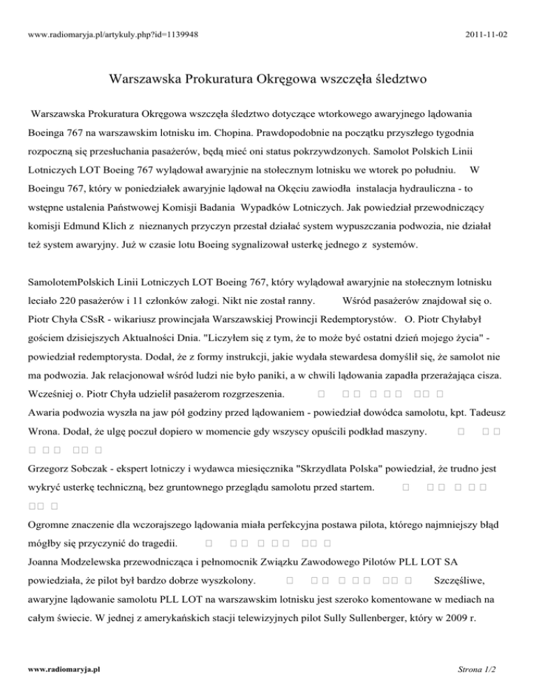 www.radiomaryja.pl/artykuly.php?id=1139948 2011-11-02 Warszawska Prokuratura Okręgowa wszczęła śledztwo Warszawska Prokuratura Okręgowa wszczęła śledztwo dotyczące wtorkowego awaryjnego lądowania Boeinga 767 na warszawskim lotnisku im. Chopina. Prawdopodobnie na początku przyszłego tygodnia rozpoczną się przesłuchania pasażerów, będą mieć oni status pokrzywdzonych. Samolot Polskich Linii Lotniczych LOT Boeing 767 wylądował awaryjnie na stołecznym lotnisku we wtorek po południu. W Boeingu 767, który w poniedziałek awaryjnie lądował na Okęciu zawiodła instalacja hydrauliczna - to wstępne ustalenia Państwowej Komisji Badania Wypadków Lotniczych. Jak powiedział przewodniczący komisji Edmund Klich z nieznanych przyczyn przestał działać system wypuszczania podwozia, nie działał też system awaryjny. Już w czasie lotu Boeing sygnalizował usterkę jednego z systemów. SamolotemPolskich Linii Lotniczych LOT Boeing 767, który wylądował awaryjnie na stołecznym lotnisku leciało 220 pasażerów i 11 członków załogi. Nikt nie został ranny. Wśród pasażerów znajdował się o. Piotr Chyła CSsR - wikariusz prowincjała Warszawskiej Prowincji Redemptorystów. O. Piotr Chyłabył gościem dzisiejszych Aktualności Dnia. "Liczyłem się z tym, że to może być ostatni dzień mojego życia" powiedział redemptorysta. Dodał, że z formy instrukcji, jakie wydała stewardesa domyślił się, że samolot nie ma podwozia. Jak relacjonował wśród ludzi nie było paniki, a w chwili lądowania zapadła przerażająca cisza. Wcześniej o. Piotr Chyła udzielił pasażerom rozgrzeszenia. Awaria podwozia wyszła na jaw pół godziny przed lądowaniem - powiedział dowódca samolotu, kpt. Tadeusz Wrona. Dodał, że ulgę poczuł dopiero w momencie gdy wszyscy opuścili podkład maszyny. Grzegorz Sobczak - ekspert lotniczy i wydawca miesięcznika "Skrzydlata Polska" powiedział, że trudno jest wykryć usterkę techniczną, bez gruntownego przeglądu samolotu przed startem. Ogromne znaczenie dla wczorajszego lądowania miała perfekcyjna postawa pilota, którego najmniejszy błąd mógłby się przyczynić do tragedii. Joanna Modzelewska przewodnicząca i pełnomocnik Związku Zawodowego Pilotów PLL LOT SA powiedziała, że pilot był bardzo dobrze wyszkolony. Szczęśliwe, awaryjne lądowanie samolotu PLL LOT na warszawskim lotnisku jest szeroko komentowane w mediach na całym świecie. W jednej z amerykańskich stacji telewizyjnych pilot Sully Sullenberger, który w 2009 r. www.radiomaryja.pl Strona 1/2 wylądował samolotem pasażerskim na rzece Hudson pogratulował polskiemu kapitanowi Tadeuszowi Wronie. Powiedział, że nie pamięta przypadku, by Boeing 767 kiedykolwiek lądował bez podwozia.Pilot Sullenberger stał się w USA bohaterem, gdy po awarii silników uratował życie 155 pasażerów Airbusa A320 lądując na rzece Hudson w Nowym Jorku. Większość amerykańskich stacji telewizyjnych pokazała nagrania awaryjnego lądowania polskiego samolotu. Złoty medal dla pilota. Bardzo ładne lądowanie - mówiła komentatorka CNN. Pochlebne dla polskiego pilota komentarze pojawiły się również w mediach niemieckich. Jak powiedział red. Waldemar Maszewski awaryjne lądowanie jest to jeden z ważniejszych tematów dnia. Po wstępnych oględzinach komisja Badania Wypadków Lotniczych postanowiła uznać wczorajsze zdarzenie za wypadek. Z zewnętrznych oględzin wynika też, że po naprawie będzie mógł być eksploatowany. Polskie Linie Lotnicze LOT odwołują loty, których start planowany był dziś do godziny 16 czasu lokalnego - łącznie odwołano około 60 rejsów. "Trwają prace służb, które mają na celu przesunięcie samolotu z pasa startowego tak, aby umożliwić korzystanie z jednej z dróg startowych lotniska" - czytamy w komunikacie. W związku z tym warszawskie lotnisko będzie zamknięte do jutra do godz. 4 rano. RIRM/PAP *** www.radiomaryja.pl Strona 2/2