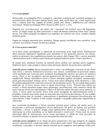 I. Co to jest plagiat? Można podać za encyklopedią PWN, że plagiat to „naruszenie osobistych praw autorskich polegające na przywłaszczeniu całości lub części cudzego utworu, pracy, nauk, dzieła artyst. itp., a także zapożyczenie treści z cudzych dzieł (bez względu na nośnik), podane jako własne i opublikowane pod własnym nazwiskiem” (Wielka Encyklopedia PWN, Warszawa 2004, tom 21, s. 124). Plagiatem jest „przywłaszczenie” tak całości, jak i znaczących lub istotnych części lub fragmentów utworu. Za plagiat uznaje się także powtórzenie w mniej lub bardziej zmienionej formie istoty cudzego utworu. Ten ostatni przypadek niewątpliwie jest trudniejszy do wykrycia oraz oceny z punktu widzenia przepisów prawa. Plagiat jest rodzajem naruszenia praw autorskich. Dlatego poniżej chcielibyśmy nieco przybliżyć istotę tych praw oraz niektóre elementy ich prawnej regulacji. II. Czym są prawa autorskie? Są to prawa autora, przysługujące w odniesieniu do stworzonego przez niego utworu. Podstawowym aktem prawnym regulującym zagadnienia praw autorskich (w tym uprawnień autorów), ich ochrony, sankcji za naruszenia i inne zagadnienia powiązane, jest ustawa z dnia 4 lutego 1994 r. o prawie autorskim i prawach pokrewnych (w dalszej części niniejszych wyjaśnień będziemy pisać o ‘Prawie autorskim’). W ramach praw autorskich wyróżnia się autorskie prawa osobiste oraz autorskie prawa majątkowe. Podział ten niesie z sobą zasadnicze różnice reżimu prawnego odnośnie obu postaci praw autorskich. Autorskie prawa osobiste chronią nieograniczoną w czasie i nie podlegającą zrzeczeniu się lub zbyciu więź twórcy z utworem. Podstawowym prawem z tym zakresie, wymienionym na pierwszym miejscu wśród przykładowego wyliczenia praw osobistych przysługujących autorowi, jest prawo do autorstwa utworu. Prawo to jest niewątpliwie prawem podstawowym dla innych autorskich praw osobistych i majątkowych. Dlatego ustawodawca zawarł w Prawie autorskim regulacje szczególnie zabezpieczające przed „przywłaszczeniem” cudzego utworu. Twórca może chcieć udostępniać utwór anonimowo, a więc bez podania jakiegokolwiek oznaczenia (nazwiska lub pseudonimu) autora. Nie jest jednak dopuszczalne podawanie się za twórcę utworu, nawet za zgodą rzeczywistego twórcy. Wyrazem tego zakazu jest zawarty w Prawie autorskim przepis karny penalizujący przywłaszczenie sobie autorstwa całości lub części cudzego utworu oraz wprowadzanie w błąd co do autorstwa całości lub części utworu (poniżej). Co więcej, w naszej opinii rzeczywisty twórca może zostać pociągnięty do odpowiedzialności karnej w przypadku wyrażenia innej osobie zgody na oznaczenie przez nią utworu jako własnego. W tym wypadku możemy bowiem mieć do czynienia z pomocnictwem w popełnieniu przestępstwa przywłaszczania lub wprowadzania w błąd. Uważamy, że taka sytuacja występuje w przypadku pisania prac magisterskich na zamówienie. Inne wymienione przykładowo w Prawie autorskim autorskie prawa osobiste, jak choćby prawo do decydowania o pierwszym udostępnieniu utworu publiczności lub prawo do nadzoru nad sposobem korzystania z utworu, w praktyce ulegają często ograniczeniom umownym, co oznacza, że twórca zobowiązuje się wobec kontrahenta, że nie będzie korzystał ze swoich praw. Twórca może się zresztą zobowiązać także do nieoznaczania utworu swoim nazwiskiem, co jednak nie może prowadzić do stworzenia wrażenia, że autorem utworu jest inna konkretna osoba lub osoby. Autorskie prawa majątkowe to nic innego jak prawa autora/twórcy oraz jego następców do osiągania korzyści ekonomicznych z tytułu korzystania z utworu przez osoby trzecie. Prawo autorskie wprowadza mechanizmy wyłączające w pewnym zakresie autorskie prawa majątkowe spod ogólnego reżimu praw majątkowych (np. wyłączenie ich spod egzekucji dopóki służą twórcy). Jest to przejawem szczególnej ochrony jednostek twórczych w społeczeństwie. Autorskie prawa majątkowe są jednak – w przeciwieństwie do autorskich praw osobistych – zbywalne, czyli mogą być przedmiotem obrotu. Autorskie prawa majątkowe nie są także nieograniczone w czasie – cecha ta jest również przeciwstawiana autorskim prawom osobistym. W chwili obecnej okres trwania autorskich praw majątkowych to 70 lat liczonych od określonych w ustawie zdarzeń. Zdarzeniem takim będzie przede wszystkim śmierć twórcy. Dzięki tej regulacji z dokonań twórcy może korzystać kilka pokoleń jego spadkobierców. Z chwilą wygaśnięcia autorskich praw majątkowych otwiera się dla osób trzecich możliwość korzystania z utworu bez zezwolenia autora lub jego następców prawnych, z zastrzeżeniem obowiązku przestrzegania autorskich praw osobistych. III. Co to jest utwór? Nie sposób mówić o prawach autorskich bez zdefiniowania utworu. Utwór jest bowiem przedmiotem prawa autorskiego, czy też praw autorskich. Prawo autorskie definiuje utwór jako „każdy przejaw działalności twórczej o indywidualnym charakterze, ustalony w jakiejkolwiek postaci, niezależnie od wartości, przeznaczenia i sposobu wyrażenia”. Przez przejaw działalności należy rozumieć jej wynik, rezultat. Po pierwsze, z pojęciem utworu możemy mieć do czynienia tylko w związku z „działalnością twórczą”. Zwrot ten – użyty w Prawie autorskim – nie pokrywa się idealnie z powszechnym rozumieniem działalności twórczej, z którą często kojarzone są praca lub wyniki pracy znanych pisarzy, artystów, czasem naukowców itp. Prawo autorskie przez działalność twórczą rozumie każdą działalność, w wyniku której powstają nowe zjawiska – np. rzeźby, fotografie (także amatorskie), wykonania artystyczne, teksty – czyli przejawy działalności „tworzącej”, niezależnie od ich uznania za „twórczość” w odbiorze powszechnym. Prawo autorskie nie uzależnia bowiem ochrony utworu od jego wart