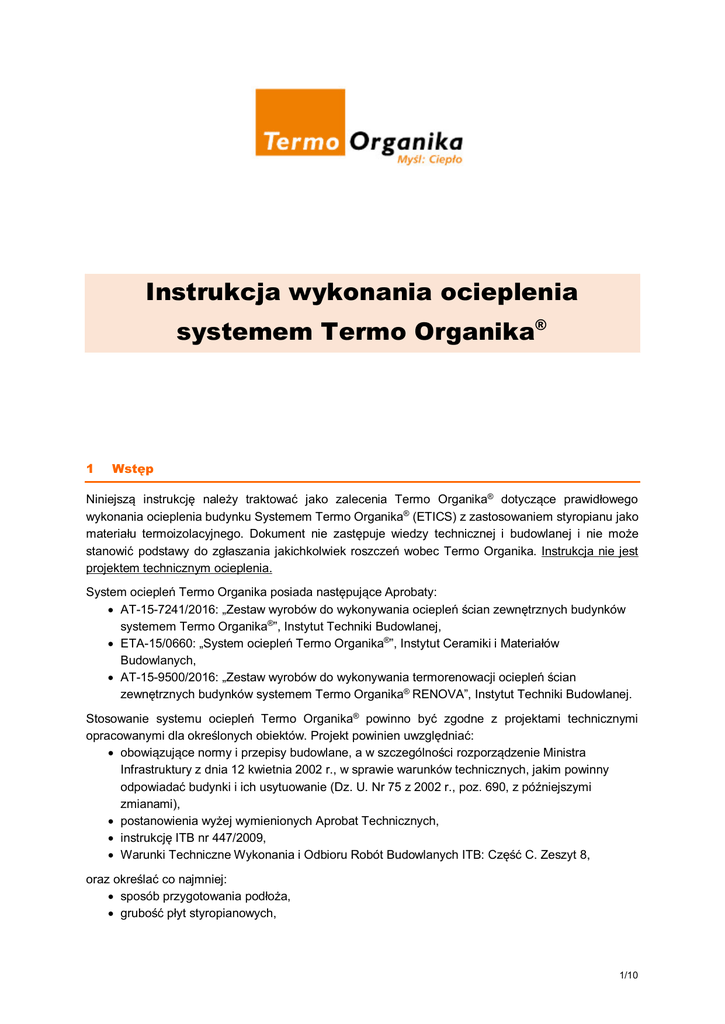 Instrukcja wykonania ocieplenia systemem Termo Organika® 1 Wstęp Niniejszą instrukcję należy traktować jako zalecenia Termo Organika® dotyczące prawidłowego wykonania ocieplenia budynku Systemem Termo Organika® (ETICS) z zastosowaniem styropianu jako materiału termoizolacyjnego. Dokument nie zastępuje wiedzy technicznej i budowlanej i nie może stanowić podstawy do zgłaszania jakichkolwiek roszczeń wobec Termo Organika. Instrukcja nie jest projektem technicznym ocieplenia. System ociepleń Termo Organika posiada następujące Aprobaty: AT-15-7241/2016: „Zestaw wyrobów do wykonywania ociepleń ścian zewnętrznych budynków systemem Termo Organika®”, Instytut Techniki Budowlanej, ETA-15/0660: „System ociepleń Termo Organika®”, Instytut Ceramiki i Materiałów Budowlanych, AT-15-9500/2016: „Zestaw wyrobów do wykonywania termorenowacji ociepleń ścian zewnętrznych budynków systemem Termo Organika® RENOVA”, Instytut Techniki Budowlanej. Stosowanie systemu ociepleń Termo Organika® powinno być zgodne z projektami technicznymi opracowanymi dla określonych obiektów. Projekt powinien uwzględniać: obowiązujące normy i przepisy budowlane, a w szczególności rozporządzenie Ministra Infrastruktury z dnia 12 kwietnia 2002 r., w sprawie warunków technicznych, jakim powinny odpowiadać budynki i ich usytuowanie (Dz. U. Nr 75 z 2002 r., poz. 690, z późniejszymi zmianami), postanowienia wyżej wymienionych Aprobat Technicznych, instrukcję ITB nr 447/2009, Warunki Techniczne Wykonania i Odbioru Robót Budowlanych ITB: Część C. Zeszyt 8, oraz określać co najmniej: sposób przygotowania podłoża, grubość płyt styropianowych, 1/10 rodzaj, ilość i rozmieszczenie łączników mechanicznych (jeżeli są stosowane), sposób obróbki miejsc szczególnych elewacji (ościeży okiennych i drzwiowych, balkonów, cokołów, dylatacji i in.). 2 Rozpoczęcie robót Rozpoczęcie robót ociepleniowych może nastąpić, gdy: zostaną zakończone i odebrane roboty dachowe, demontaż i montaż drzwi i okien, izolacje i podłoża pod posadzki balkonów lub tarasów, zostaną odpowiednio zabezpieczone i osłonięte wszelkie nieprzeznaczone do ostatecznego przykrycia powierzchnie (szkło, elementy drewniane, metalowe, podokienniki, okładziny kamienne, glazura, terakota, itp.), wyschną widoczne zawilgocenia podłoża, zostaną wykonane odpowiednie obróbki na powierzchniach poziomych murów, attyk, gzymsów zapewniające odpływ wody opadowej poza lico ocieplanej elewacji, zostanie określony sposób zakończenia ocieplenia i jego połączenia z innymi elementami budynku, zostaną rozmieszczone i wykonane przejścia instalacji lub innych elementów przez ocieplane płaszczyzny w sposób zapewniający ich trwałość i szczelność. 3 Bezpieczeństwo i warunki użytkowania Szczegółowe informacje dotyczące bezpiecznego użytkowania poszczególnych elementów systemu znajdują się na opakowaniach. Niedopuszczalne jest wykonywanie robót ociepleniowych, gdy temperatura otoczenia i podłoża jest niższa niż +5°C lub wyższa niż +30°C oraz gdy prognoza na najbliższe 24 godziny przewiduje podobne temperatury. W trakcie prac ociepleniowych należy stosować elewacyjne siatki osłonowe w celu zabezpieczenia elewacji przed bezpośrednim działaniem warunków atmosferycznych (nasłonecznienie, opady, wiatr). Poszczególnych wyrobów składających się na System ociepleń Termo Organika® nie wolno mieszać z innymi zaprawami, piaskiem, cementem, itp. 4 Budowa systemu System ociepleń Termo Organika® składa się z następujących komponentów: Kleje do styropianu Klej poliuretanowy Termo Organika® TO-KPS Klej do styropianu Termo Organika® TO-KS Kleje do zatapiania siatki Klej uniwersalny do styropianu i zatapiania siatki Termo Organika® TO-KU Biały klej uniwersalny do styropianu i zatapiania siatki Termo Organika® TO-KUB Tynki Tynk silikonowy Gold Termo Organika® TO-TSG Tynk silikonowy Silver Termo Organika® TO-TSS Tynk silikonowo-akrylowy (siloksanowy) Termo Organika® TO-TSA Tynk silikonowo-silikatowy Termo Organika® TO-TSISI 2/10 Tynk polikrzemianowy Termo Organika® TO-TP Tynk akrylowy Termo Organika® TO-TA Tynk mineralno-polimerowy Termo Organika® TO-TM Tynk mozaikowy (dekoracyjny) Termo Organika® TO-TD Tynki do aplikacji mechanicznej Tynk silikonowy Gold Termo Organika® TO-TSGm do aplikacji mechanicznej Tynk silikonowy Silver Termo Organika® TO-TSSm do aplikacji mechanicznej Tynk silikonowo-akrylowy (siloksanowy) Termo Organika® TO-TSAm do aplikacji mechanicznej Tynk silikonowo-silikatowy Termo Organika® TO-TSISIm do aplikacji mechanicznej Tynk polikrzemianowy Termo Organika® TO-TPm do aplikacji mechanicznej Tynk akrylowy Termo Organika® TO-TAm do aplikacji mechanicznej Farby Farba silikonowa Gold Termo Organika® TO-FSG Farba silikonowa Silver Termo Organika® TO-FSS Farba silikonowo-akrylowa (siloksanowa) Termo Organika® TO-FSA Farba silikonowo-silikatowa Termo Organika® TO-FSISI Farba polikrzemianowa Termo Organika® TO-FP Farba akrylowa Termo Organika® TO-FA Grunty Grunt uniwersalny Termo Organika® TO-GU Grunt sczepny Termo Organika® TO-GS Grunt polikrzemianowy Termo Organika® TO-GP Materiał do izolacji cieplnej TERMONIUM PLUS fasada TERMONIUM fasada GALAXY fasada GOLD fasada SILVER fasada DALMATYŃCZYK PLUS fasada DALMATYŃCZYK fasada inny wg normy EN-13163 Materiały uzupełniające i akcesoria 5 Siatka Termo Organika® TO-S170 Siatka Termo Organika® TO-S145 Łączniki mechaniczne objęte EOT zgodnie z ETAG014 Piana poliuretanowa Etapy wykonania ocieplenia 5.1 Przygotowanie podłoża Zanim rozpocznie się przyklejanie styropianu należy odpowiednio przygotować podłoże, do którego będzie on przyklejany. Każde podłoże musi być zwarte, równe, nośne, suche, czyste i bez warstw zmniejszających przyczepność (tłuszcz, pył, kurz, itp.). Stare, „luźne” tynki, złuszczające się farby i inne zabrudzenia należy usuną