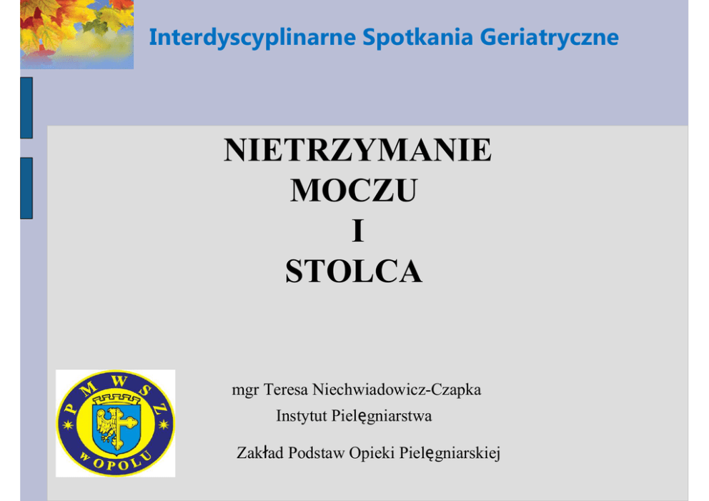 Interdyscyplinarne Spotkania Geriatryczne NIETRZYMANIE MOCZU I STOLCA mgr Teresa Niechwiadowicz-Czapka Instytut Pielęgniarstwa Zakład Podstaw Opieki Pielęgniarskiej Nietrzymanie moczu Wielki Problem Geriatryczny Zdolność utrzymywania moczu w pęcherzu zależy od: • • • • • prawidłowej czynności dolnego odcinka układu moczowego, sprawnego umysłu, możliwości poruszania się odpowiedniej motywacji zręczności manualnej. W miarę ę starzenia w dolnym odcinku ukłładu moczowego nastę ępują ą zmiany: • zmniejsza się ę pojemność ść pę ęcherza • pojawia się ę konieczność ść niezwłłocznego oddania moczu • zmniejsza się ę szybkość ść wypłływu moczu • pojawiają ą się ę skurcze ściany pę ęcherza Nietrzymanie moczu (inkontynencja) wg Międzynarodowego Stowarzyszenia ds. Kontynencji -ISC to mimowolna utrata moczu stwierdzana obiektywnie jako problem higieniczny i społeczny. NTM - choroba społłeczna • Choroba społłeczna -schorzenie przewlekłe, szeroko rozpowszechnione w społeczności, które ogranicza możliwość wykonywania podstawowych zadań życiowych, wymaga długiej i regularnej opieki lekarskiej, jest trudno wyleczalne, stanowi problem dla społeczeństwa. • Na NTM cierpi 10-15% każ żdego społłeczeń ństwa • • • • Cukrzyca – 8% kobiet Depresja --20% Nadciśnienie- 25% NTM - 35% NTM – problem psychiczny Dezorganizacja życia i pogorszenie jego jakości z powodu: • • • • • • wstydu bezradności obniżenia poczucia własnej wartości poczucia niepełnej wartości społecznej izolacji społecznej depresji • Dotyczy także rodziny i opiekunów. NTM – problem ekonomiczny Największe wydatki na: • • • opiekę leczenie powikłań (infekcje moczowe, zakażenia i podrażnienia skóry) stosowanie produktów wchłaniających Koszty leczenia przyczynowego (leki, operacje) = 10-letniemu używaniu produktów wchłaniających ! NTM jest następstwem nakładania się różnych chorób lub stanów na fizjologiczne zmiany inwolucyjne w obrębie układu moczowego, w związku z tym może mieć charakter: • przejściowy • utrwalony Przejś ściowe NTM Pojawia się pod wpływem zadziałania dodatkowego czynnika, którego eliminacja przywraca stan wyjściowy. Może ewoluować w utrwalone NTM jeżeli przyczyna pozostaje nieleczona. Nie można jednak rozpoznawać utrwalonego NTM tylko w oparciu o długotrwałość procesu. Odwracalne przyczyny przejś ściowego NTM D - delirium I - infekcje dróg moczowych A - troficzne zapalenie cewki moczowej i pochwy L - leki Z - zaburzenia psychiczne, zwłaszcza depresje N - nadmierna objętość wydalanego moczu (niewydolność krążenia,hiperglikemia) O - ograniczenie ruchów K - kałowe zatkanie Utrwalone NTM przyczyny neurologiczne pozaneurologiczne: nowotwory, kamica. choroby cewki moczowej, adenomectomia, stresowe NTM, osłabienie mięśni dna miednicy (u kobiet). Utrwalone nietrzymanie moczu – nadpobudliwość lub obniżona aktywność mięśnia wypieracza oraz niewydolność lub niedrożność drogi odpływu moczu. Rodzaje NTM 1)wysiłkowe (WNM) – najczęstsze , występuje u 50-70% pacjentów 2)naglące NTM- objawia się mimowolnym gubieniem moczu poprzedzonym uczuciem nagłego parcia na mocz , u 20-40% pacjentów 3)mieszane NTM - połączenie dwóch w/w rodzajów 4)moczenie nocne – wyciek moczu podczas snu 5)odruchowe - okresowe niekontrolowane skurcze mięśnia wypieracza i nieświadome oddawanie moczu. WNTM Wysiłkowe nietrzymanie moczu występuje wtedy, kiedy mięśnie miednicy nie są w stanie w odpowiedni sposób uciskać cewki moczowej. Wtedy najmniejszy wysiłek, taki jak kaszel czy kichnięcie powoduje popuszczanie moczu. Zmusza to pacjentki do stałego noszenia podpasek, a wraz z rozwojem schorzenia, nawet pieluch. 15-30 % kobiet ma problem z nietrzymaniem moczu Rozpoznanie i róż żnicowanie przyczyn NTM - badania laboratoryjne - badanie per rectum - badanie neurologiczne - badanie ginekologiczne - ocena urologiczna - badanie ultrasonograficzne - badanie urodynamiczne - cystografia. Nie można rozpoznawać utrwalonego NTM tylko w oparciu o długotrwałość procesu! Leczenie zachowawcze •leczenie infekcji dróg moczowych • estrogenoterapię u kobiet • adenektomię u mężczyzn • oczyszczenie rectum i regulację wypróżnień • obniżenie ciężaru ciała • leczenie kaszlu. Leczenie farmakologiczne Stosuje się głównie w nadreaktywności pęcherza. Poprzez stosowanie leków antycholinergicznych uzyskuje się: • zahamowanie czynności skurczowej pęcherza • zmniejszenie częstości oddawania moczu w dzień i w nocy • eliminuje parcia naglące i nietrzymanie moczu. Leczenie chirurgiczne Do zabiegów kwalifikowane są osoby prawie wyłącznie w przypadku wysiłkowego NTM : • z dużym nasileniem wysiłkowego NTM • chorzy, u których zawiodło leczenie zachowawcze • mężczyźni z wysiłkowym NTM ( w następstwie uszkodzenia zwieracza zewnętrznego cewki moczowej po operacjach w obrębie miednicy mniejszej , po zabiegach usunięcia gruczołu krokowego. Wykonuje się zabiegi przezpochwowe z użyciem taśm syntetycznych , których zadaniem jest podpieranie środkowej części cewki moczowej. Ćwiczenia prowadzone przez fizjoterapeutę ę Ćwiczenia mięś ęśni ęś Kegla • wzmocnienie mięśnia łonowo-guzicznego • nauka kontrolowania i wzmocniania mięśni dna miednicy. Ćwiczenia polegają na zaciskaniu mięśni pochwy i odbytu na ok. 8-10 sekund. Należy je powtarzać w krótkich odstępach czasu przez co najmniej 20 minut. Systematyczne stosowanie ćwiczeń ń powoduje wzmocnienie mięś ęśni, ększa ich ęś zwię elastyczność ść, ę ść co zapobiega opuszczaniu się narzą ądów i wysiłłkowemu nietrzymaniu moczu. Ćwiczenia mięś ęśni ęś Kegla • poprawiają postawę ciała • ogólną kondycję ciała • jakość życia, w tym życia seksualnego Metoda biofeedbak wykorzystuje się aparatur